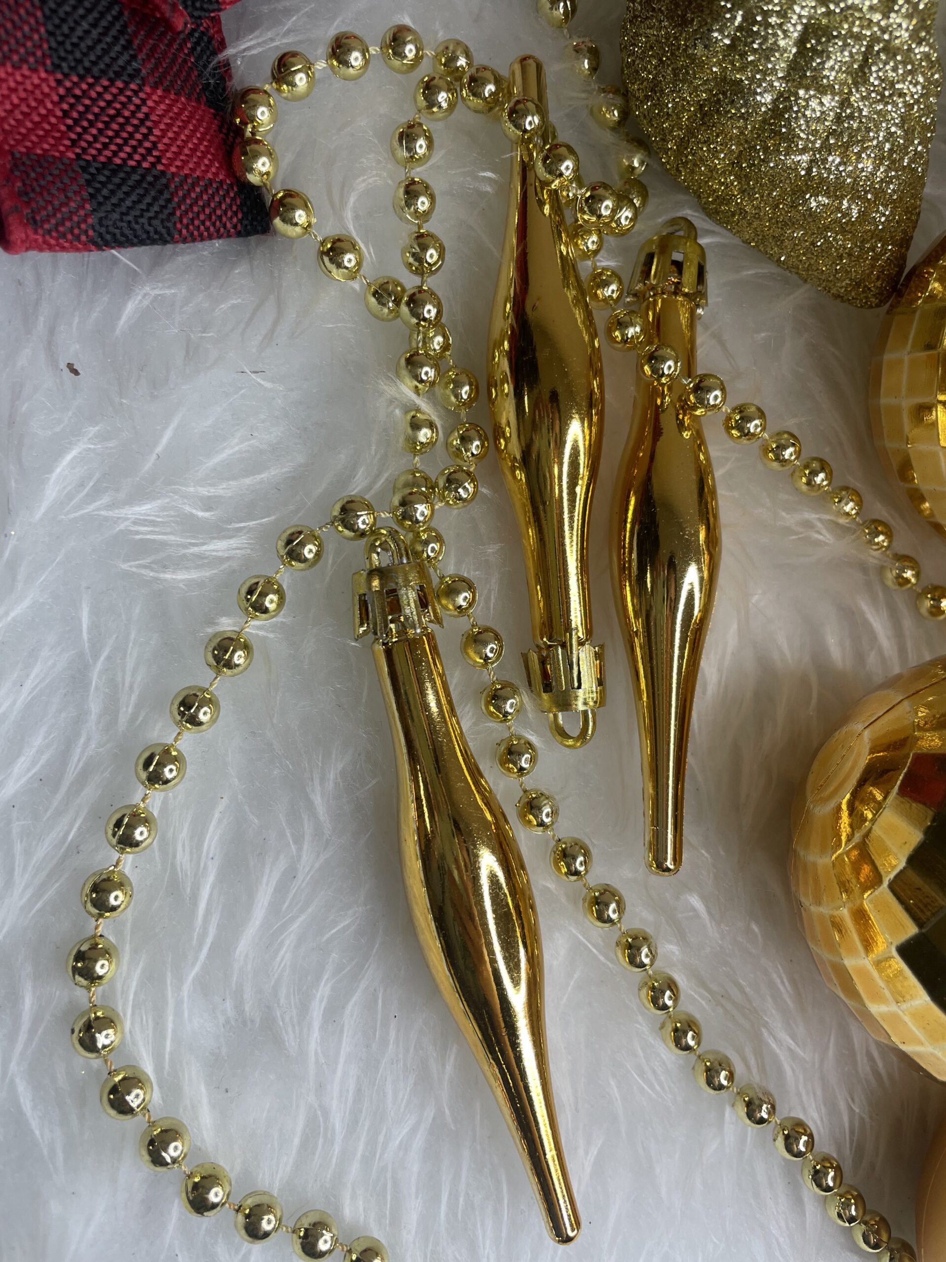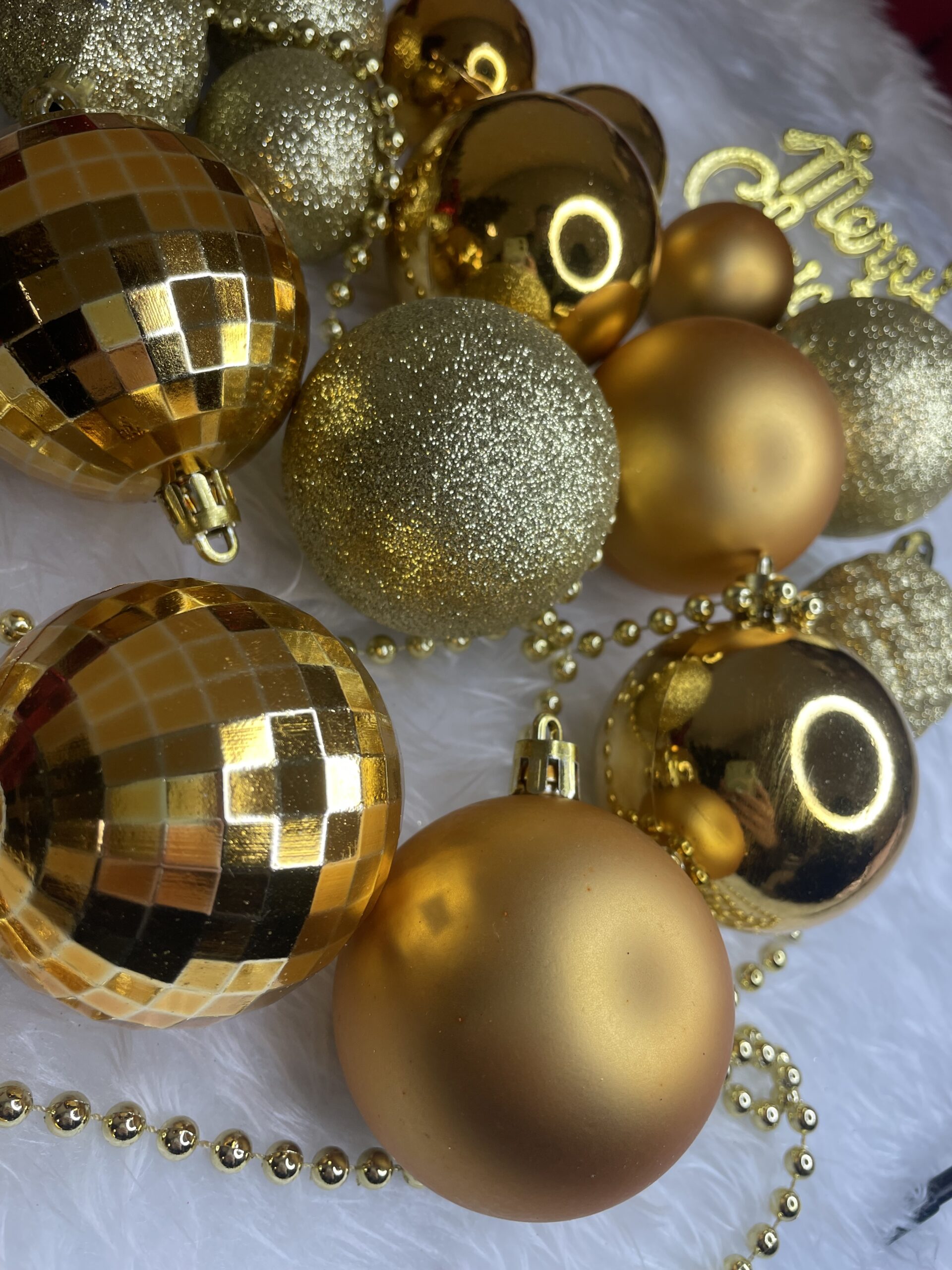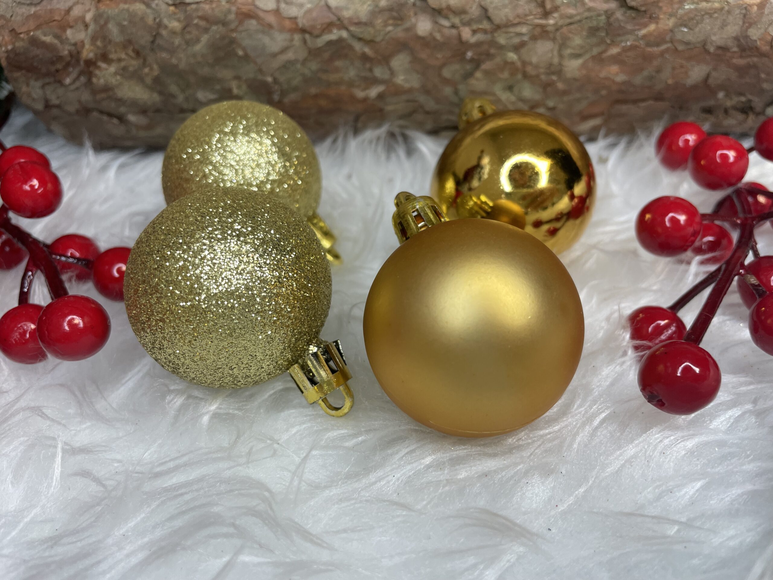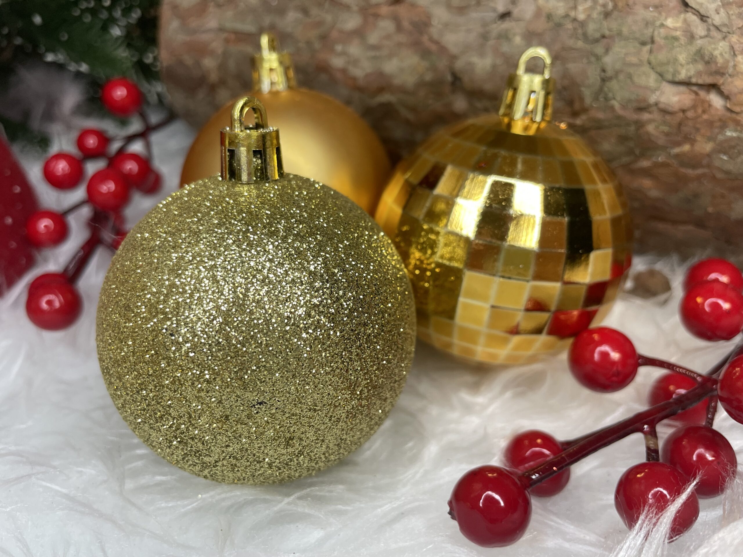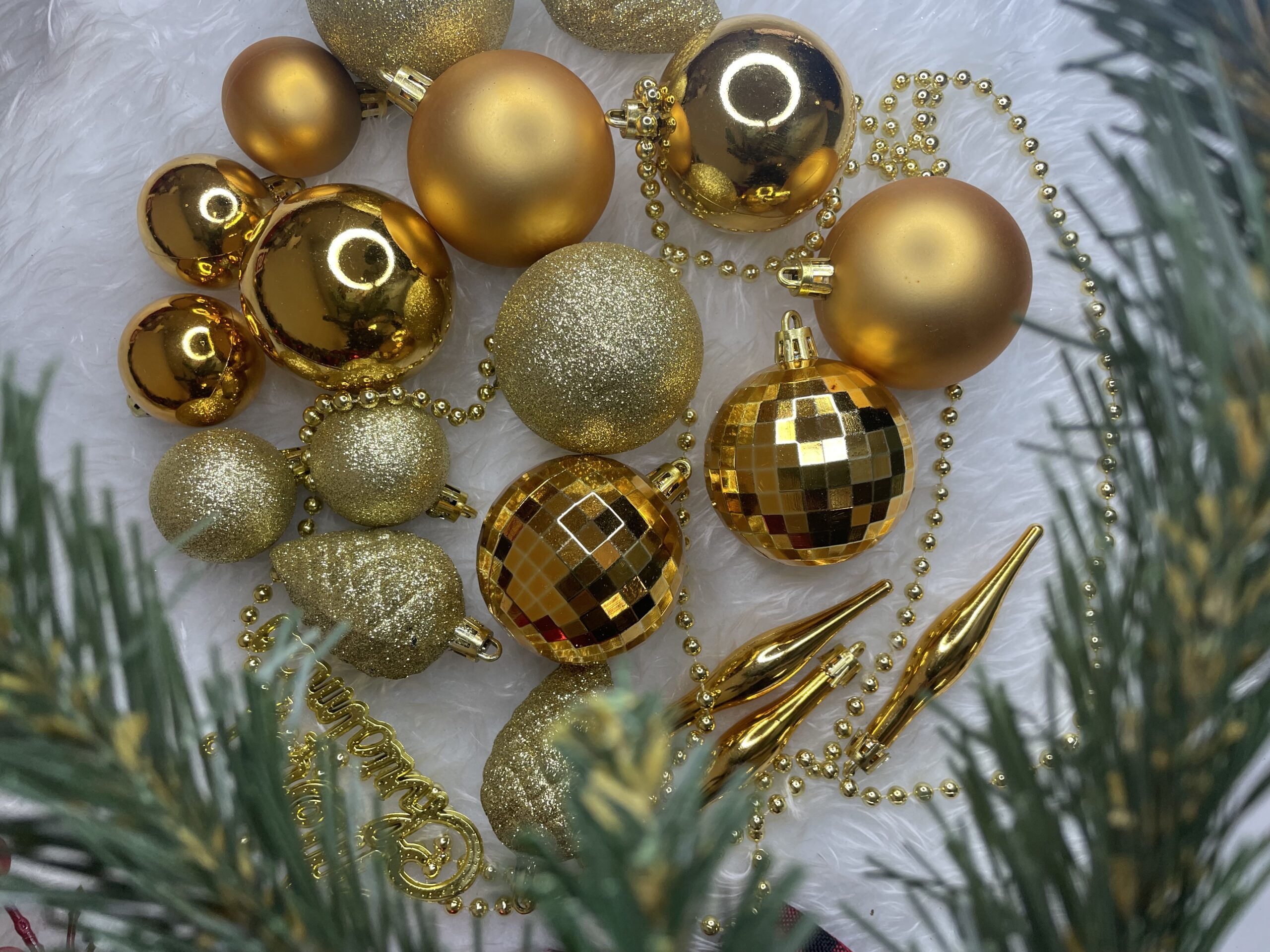 Culoare: auriu Material: plastic Cantitate: 51 bucati globuri (+/- 1 bucata), 1 stea, 1 lant de margele, 3 decoratiuni Craciun fericit Modele: stralucitor, mat, lucios, disco Diametru: diverse marimi Globurile si decoratiunile dintr-un set cu o singura culoare va vor permite sa creati un decor minunat pentru brad. Arata frumos in timpul zilei si dupa intuneric, insotite de iluminat festiv. Setul include snururi care va permit sa agatati globurile rapid si usor in locul dorit. Designul din plastic creste siguranta datorita materialului incasabil. Alegerea lor in locul globurilor de sticla va contribui la siguranta celor mici din casa. Diversele dimensiuni va permit sa creati modele inedite de aranjare a bradului de Craciun. Setul include urmatoarele piese 4 x Glob rotund mic (sclipici) - 4 cm 4 x Glob rotundmic (lucios) - 4 cm 4 x Glob rotundmic (mat) - 4 cm 6 x Glob rotundmare (sclipici) - 6 cm 6 x Glob rotundmare (lucios) - 6 cm 6 x Glob rotundmare (mat) - 6 cm 6 x Glob rotundmare (minge disco) - 6 cm 6 x Glob con- 6 cm 6 x Glob ghetar ingust - 9 cm 3 x Decoratiune Craciun fericit - 4x10cm 1 x Varf in forma de stea- 20 cm 1 x lant de margele - 2 m Atentie! Numarul de piese din set poate varia + - 1 buc.