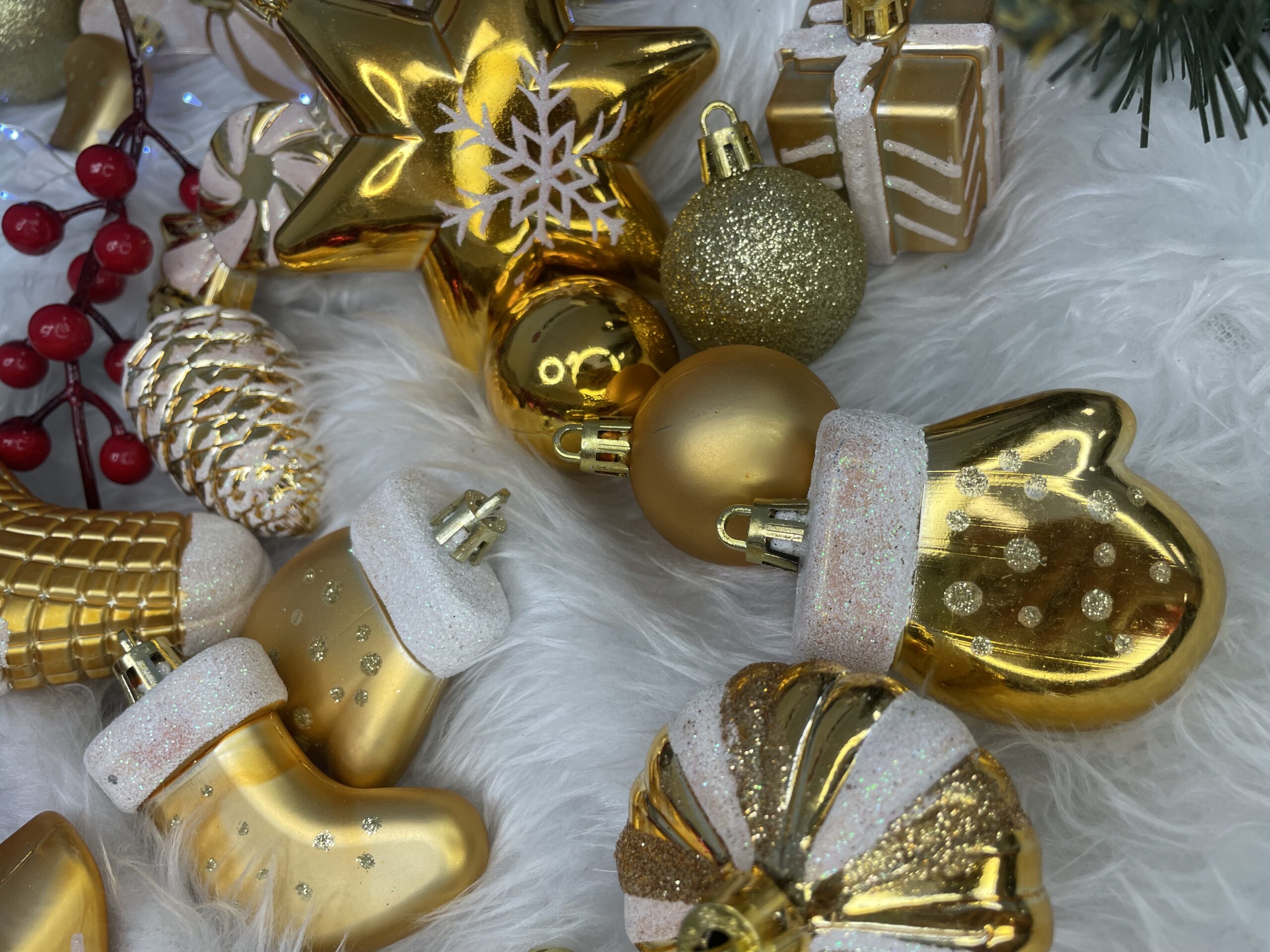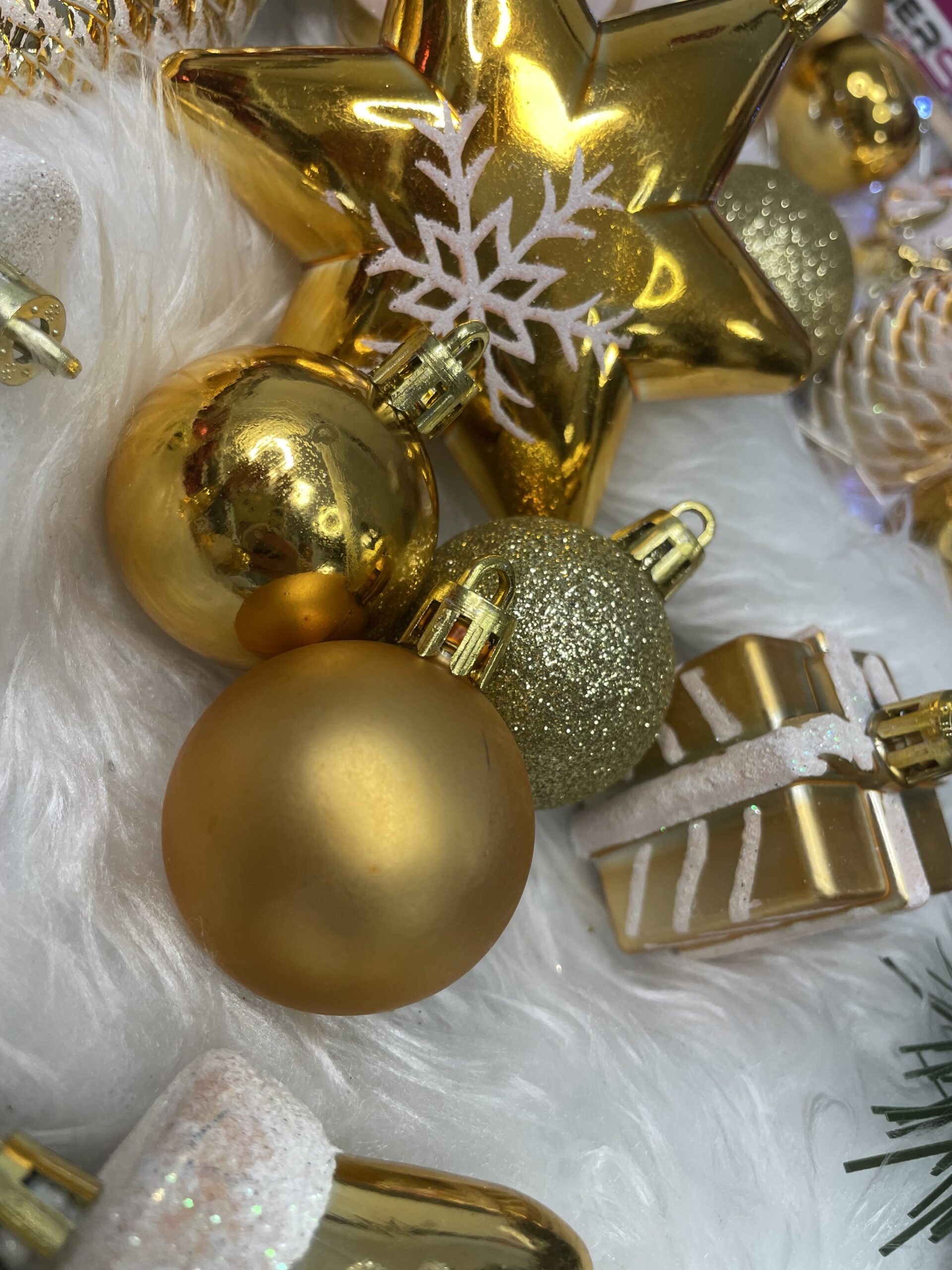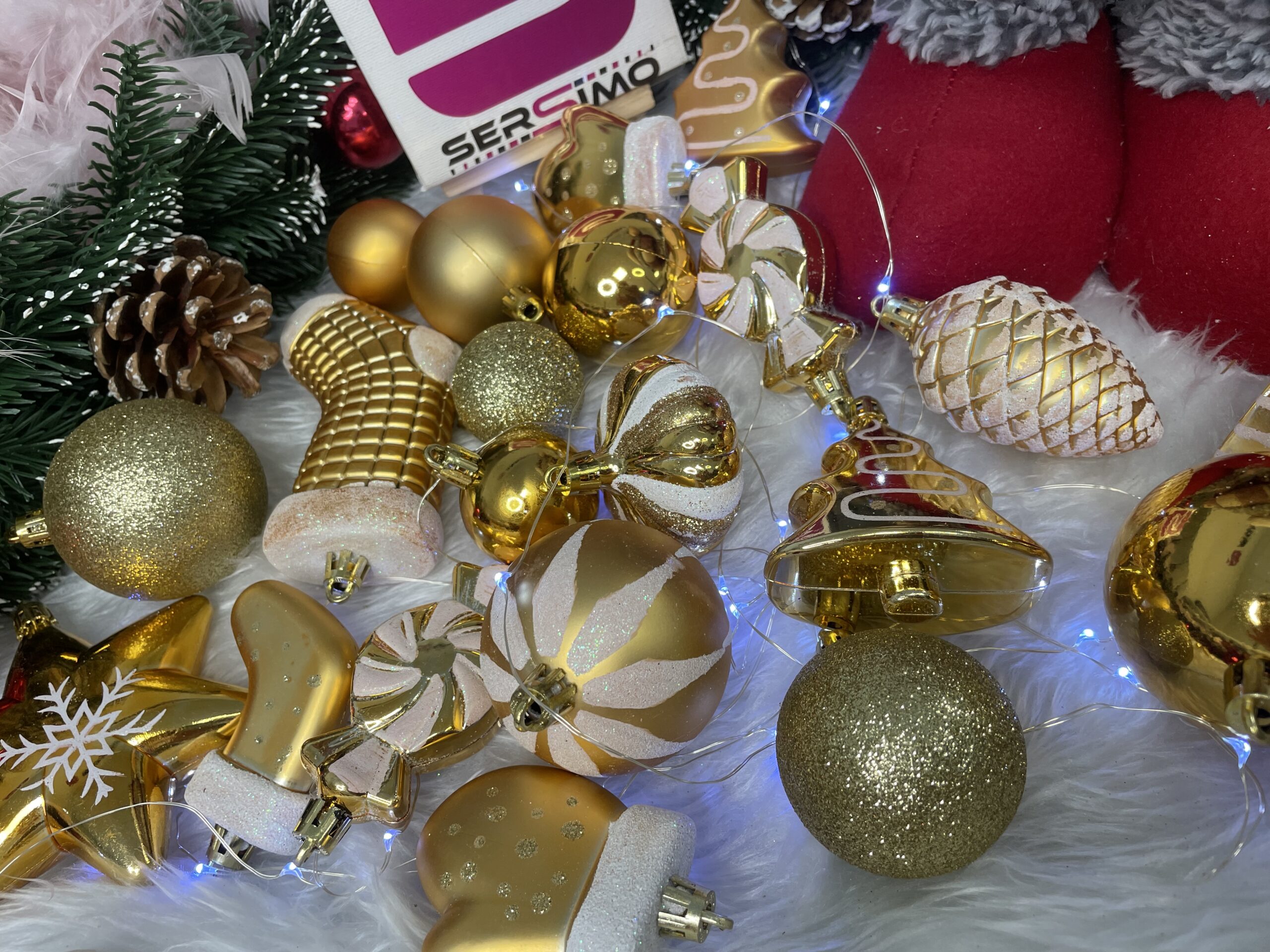 Globurile si decoratiunile dintr-un set cu o singura culoare va vor permite sa creati un decor minunat pentru brad. Arata frumos in timpul zilei si dupa intuneric, insotite de iluminat festiv. Setul include snururi care va permit sa agatati globurile rapid si usor in locul dorit. Designul din plastic creste siguranta datorita materialului incasabil. Alegerea lor in locul globurilor de sticla va contribui la siguranta celor mici din casa. Diversele dimensiuni va permit sa creati modele inedite de aranjare a bradului de Craciun. Culoare: auriu Material: plastic Cantitate: 77 piese Modele: 21 modele diferite incluse in set Diametru: diverse marimi Setul include urmatoarele piese Con de pin 6x - 6,5 cm Bomboane 6x - 7,5 cm Con scurt 4x - 5 cm Steaua 2x - 10 cm Perla rotunda, mare 4x - 6 cm Rotund, mare, din brocart 4x - 6 cm Rotund mare cu decoratiuni albe 4x - 6 cm Rotund mediu mat 4x - 5 cm Brocart rotund mediu 4x - 5 cm Rotund mic lucios 4x - 5 cm Rotund, mic, mat 4x - 4 cm Sclipici mic rotund 4x - 4 cm Rotund mic lucios 4x - 4 cm Brad de Craciun mat 3x - 7 cm Pom de Craciun lucios 3x - 7 cm Cadou mat 3x - 4,5 cm Cadou lucios 3x - 4,5 cm 2x - 6 cm manusa mata Manusa lucioasa 2x - 6 cm Sosete mare 4x - 10,5 cm Soseta mica 3x - 7 cm Atentie! Numarul de piese din set poate varia + - 1 buc.