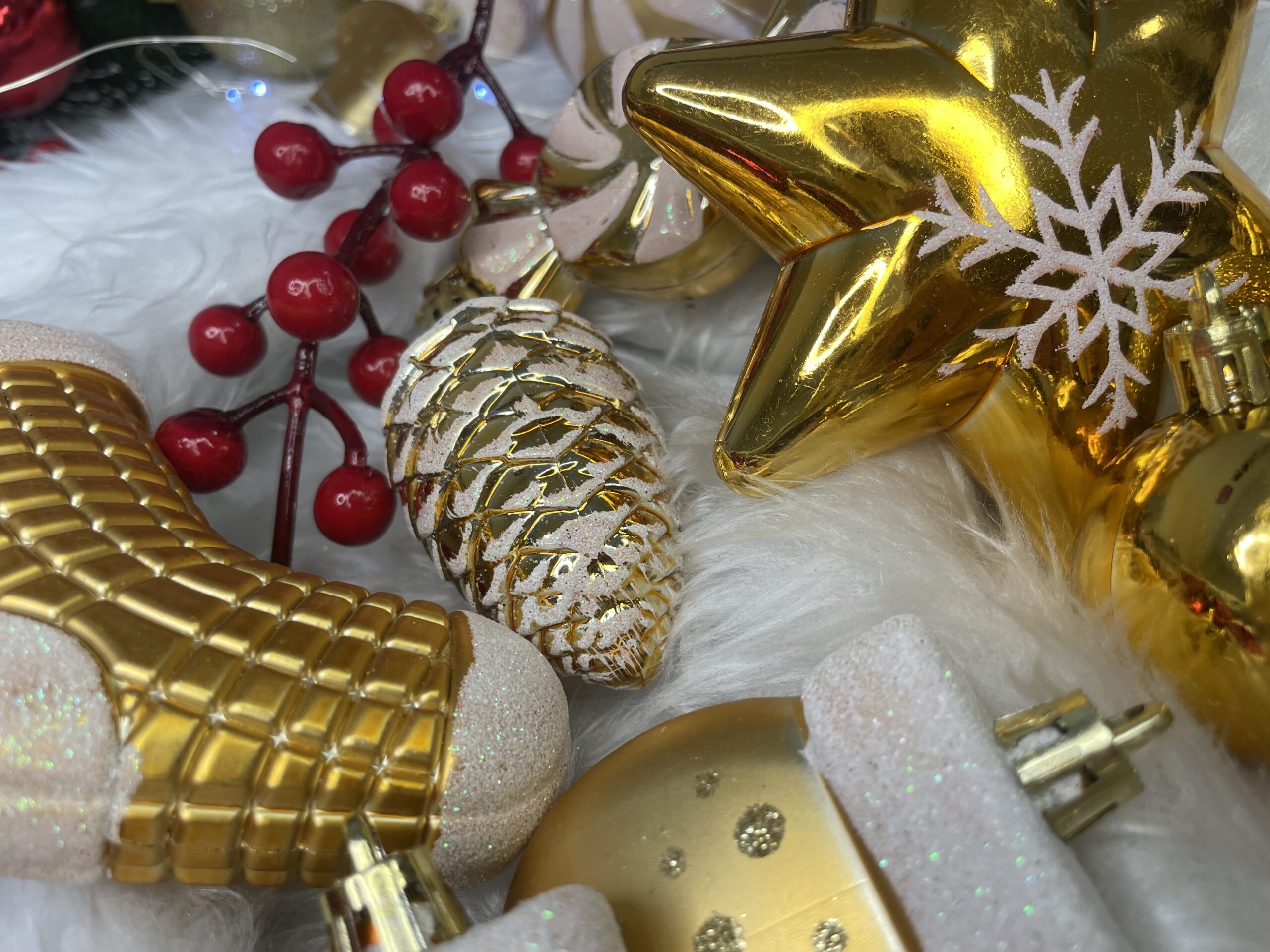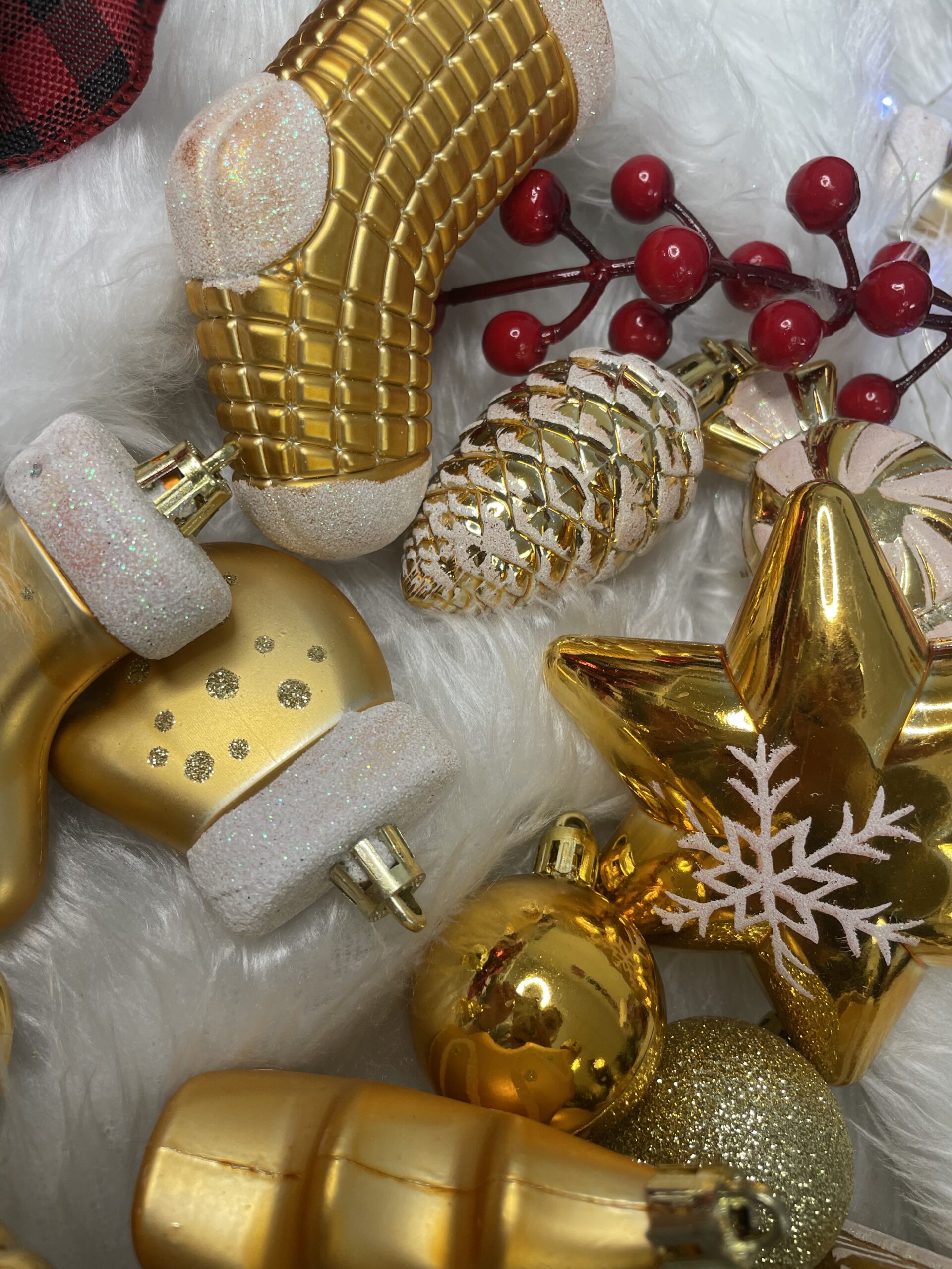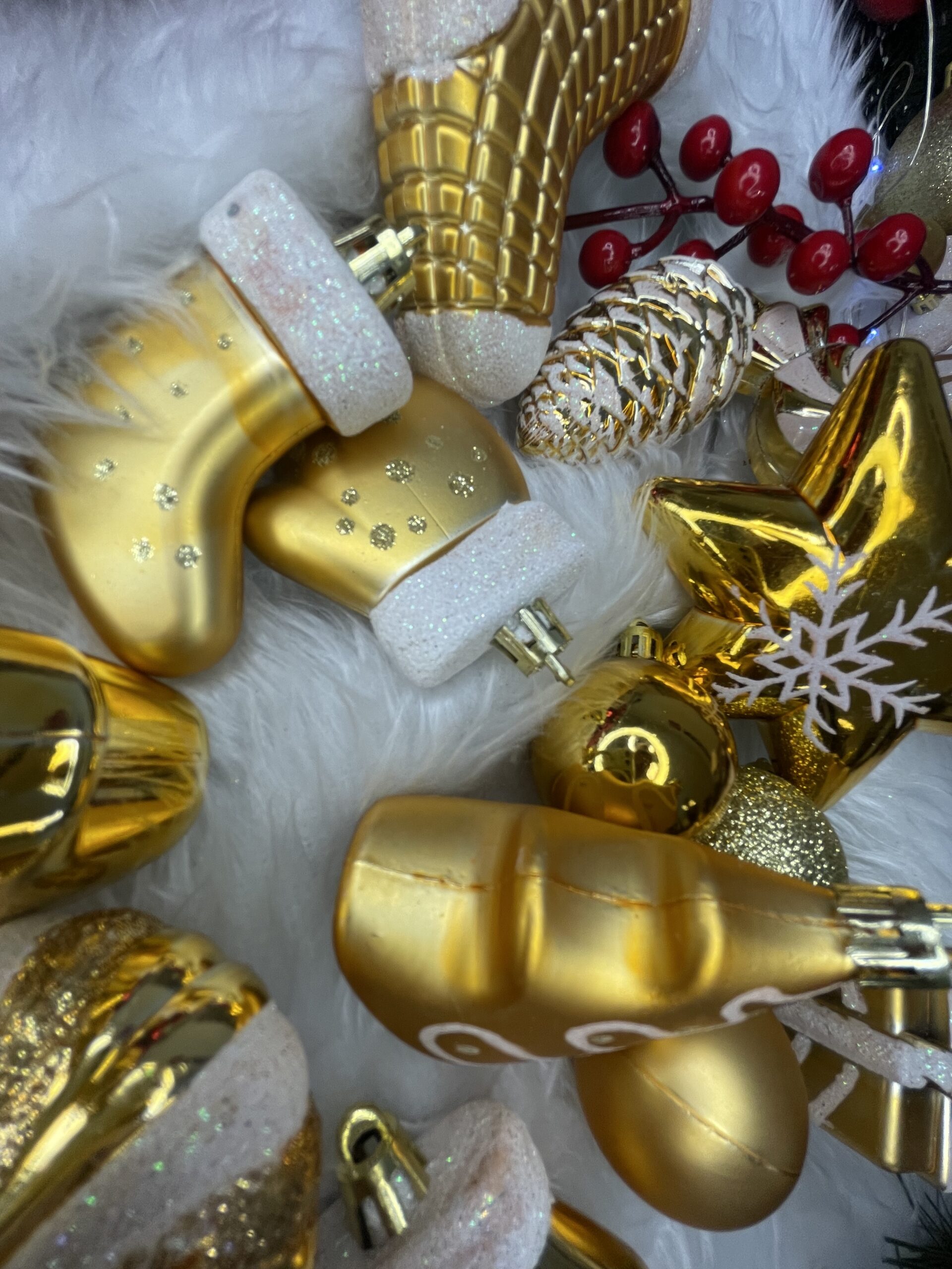 Globurile si decoratiunile dintr-un set cu o singura culoare va vor permite sa creati un decor minunat pentru brad. Arata frumos in timpul zilei si dupa intuneric, insotite de iluminat festiv. Setul include snururi care va permit sa agatati globurile rapid si usor in locul dorit. Designul din plastic creste siguranta datorita materialului incasabil. Alegerea lor in locul globurilor de sticla va contribui la siguranta celor mici din casa. Diversele dimensiuni va permit sa creati modele inedite de aranjare a bradului de Craciun. Culoare: auriu Material: plastic Cantitate: 77 piese Modele: 21 modele diferite incluse in set Diametru: diverse marimi Setul include urmatoarele piese Con de pin 6x - 6,5 cm Bomboane 6x - 7,5 cm Con scurt 4x - 5 cm Steaua 2x - 10 cm Perla rotunda, mare 4x - 6 cm Rotund, mare, din brocart 4x - 6 cm Rotund mare cu decoratiuni albe 4x - 6 cm Rotund mediu mat 4x - 5 cm Brocart rotund mediu 4x - 5 cm Rotund mic lucios 4x - 5 cm Rotund, mic, mat 4x - 4 cm Sclipici mic rotund 4x - 4 cm Rotund mic lucios 4x - 4 cm Brad de Craciun mat 3x - 7 cm Pom de Craciun lucios 3x - 7 cm Cadou mat 3x - 4,5 cm Cadou lucios 3x - 4,5 cm 2x - 6 cm manusa mata Manusa lucioasa 2x - 6 cm Sosete mare 4x - 10,5 cm Soseta mica 3x - 7 cm Atentie! Numarul de piese din set poate varia + - 1 buc.