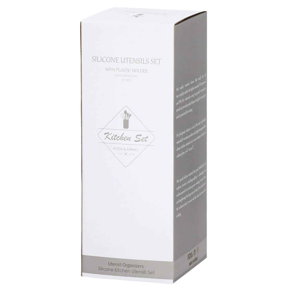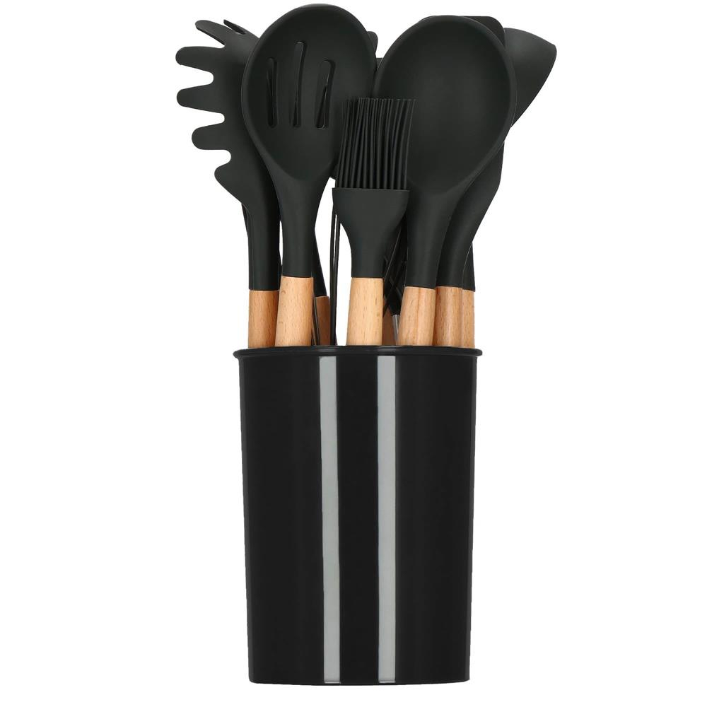 Toate capetele ustensilelor sunt fabricate din silicon durabil, moale si flexibil, care rezista la temperaturi ridicate de pana la 230°C, prevenind astfel topirea ustensilelor.Manerul din lemn natural este neted si confortabil la atingere si spre deosebire de alte materiale, previne transferul de caldura in timpul procesului de gatire, protejandu-va astfel mainile.Setul include un suport pentru ustensile care ajuta la organizarea si depozitarea acestora. Astfel, ustensilele pot fi pastrate la indemana, pe blatul din bucatarie.Fiecare maner din lemn este prevazut cu un orificiu ce permite agatarea ustensilelor intr-un suport cu carlige pe perete.  Setul contine:   	 Suport depozitare – inaltime 16,5 cm, diametru aprox 11 cm  	 Cleste – inaltime 25 cm, lungime maner 10 cm, latime maxima aprox 6 cm  	 Polonic – inaltime totala 32 cm, lungime maner 18,5 cm, adancime oala 4 cm  	 Lingura – inaltime totala 31,5 cm, lungime maner 18,5 cm, diametru  	 Lingura perforata – inaltime totala 32 cm, latimea lamei 8 cm, lungime maner 18,5 cm  	 Spatula fara gauri – inaltime totala 32 cm, latimea lamei 8 cm, lungime maner 18,5 cm  	 Spatula pentru prajituri – inaltime totala 31,5 cm, latime spatula 6,5 cm, lungime maner 18,5 cm  	 Spatula rotunjita pe o parte – inaltime totala 32 cm, lungime maner 18,5 cm  	 Lingura pentru paste – inaltime totala 31,5 cm, lungime maner 18,5 cm, latime strecuratoare 6 cm  	 Pensula pentru ungere – inaltime totala 27,5 cm, lungime maner 18,5 cm  	 Strecurator / skimmer – cu gauri, inaltime totala 31,5 cm, lungime maner 18,5 cm, latime lingura 7 cm  	 Tel – inaltime totala 28 cm, partea de prindere 12,5 cm, latimea grapperului 3,5 cm