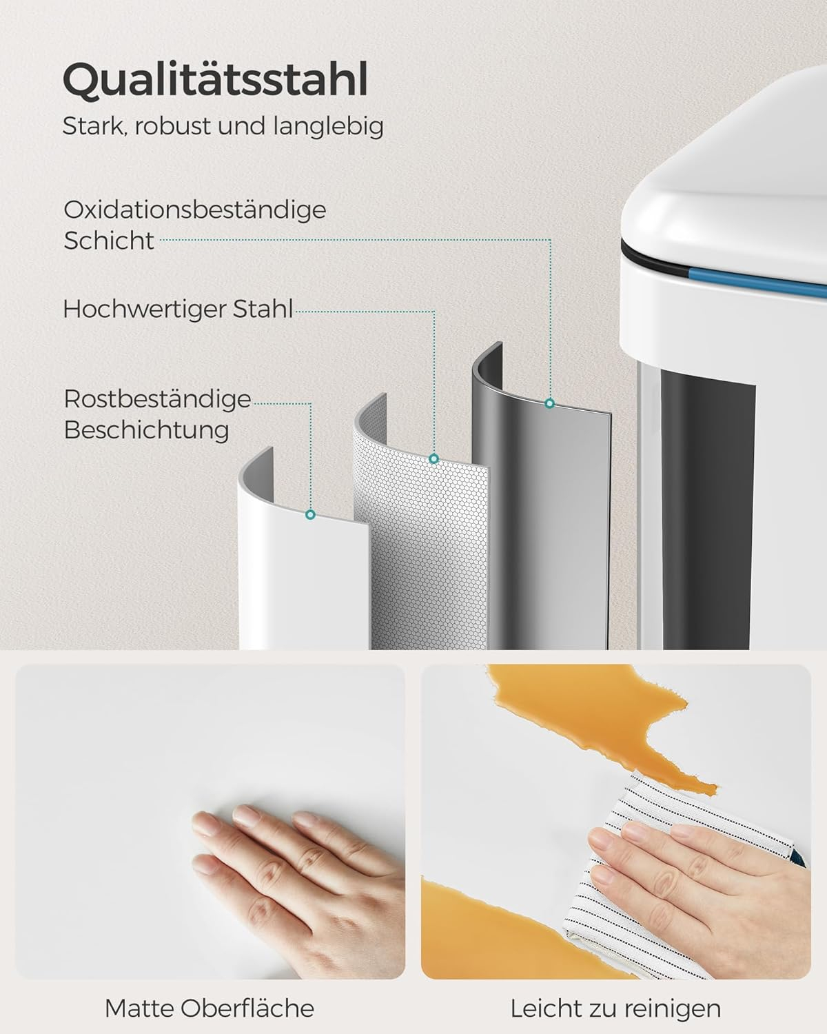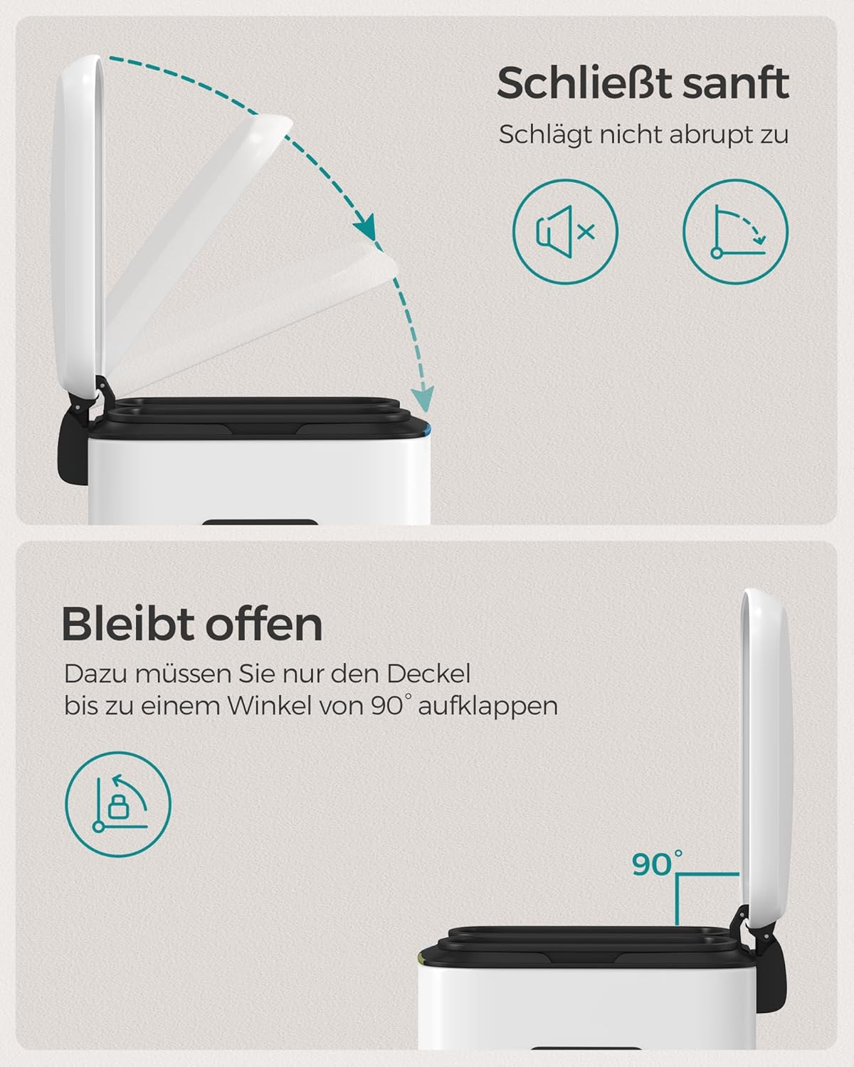 Detalii produs: Culoare: AlbDimensiuni: 44,5 x 36 x 60 cm (L x l x i)Cos interior: 19 x 28,5 x 50 cm (L x l x i)Inaltime totala (cu capacul deschis): 92 cmVolum: 2 x 20 litriGreutate: 7,1 kg Continutul cutiei: 1 x cos de gunoi Instructiuni SONGMICS: Va rugam sa stergeti produsul cu o carpa moale, umeda si sa folositi detergent usor daca este necesar. Cosul de gunoi din bucataria dvs. trebuie sa fie remarcabil! Cu o culoare alba eleganta si un profil simplu, acest cos de gunoi va imbunatati aspectul bucatariei dvs. Depozitare usoara Acest cos cu pedala este format din 2 compartimente in care puteti sorta gunoiul. Cel mai important lucru este ca totul se face fara a fi nevoie sa atingeti pubela Galeata practica Acest cos de gunoi contine 2 galeti cu gauri pe spate pentru a facilita schimbarea sacilor de gunoi. Daca sacii se rup din greseala sau se rastoarna, scoateti direct galetile si curatati-le cu usurinta Viata de zi cu zi practica Cu acest cos de gunoi soft-close, eliminarea deseurilor nu a fost niciodata atat de usoara! Pur si simplu apasati pedala si eliminati. Bucurati-va de o viata mai curata si mai sanatoasa Design atent In ciuda exteriorului sau metalic rigid, acest cos de colectare selectiva a deseurilor este delicat: mecanismul de inchidere permite capacului sa se inchida usor, incet si silentios