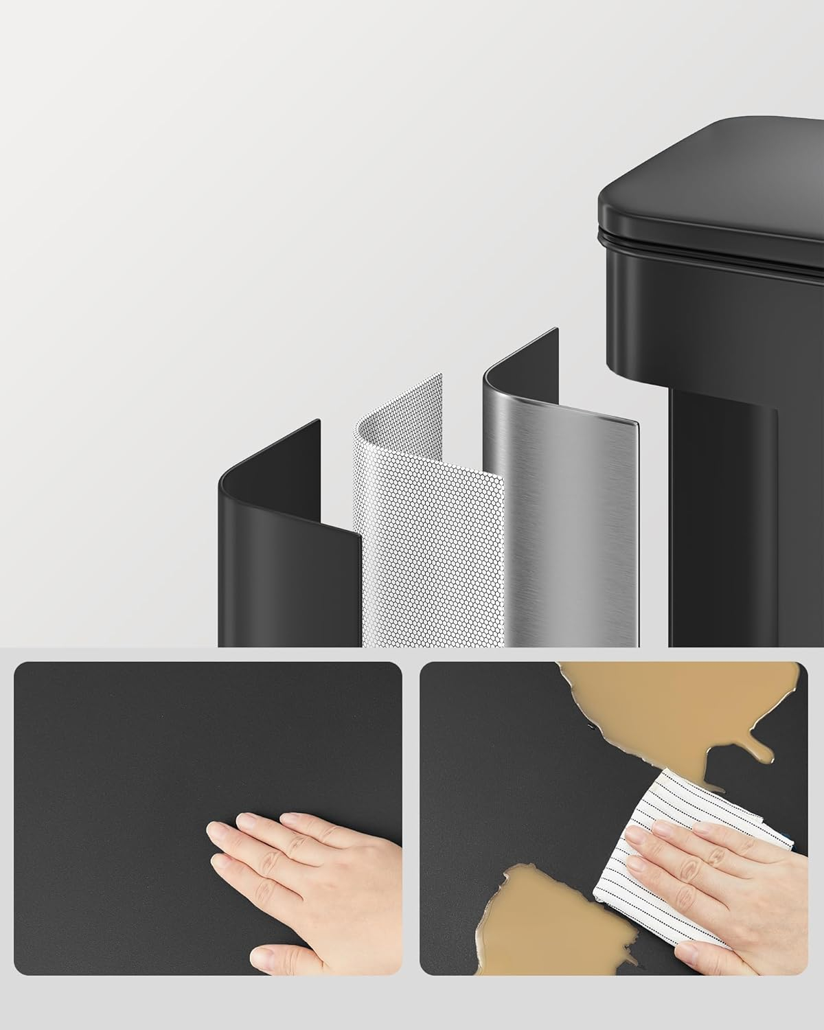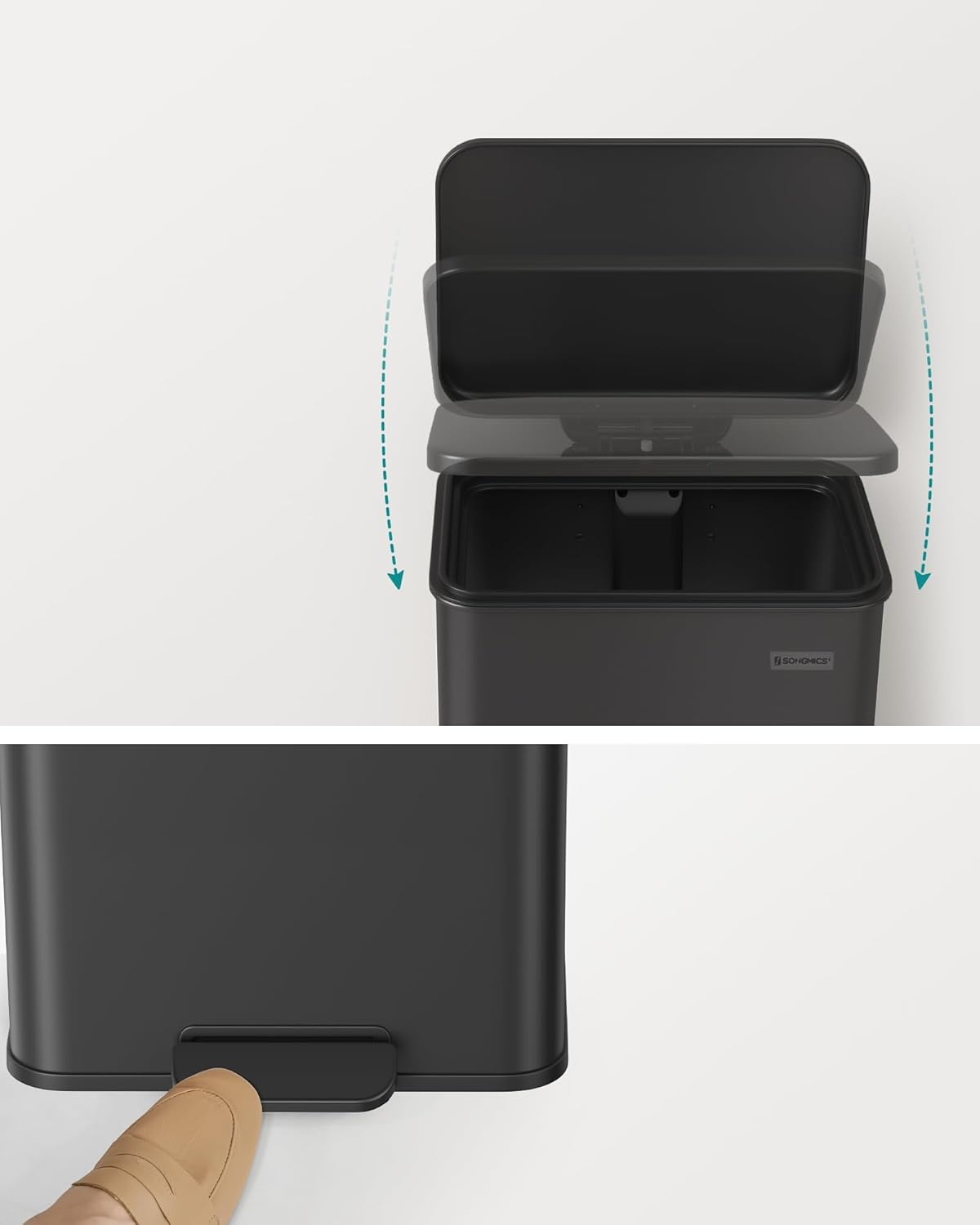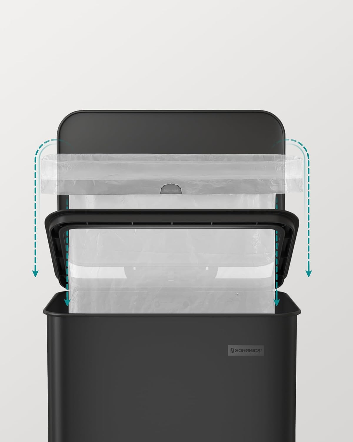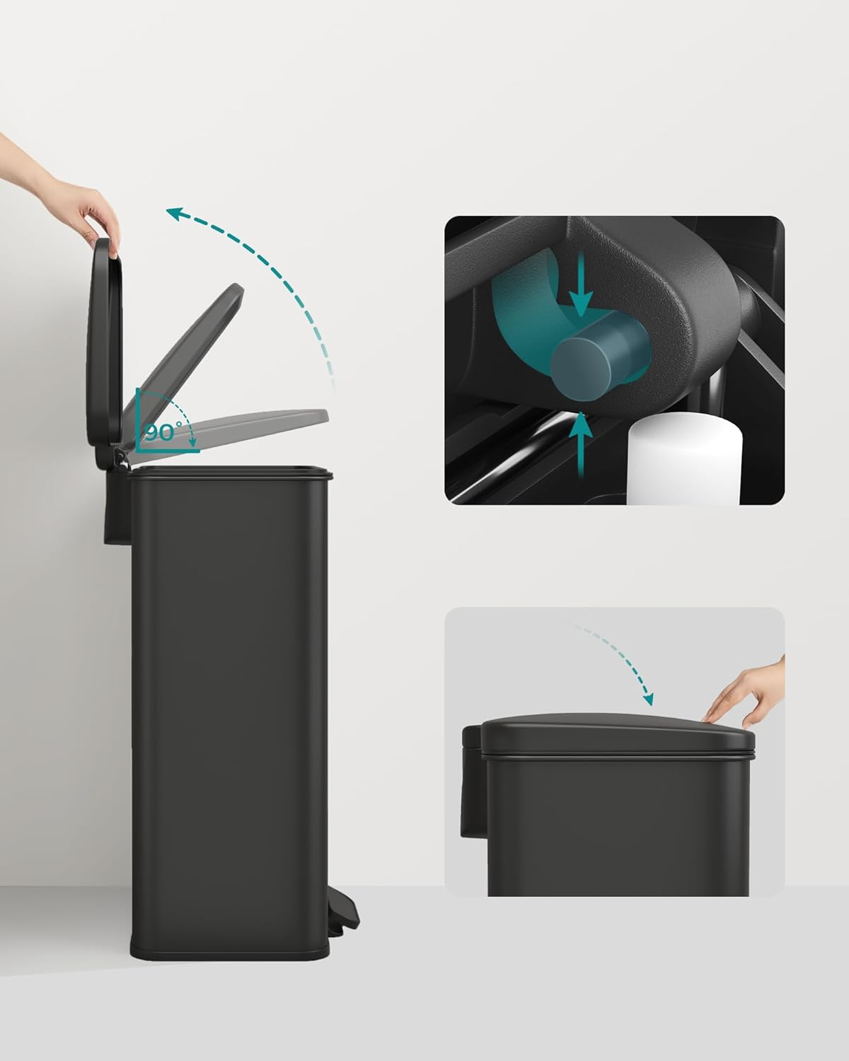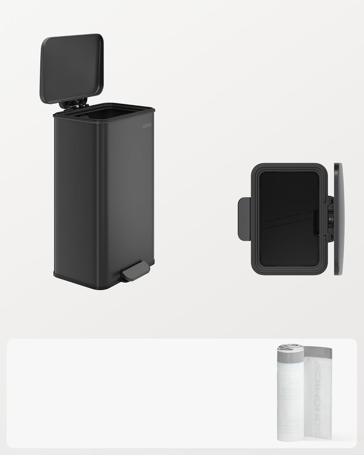 Descrierea produsului Culoare: negru.Material: OtelDimensiuni: 34,8 x 32 x 55,5 cm (L x l x i).Inaltime totala (cu capacul deschis): 83,5 cm.Capacitate: 40 litri.Greutate: 3,3 kg. Pachetul include: 1 x cos de gunoi cu capac15 x Saci de gunoi Cateva recomandari din partea SONGMICS Cosul de gunoi este potrivit doar pentru utilizare in interior.Pentru a curata cosul de gunoi de bucatarie, va rugam sa-l stergeti cu o carpa moale si umeda si sa folositi produse de curatare blande daca este necesar.La utilizare, asezati cosul de gunoi astfel incat spatele acestuia sa fie la 5 cm de perete. Inchidere soft - Capacul pubelei se inchide incet, silentios si delicat. Nu se inchide brusc in timpul utilizarii. Acest cos de gunoi este un ajutor practic pentru eliminarea deseurilor. Otel premium - Fabricat din otel premium, cosul de gunoi de bucatarie de 40 de litri este rezistent la rugina. Pentru curatare, pur si simplu stergeti cu o carpa. Poate fi lasat deschis : Capacul cosului de gunoi de bucatarie poate fi tinut deschis in timpul activitatilor de gatit, deschizandu-l complet cu mana. Pentru a inchide capacul, pur si simplu pliati-l in jos cu mana. Inel de prindere a sacului de gunoi : Cosul de gunoi este echipat cu un inel de prindere. Astfel, sacul de gunoi ramane ferm in pozitie si nu este vizibil din exterior. In plus, pubela cu pedala nu are galeata interioara si astfel ofera cu 20% mai mult spatiu interior pentru deseuri. Include saci de gunoi - Furnizam 15 saci de gunoi SONGMICS pe masura (cod 050A) care se potrivesc perfect acestui cos de gunoi cu pedala, astfel incat acesta sa fie imediat gata de utilizare.