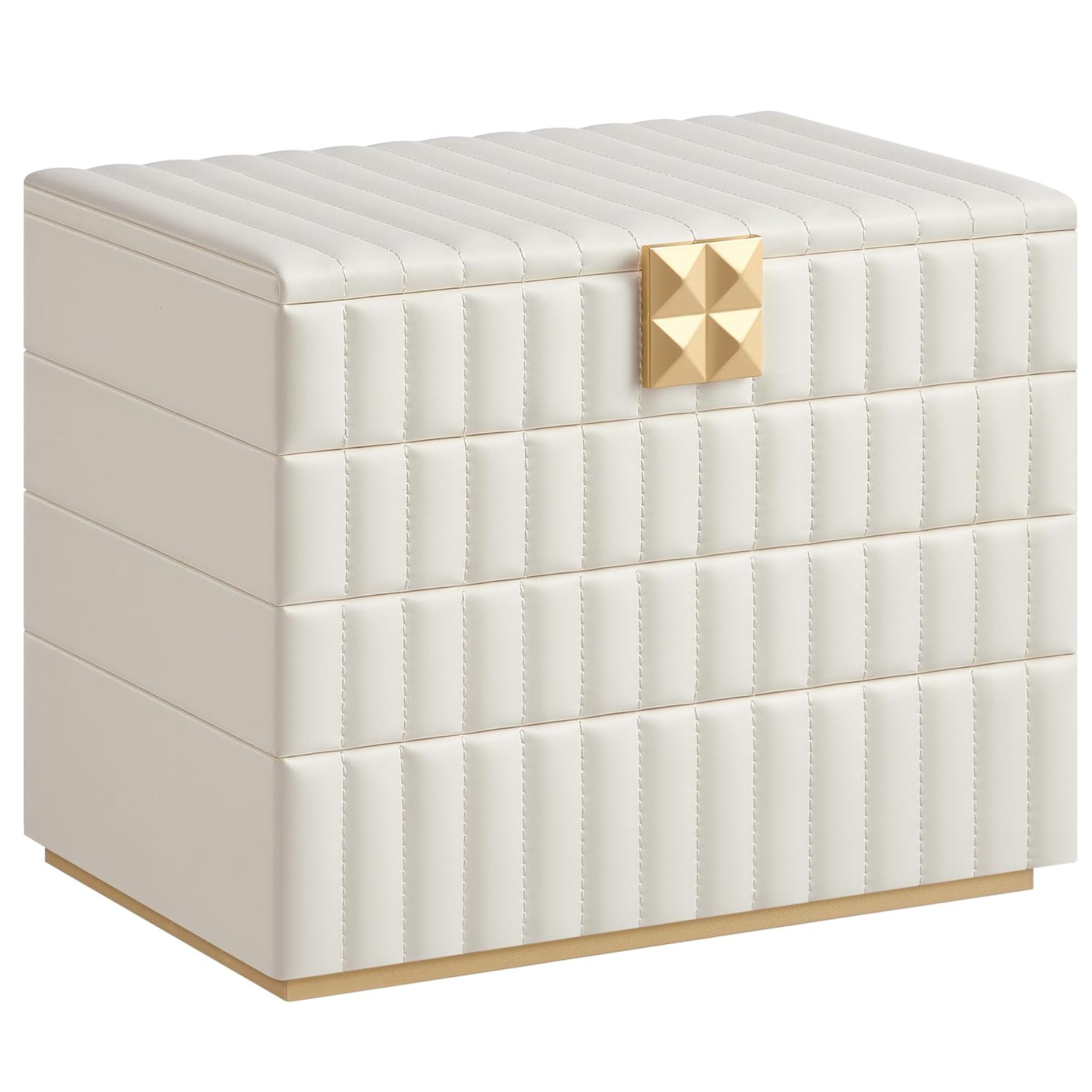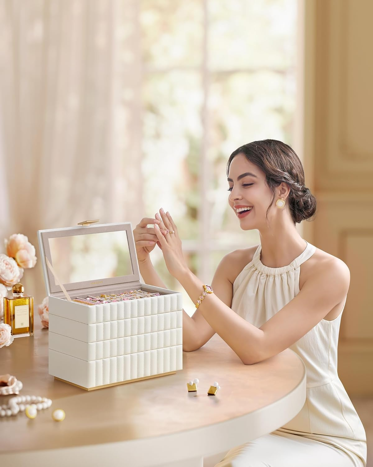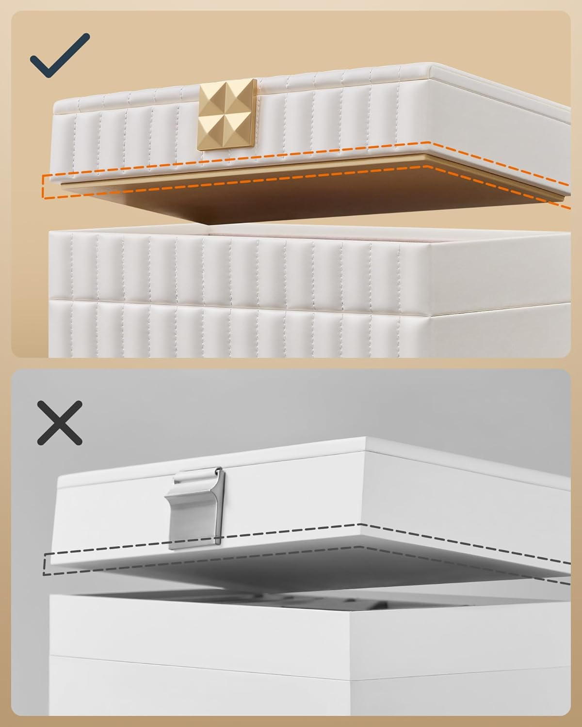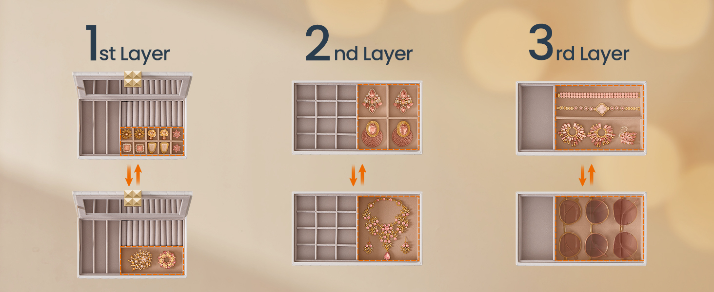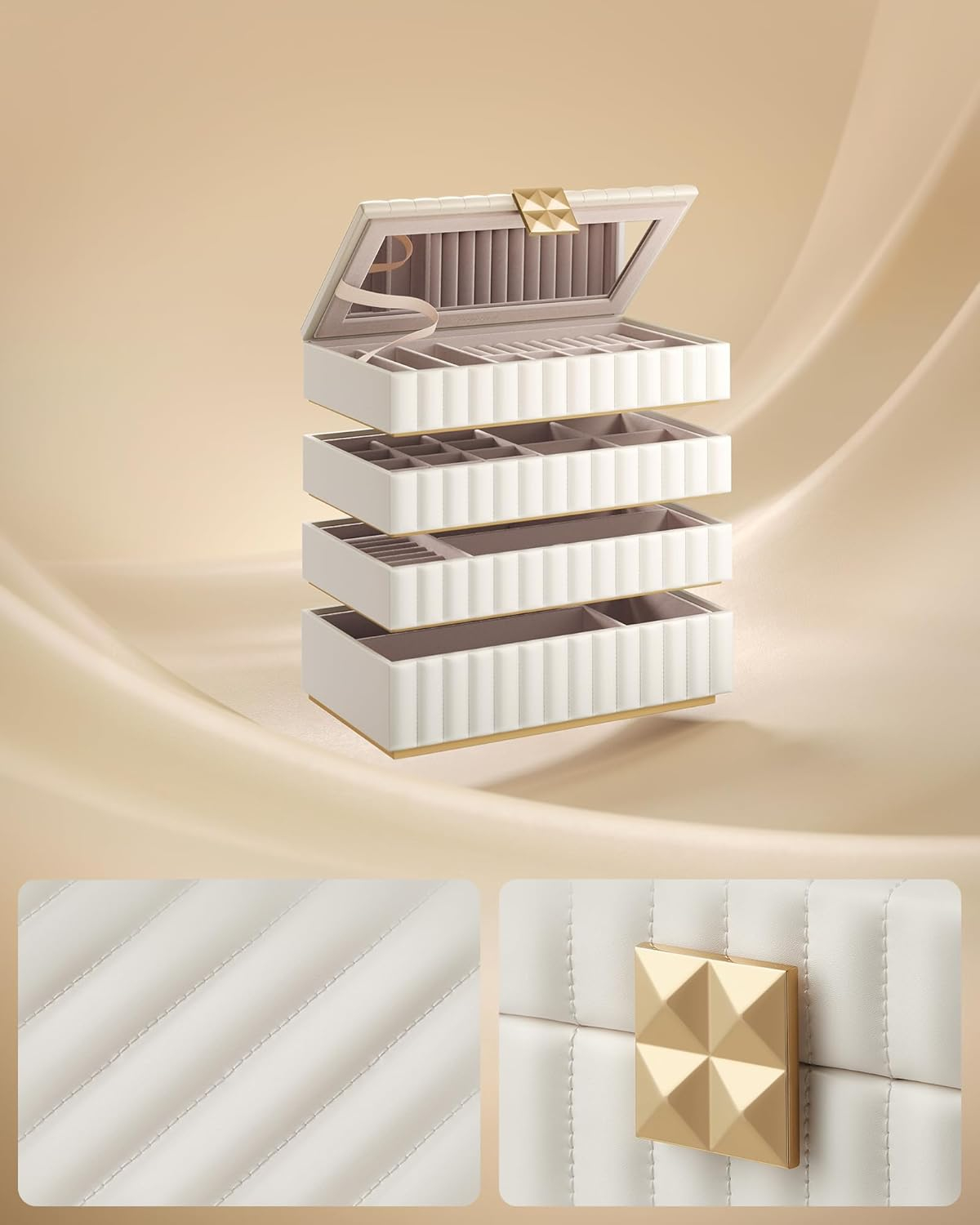 Specificatii: Culoare: Alb Material: Piele PU, MDF, catifea, metal, sticla Dimensiunea produsului: 17 x 28 x 20.5 cm Note: Uscati imediat orice umezeala de pe suprafetele din piele PU. Aceasta cutie de bijuterii nu previne patarea articolelor din argint. Un miros de „nou” poate fi prezent la prima deschidere a ambalajului; aerisiti-l intr-un loc bine ventilat timp de cateva ore. Daca suprafata sau oglinda devin prafuite, stergeti-le cu o carpa moale. Pastrati caseta de bijuterii departe de obiecte ascutite si dure pentru a preveni zgarieturile. Despre acest articol Stil redefinit: Piesele din colectia SONGMICS, au o suprafata neteda si moale din PU cu cusaturi decorative si accesorii unice in stil piramidal, care va pun in valoare bijuteriile. Stivuire sau separare: Cu aceasta cutie cu 4 niveluri, va puteti pune bijuteriile in ordine. Datorita designului cu inclestare, nivelurile pot fi stivuite in mod stabil una peste alta pentru a economisi spatiu. Sau le puteti intinde separat pentru acces usor. O multime de spatiu de depozitare, oglinda practica: In aceasta cutie de bijuterii, inelele, colierele, ceasurile, ochelarii de soare si alte accesorii pot fi organizate ordonat. In plus, oglinda mare va ajuta sa aplicati machiajul. Protectie completa: Cadru solid din MDF, suprafata exterioara rezistenta la apa, la uzura si usor de curatat - aceasta cutie de bijuterii ofera bijuteriilor dvs. protectie completa. In plus, captuseala moale de catifea va protejeaza bijuteriile de zgarieturi. Cadou: Surprindeti-i pe cei dragi cu aceasta cutie eleganta alba pentru bijuterii. Fie pe comoda in dormitor sau dressing, aceasta combina perfect functionalitatea cu estetica. Un cadou care va fi apreciat.