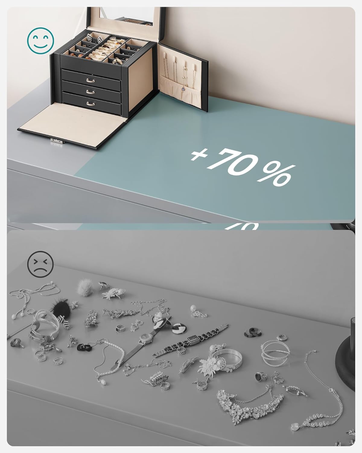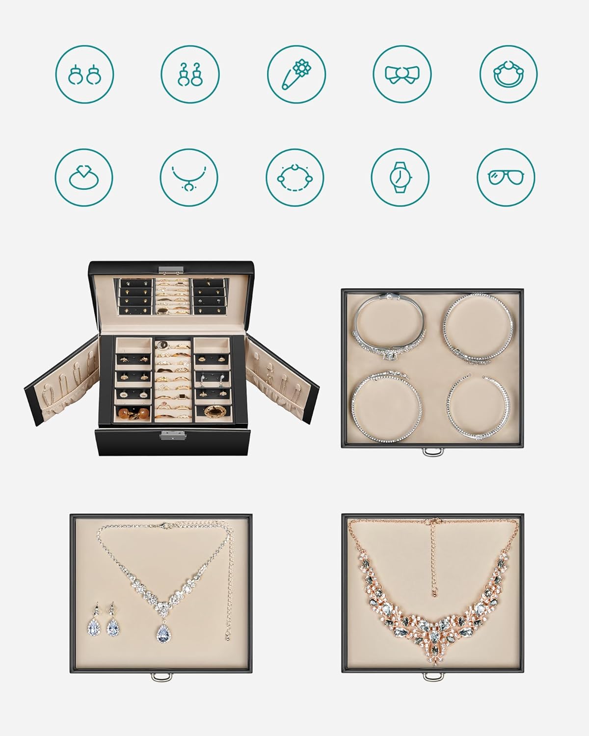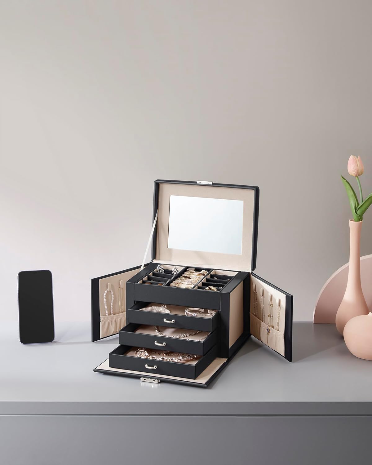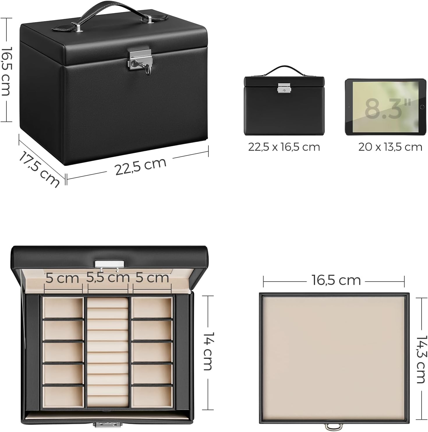 Specificatii: Culoare: Negru Material: MDF, PU (Poliuretan) exterior, captuseala din catifea Dimensiunea produsului: 17,5 x 22,5 x 16,5 cm (D x W x H) Greutatea produsului: 1,6 kg Despre acest articol Pastrati-va diversele bijuterii organizate cu aceasta cutie de bijuterii spatioasa. Se mandreste cu multiple carlige pentru coliere pe ambele parti si 4 niveluri de depozitare cu o multime de compartimente diferite. Organizatorul de bijuterii se blocheaza cu 2 chei pentru a va pastra piesele pretioase in siguranta; datorita manerului din partea de sus, cutia mica de bijuterii este portabila.Aceasta cutie pentru bijuterii are o oglinda transparenta pe capac. Suprafata din piele sintetica de calitate, corpul din MDF solid si cusaturile ingrijite alcatuiesc o cutie de bijuterii de calatorie solida si durabila, care va va tine companie multi ani de acum inainte.Aceasta cutie de bijuterii chic si functionala cu maner este perfecta pentru un cadou de aniversare!