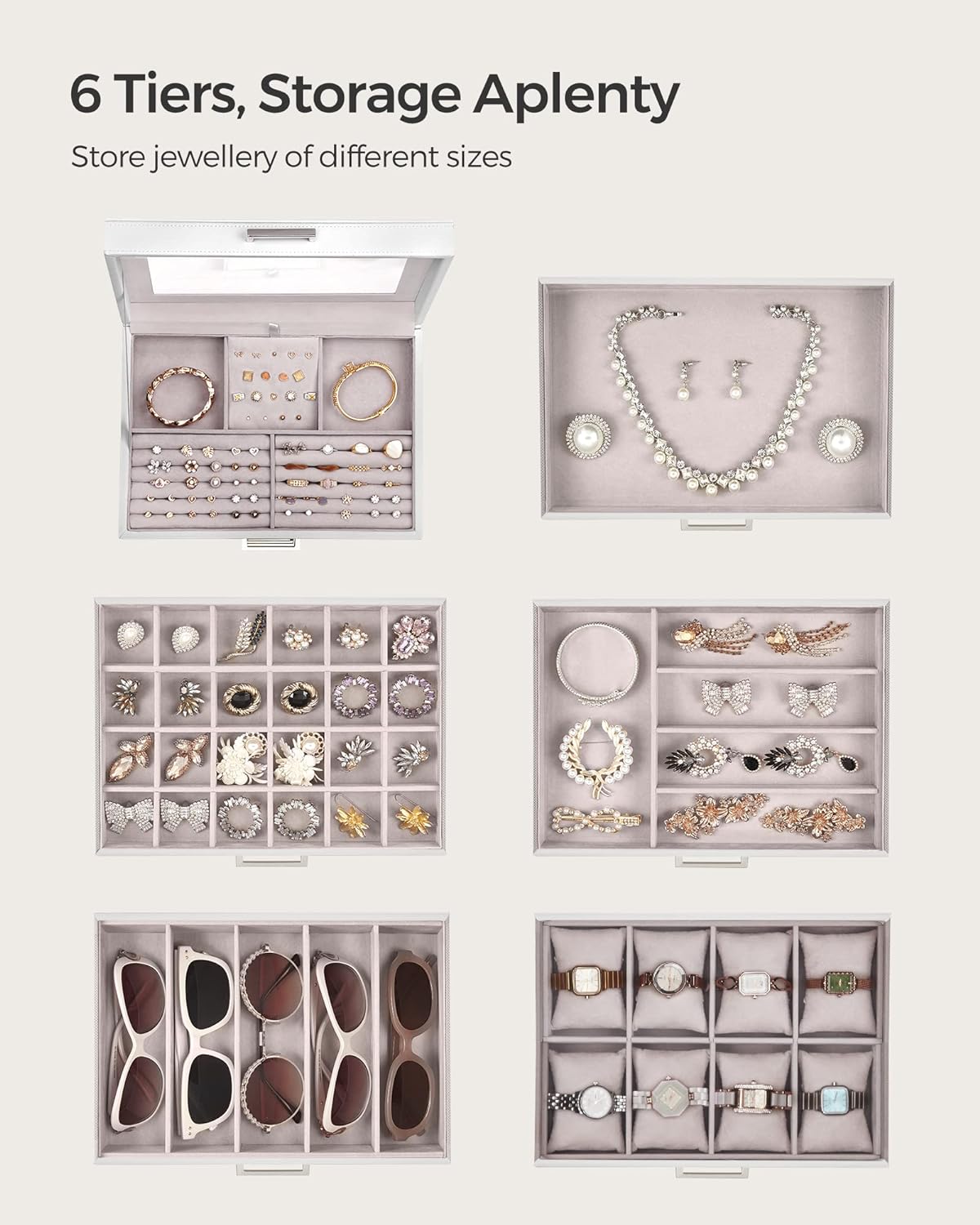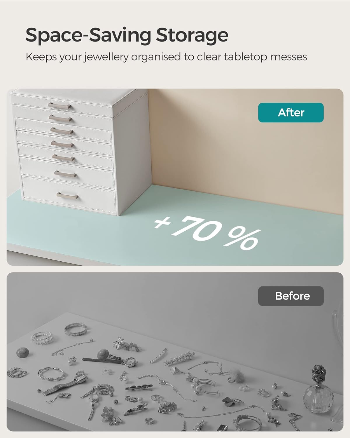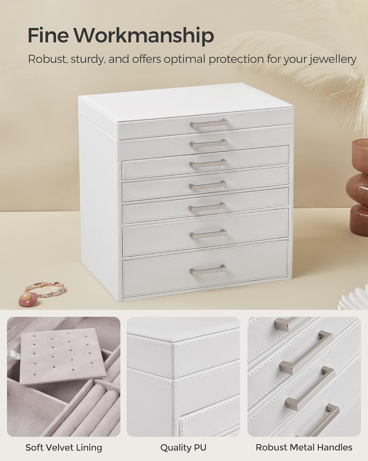 Detalii despre produs: Culoare: alb. Dimensiuni (L x H x P): 30,5 x 31,5 x 21,5 cm. Dimensiuni sertar (2,4. niveluri): 28,5x3,2x19,5 cm. Dimensiuni sertar (5. nivele) 28,5x4,5x19,5 cm (L x H x P). Dimensiuni sertar (6. niveluri) 28,5x6,5x19,5 cm. Dimensiunile compartimentului cu 6. niveluri (L x H x P): 6,5 x 4 x 9,5 cm. Material: Panou MDF + PU si catifea. Greutate neta: 4,48 kg. Despre acest articol Aceasta vitrina pentru bijuterii are 6 nivele spatioase pentru a le organiza si a le pregati pentru a le purta.Datorita diferitelor compartimente, bratarile, cerceii, colierele, inelele, ceasurile si chiar si ochelarii de soare vor fi toate la locul lor in aceasta cutie de bijuterii.Va veti bucura sa constatati ca opritorul impiedica sertarul sa cada dupa ce il deschideti in graba. In plus, rama rezistenta din MDF si captuseala catifelata va protejeaza bijuteriile de lovituri si zgarieturi, astfel incat acestea vor straluci mereu.Designul minimalist, pielea sintetica alba si manerele din metal stralucitor fac din acest organizator de bijuterii o piesa pur si simplu eleganta.