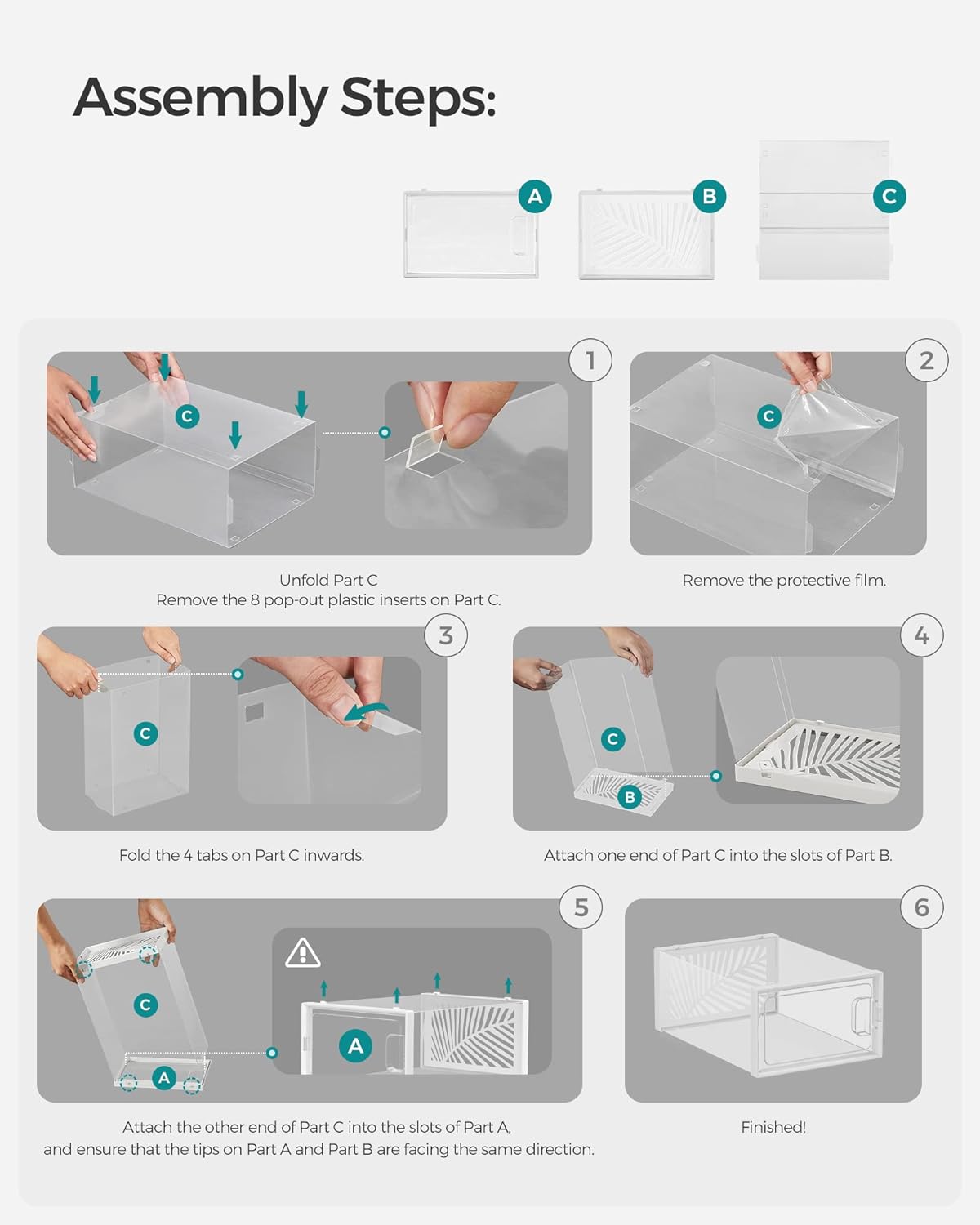 Detalii despre produs: Culoare: Alb transparent Material: Corp PET, cadru ABS Dimensiuni per cutie de pantofi: 33,5 x 23 x 14 cm (D x L x H). Dimensiunea interioara per cutie de pantofi: 30 x 22,6 x 13,5 cm (D x L x H) Despre acest articol Acest set de 18 cutii modulare pentru depozitarea pantofilor este o solutie practica si eficienta pentru a organiza si depozita pantofii intr-un mod ordonat si protejat. Aceste cutii modulare sunt concepute special pentru a oferi o solutie de depozitare pentru pantofii tai.Panoul din spate al cutiei de pantofi este prevazut cu gauri de aer in forma de frunze, care nu numai ca ii confera cutiei de pantofi un stil modern, dar sporesc si ventilatia pentru a preveni mirosurile neplacute.Materialul PET de inalta calitate, combinat cu un cadrul ABS cu caneluri, face ca aceste cutii sa fie stabile chiar si atunci cand sunt stivuite. Astfel, puteti crea un suport de pantofi care se potriveste spatiului dvs.18 cutii de pantofi usor de asamblat, cu o dimensiune interioara de 30 x 22,6 x 13,5 cm, va ajuta sa depozitati cu usurinta pantofii de sport, balerinii, papucii si tocurile inalte.Nu numai ca poate fi folosita ca o cutie de pantofi stivuibila pentru garderoba, dormitorul si holul dvs., dar poate fi folosita si pentru a organiza haine, papetarie, accesorii si multe altele. Corpul transparent este, de asemenea, perfect pentru expunerea pantofilor.