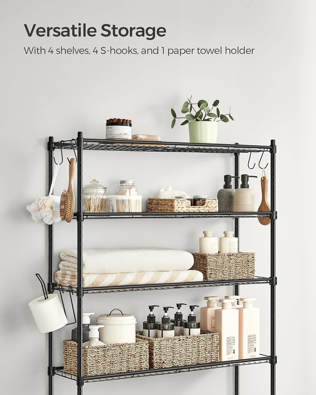 Specificatii: Culoare: Negru Material: Otel Dimensiunea produsului: 30 x 83 x 176 cm Max. Capacitate de incarcare statica pe nivel: 11,3 kg Despre acest articol Conceput pentru a valorifica spatiul neutilizat de deasupra toaletei sau a masinii de spalat, acest raft spatios de depozitare pe 4 niveluri ofera spatiu suficient pentru articolele de toaleta si articolele esentiale de spalat, contribuind la o baie senina si ordonata.Acesta vine cu un suport pentru role si 4 carlige convenabile, oferind un loc desemnat pentru hartia igienica si articolele mai mici, imbunatatind functionalitatea spatiului dvs. de baie.Cu 4 rafturi ajustabile, acest raft de depozitare pentru baie este perfect pentru depozitarea articolelor de inaltimi diferite, de la sticle de sampon la prosoape, raspunzand nevoilor dvs. unice de depozitare.Raftul inferior reglabil al acestui suport pentru baie asigura lipsa interferentelor cu capacul toaletei, in timp ce barele inferioare reglabile se potrivesc unei varietati de modele de toalete pentru confort. Acest raft metalic peste toaleta este proiectat cu un fund marit pentru o stabilitate sporita, cuplat cu picioare reglabile pentru a asigura un echilibru perfect. Asamblarea acestui raft este foarte simpla. Nu este nevoie de suruburi sau chei. Pur si simplu imbinati piesele clar etichetate conform instructiunilor.