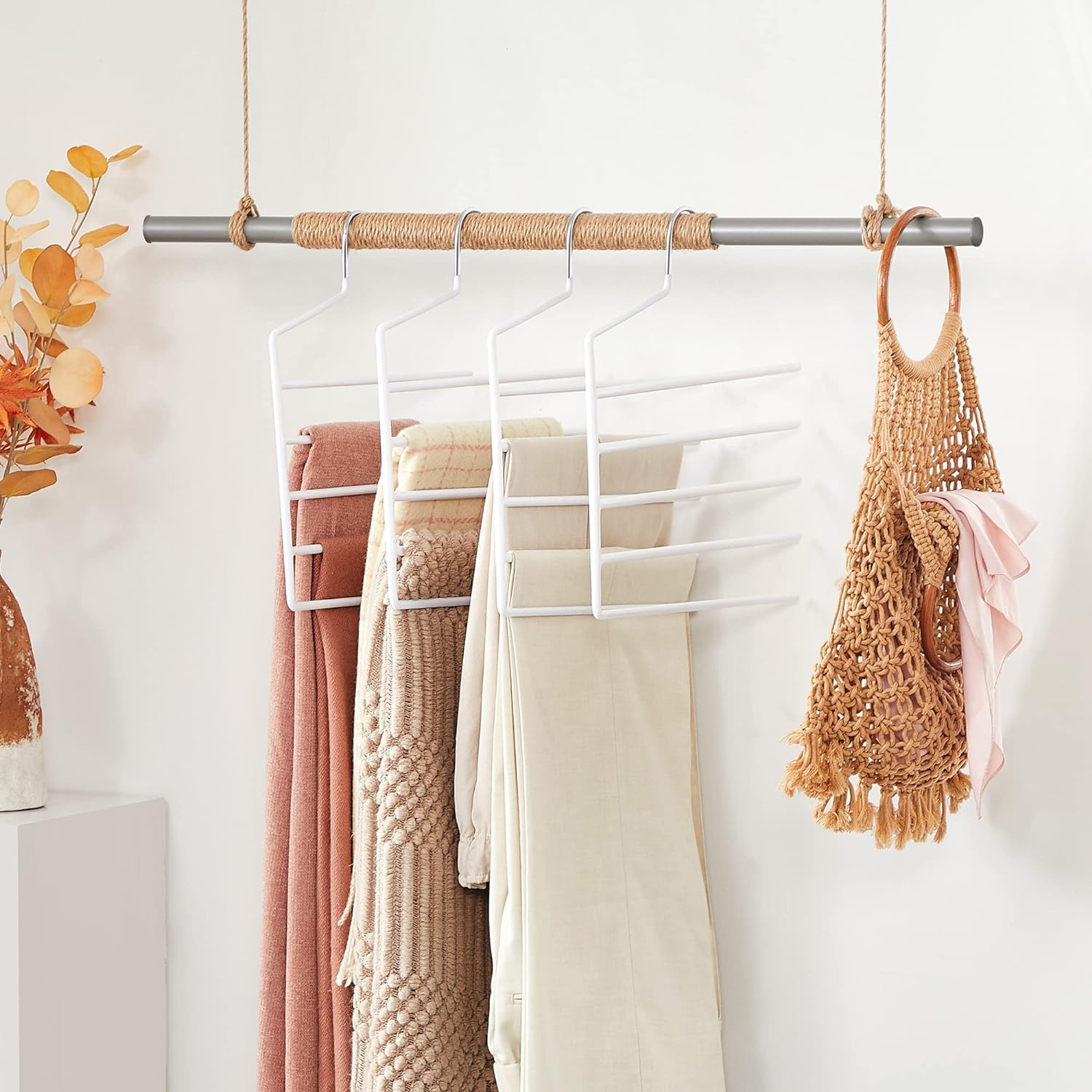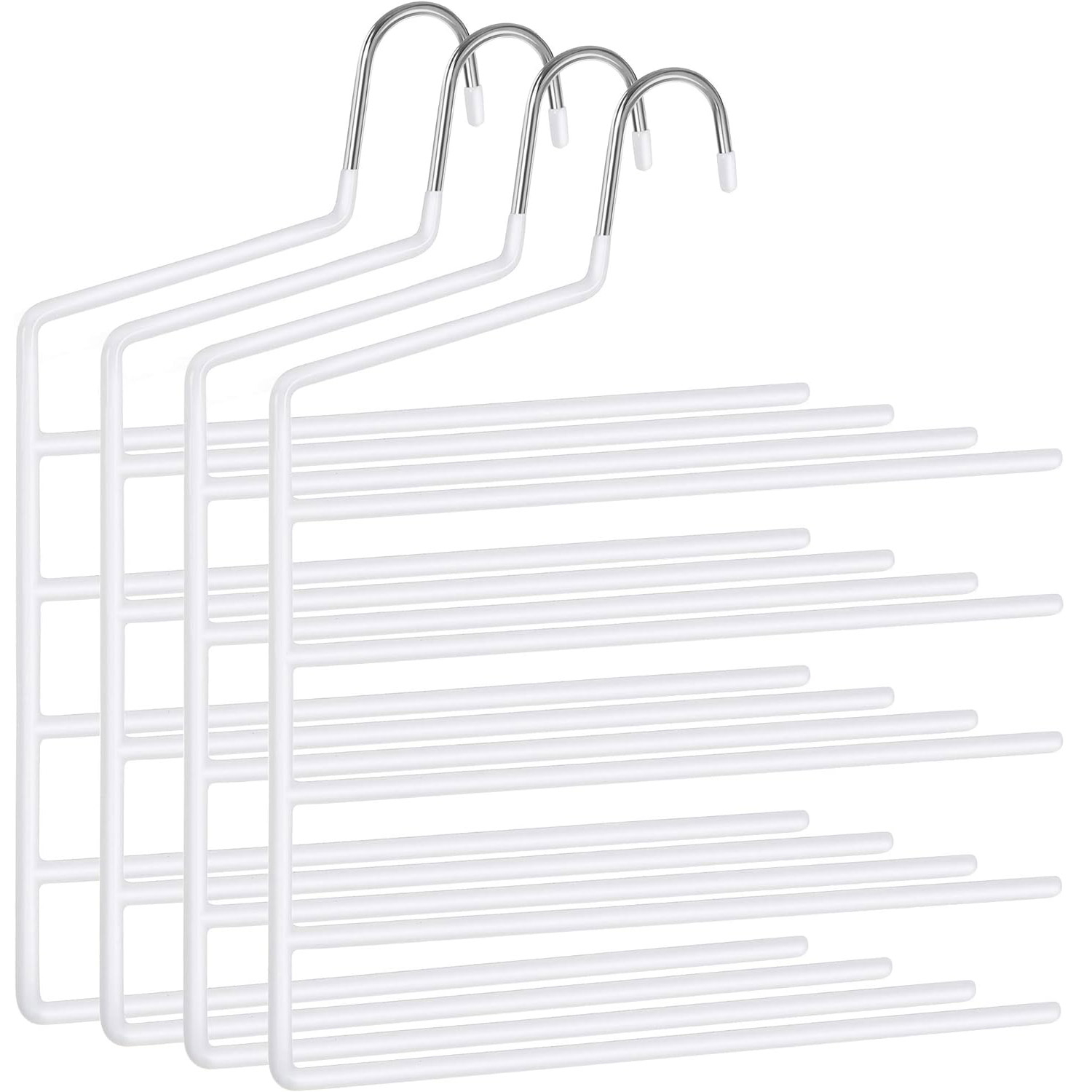 Detalii despre produs: Culoare: Alb Material: alb: Metal cu acoperire din PVC Dimensiuni per consola: 32 x 0,5 x 35 cm (L x l x ih). Greutate per suport: 350 g. Capacitate de incarcare statica maxima per suport: 4 kg. Despre acest articol In garderoba ta se afla un munte imens de pantaloni? Esarfele si prosoapele tale sunt dezordonate intr-un sertar? Umerasele noastre multiple va vor veni in ajutor! Ca sa puteti agata totul in mod ordonat.Cu aceste umerase multiple pentru pantaloni, puteti economisi pana la 80% din spatiul din dulap. Asa ca urmatorul tur de shopping poate veni!Nu! Sunteti suparat ca hainele dvs. tot aluneca de pe umeras? Acest lucru nu vi se va mai intampla de acum inainte. Datorita acoperirii din PVC a acestor umerase, hainele dvs. pot fi agatate fara sa alunece si fara sa se sifoneze.Confectionate din metal rezistent, fiecare dintre aceste umerase multiple pentru pantaloni poate suporta greutati de pana la 4 kg.Ce primesti: 4 umerase multiple pentru pantaloni, fiecare cu 5 bare. Aceste umerase va permit sa va atarnati pantalonii si esarfele in mod clar si ordonat si sa maximizati spatiul din dulap.