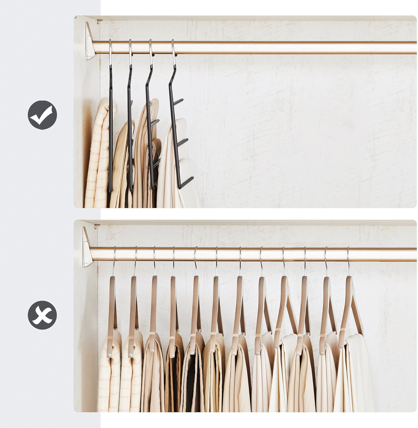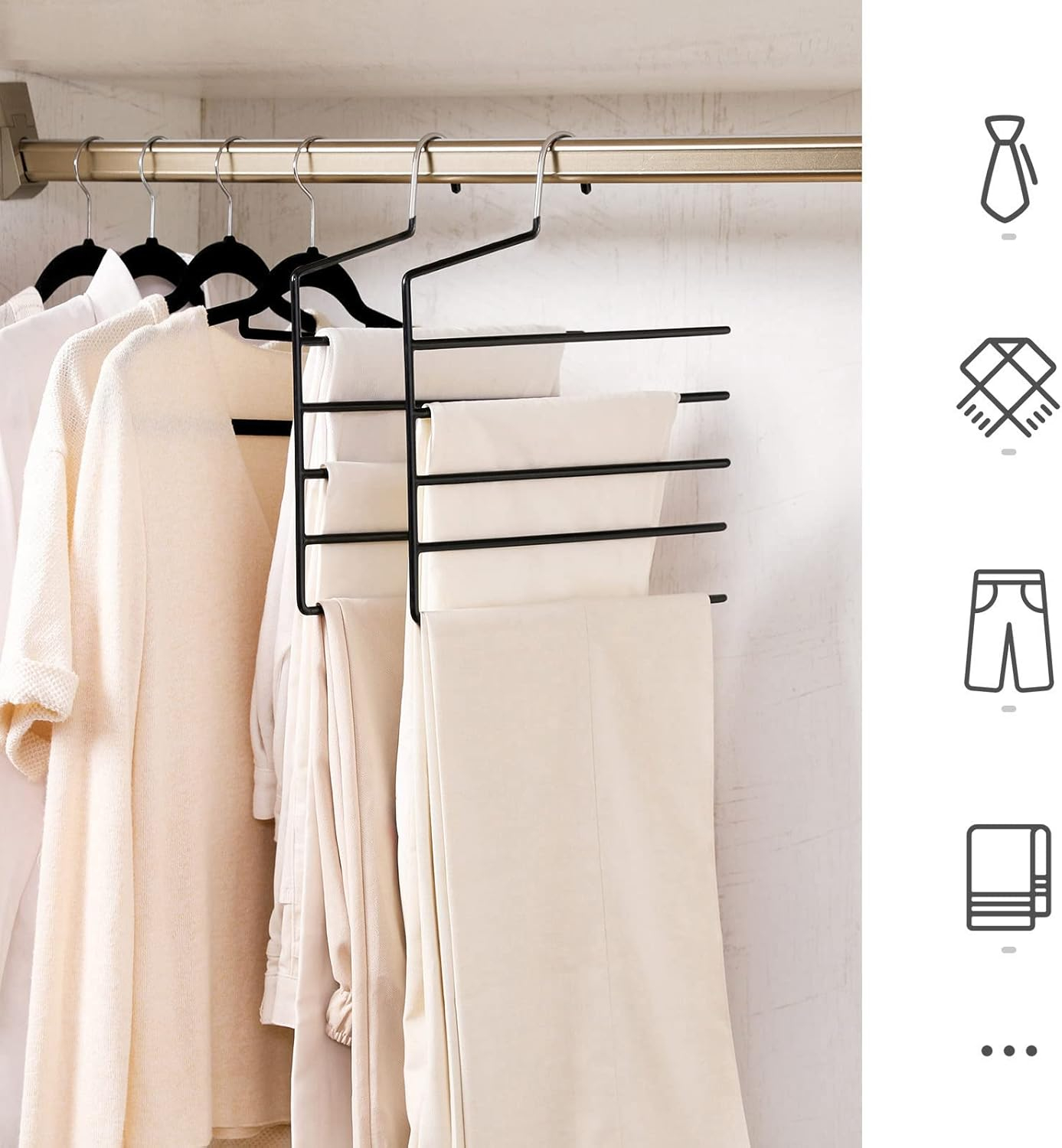 Specificatii: Culoare: Negru Material: Metal cu invelis din PVC Dimensiunea fiecarui cuier: 32 x 0,5 x 35 cm (L x l x i) Max. Capacitate de incarcare statica per umeras: 4 kg Despre acest articol Pantalonii sunt ascunsi printre grupuri de haine, iar esarfele si prosoapele se pierd adesea in dezordine. Preia controlul asupra haosului cu acest set de 4 umerase cu bare multiple, mentinandu-le ordonate si intr-un singur loc.Pantalonii delicati par destinati sa ajunga pe podeaua dulapului tau, provocand acea gramada de temut? Acoperirea din PVC de pe fiecare bara va ajuta sa preveniti acest incident enervant si ridurile rezultate.Fabricat din metal solid, fiecare umeras poate sustine pantaloni care cantaresc pana la 5 kilograme.