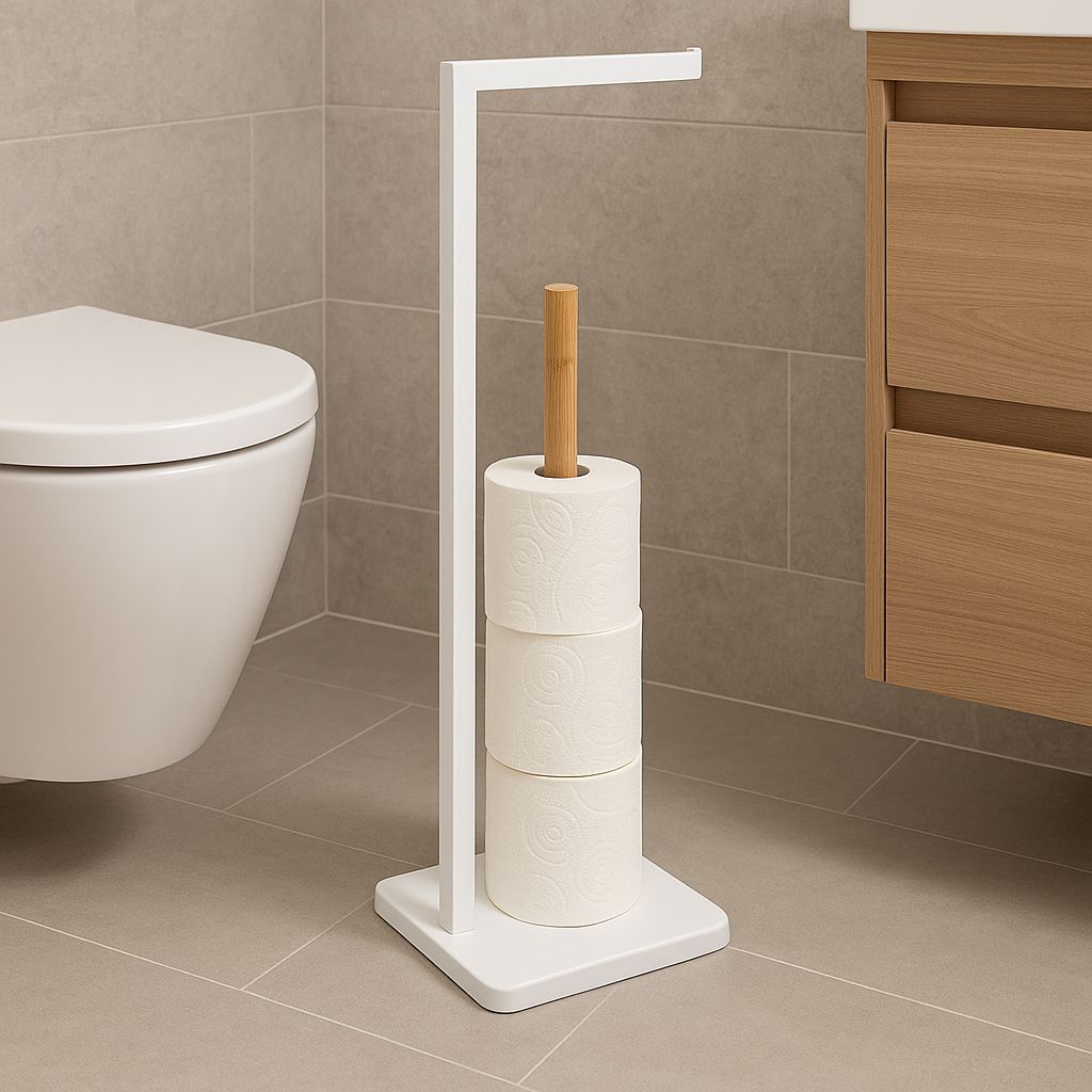 Specificatii tehnice Marca: 5Five Model: Natureo Culoare: Alb Material: Metal si bambus Dimensiuni produs: L. 20 x P. 20 x H. 64,5 cm Scurta descriere Suportul de hartie igienica 5Five Natureo imbina eleganta lemnului de bambus cu functionalitatea unei structuri metalice moderne. Ideal pentru bai luminoase si aerisite, acest accesoriu ofera si spatiu de depozitare pentru role suplimentare. Caracteristici principale Design modern cu accente naturale din bambus Suport pentru o rola in uz si spatiu de stocare Constructie solida din metal vopsit alb Potrivit pentru bai minimaliste sau scandinave Forma compacta, usor de integrat langa toaleta