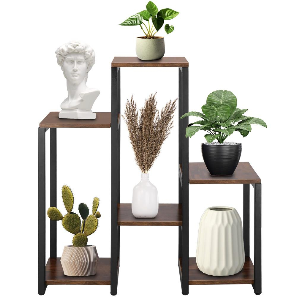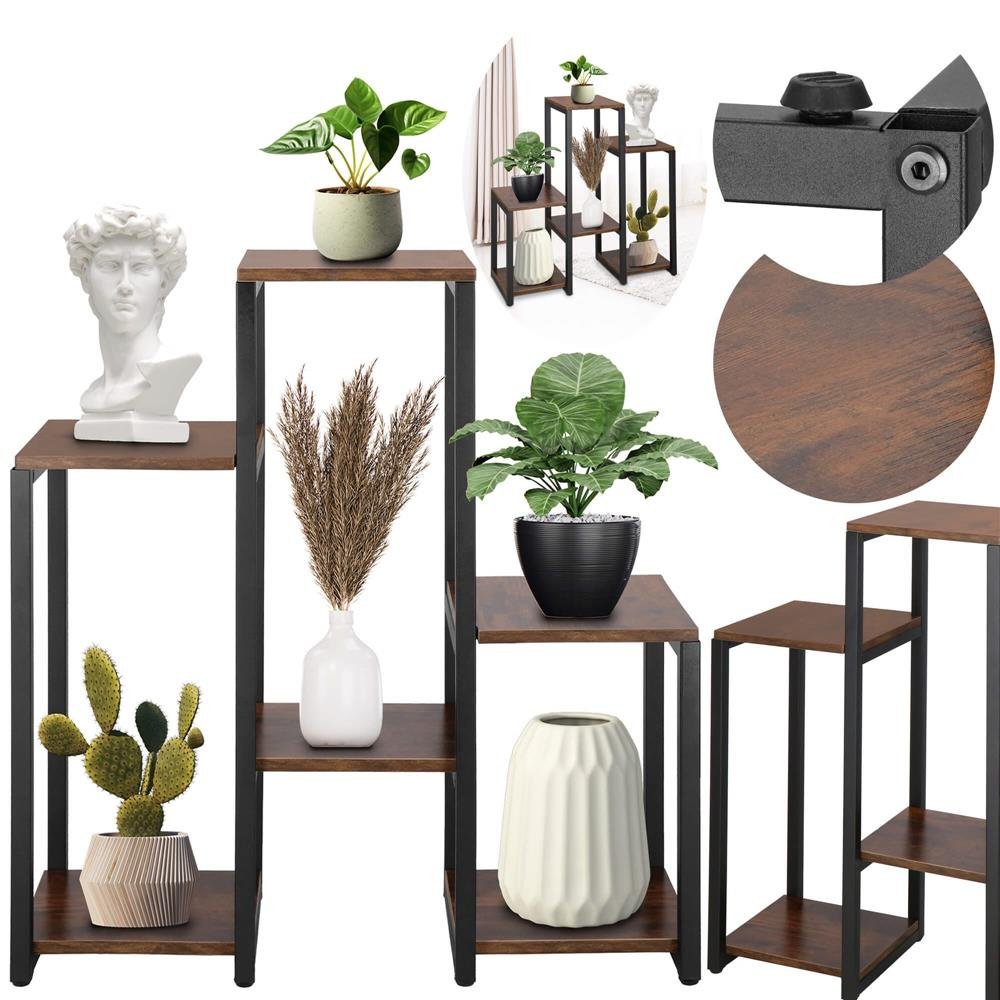 Acest suport pentru flori cu  6 rafturi  este o solutie ideala pentru organizarea plantelor in locuinta, pe balcon sau terasa. Cu un design modern si functional, ofera stabilitate si rezistenta, fiind fabricat dintr-o combinatie durabila de  metal negru mat si placi de mobilier cu aspect de lemn ars  in nuanta maro inchis.  Caracteristici principale:   	  Dimensiuni compacte si spatiu generos  – 79 cm inaltime, 68.5 cm latime si 24 cm adancime, potrivit pentru colturi sau spatii inguste.  	  6 rafturi de diferite dimensiuni  – permite organizarea plantelor de diverse marimi.  	  Structura stabila si durabila  – cadru metalic rezistent, finisaj mat si strat anticoroziv.  	  Picioare antiderapante  – previn zgarierea podelei si asigura aderenta.  	  Capacitate de incarcare de pana la 30 kg , ideala pentru ghivece cu flori, plante suculente sau decoratiuni.  	  Usor de asamblat  – vine cu toate accesoriile necesare si instructiuni detaliate.   Acest suport elegant si practic este perfect pentru a adauga un plus de stil si organizare spatiului tau.