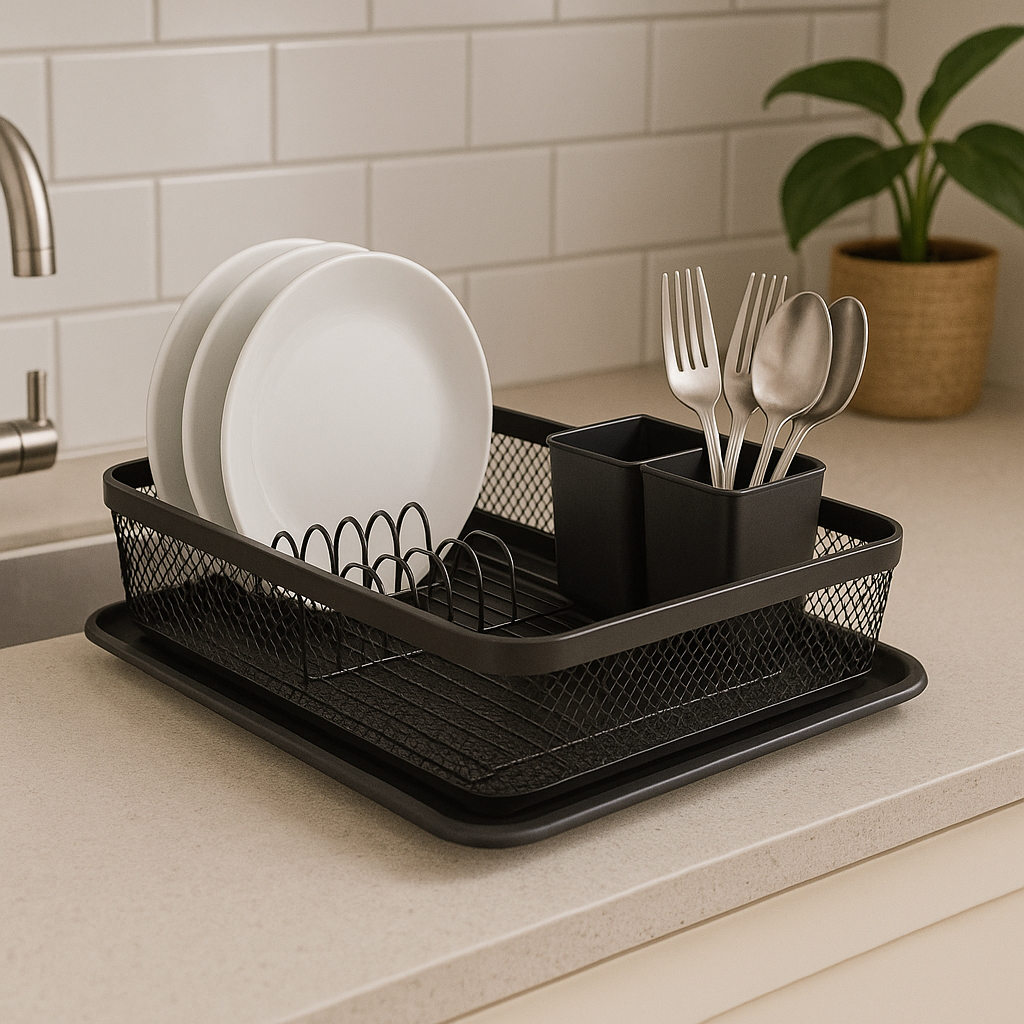 Specificatii tehnice    Marca:  5Five  Model:  Mayaj  Culoare:  Negru  Dimensiuni produs:  L. 43 x P. 32 x H. 13,5 cm  Material:  Otel si polipropilena   Scurta descriere   Elegant si eficient, suportul de vase 5Five Mayaj combina structura metalica solida cu elemente practice din plastic pentru scurgere rapida. Finisajul negru ofera un aspect modern, perfect pentru bucatariile minimaliste sau contemporane.   Caracteristici principale    	 Structura metalica rezistenta  	 Tava de colectare detasabila inclusa  	 Design compact, ideal pentru blaturi mici  	 Finisaj negru modern  	 Capacitate de uscare pentru vesela zilnica