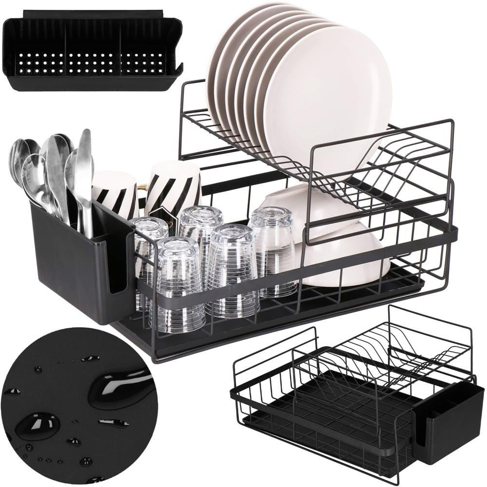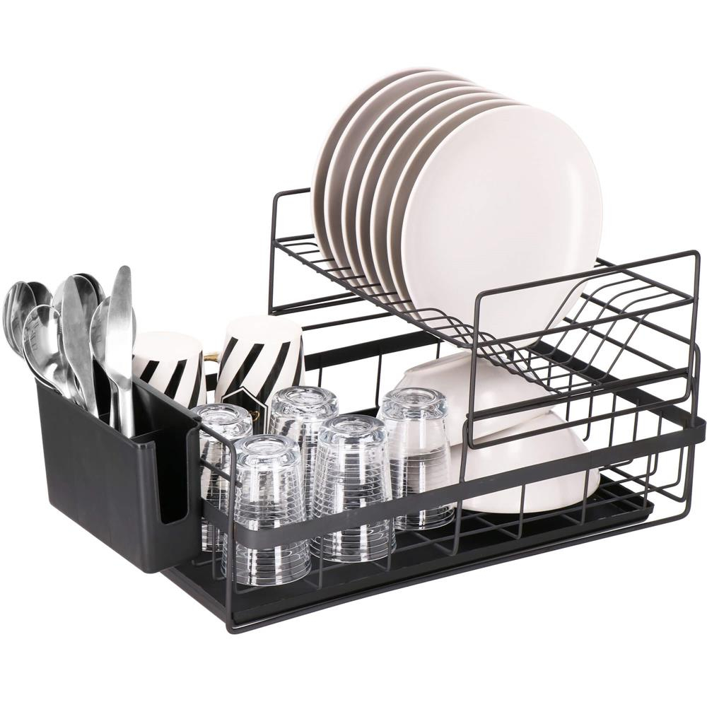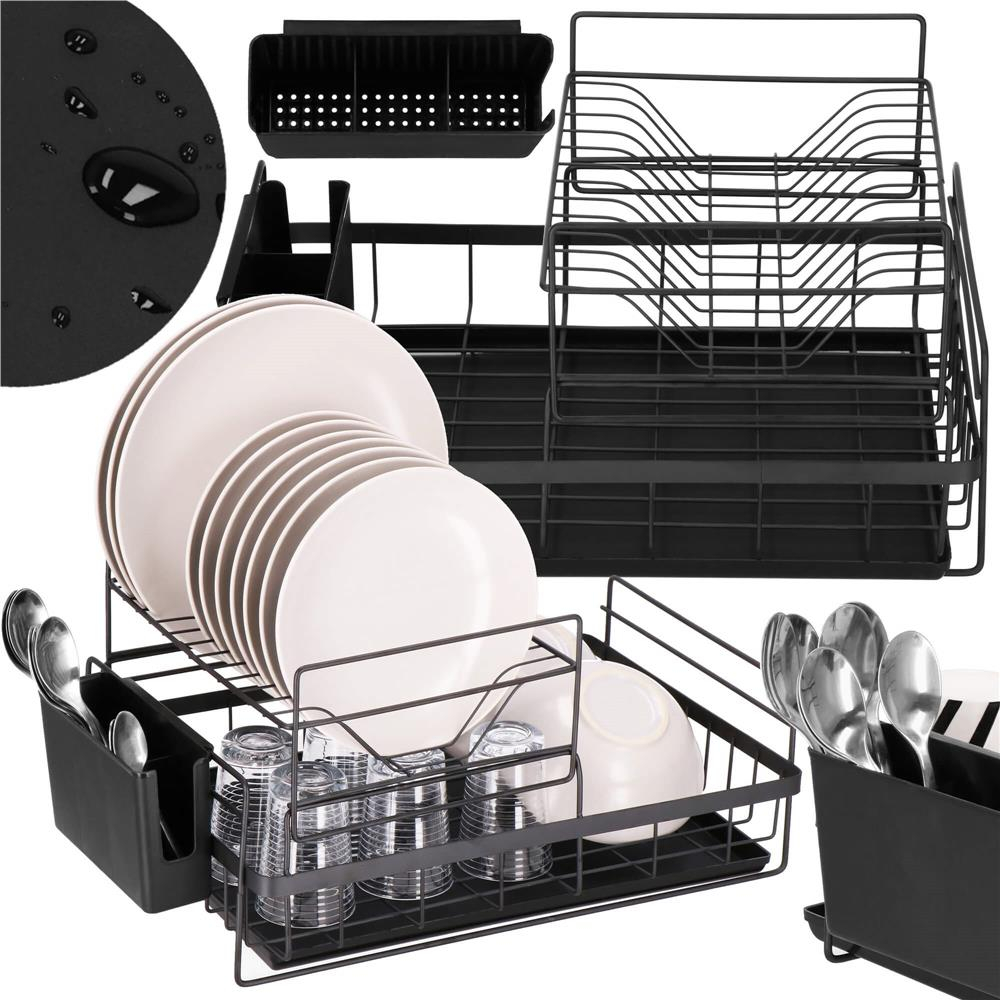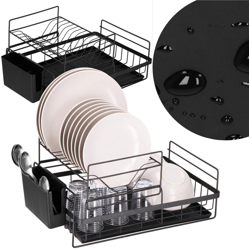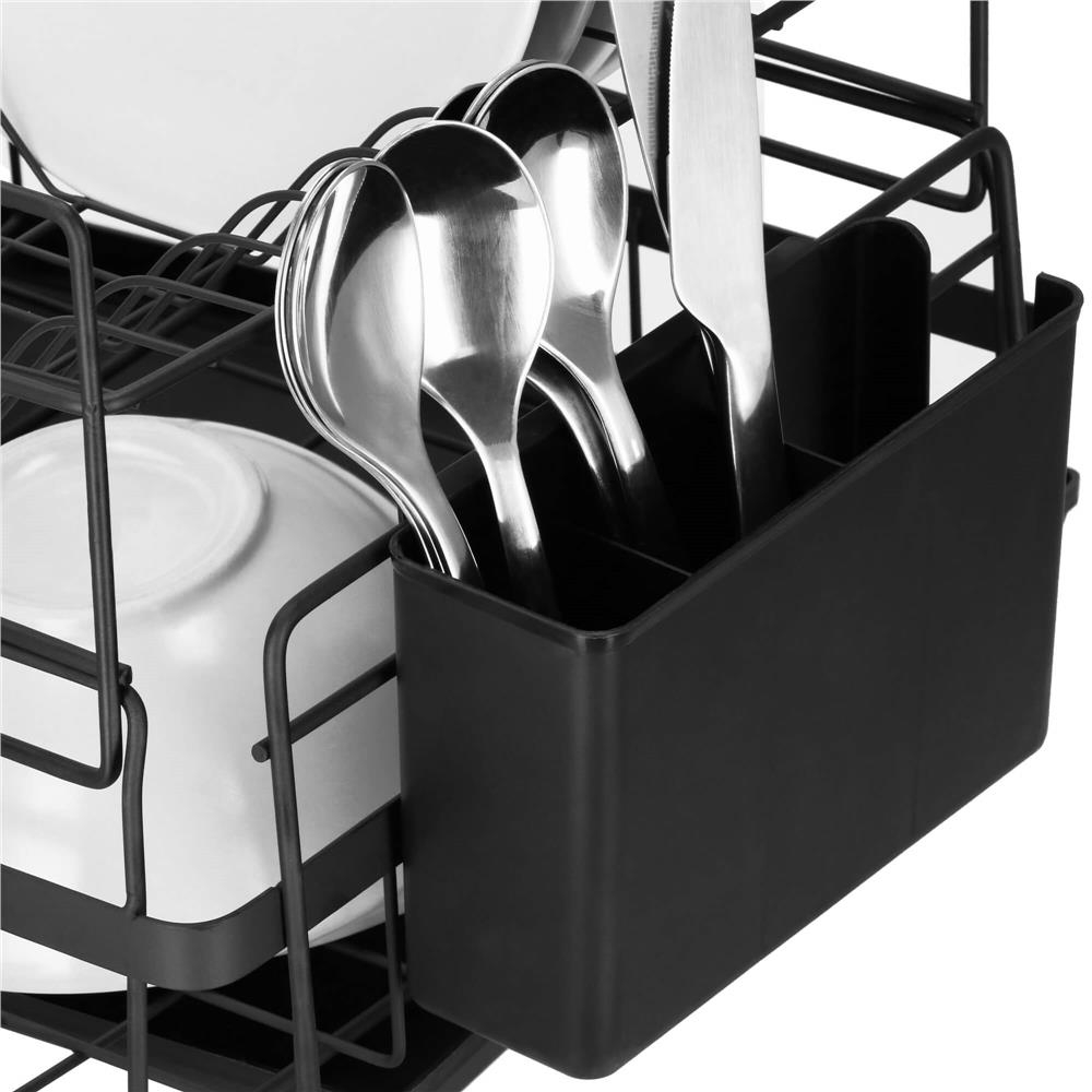 Culoare neagra Material: otel, plastic Tip: uscator de vase cu doua niveluri Lungime totala: aproximativ 50 cm Latime totala: 30 cm Inaltime totala: 24 cm Uscatorul din metal negru pentru tacamuri si alte ustensile de bucatarie cu finisaj mat, este perfect pentru bucataria dvs. Ustensilele umede se vor usca rapid si excesul de apa va fi retinut pe tava de scurgere. Uscatorul este un plus atractiv pentru amenajarea bucatariei Fabricat din otel acoperit cu pulbere Te ajuta sa fii organizat si ordonat Usureaza uscarea tacamurilor si a ustensilelor Utilizare universala Include o tava de plastic detasabila si un suport pentru ustensile Constructia stabila, cu o baza confortabila, mare, ondulata, impiedica scurgerea apei pe blatul mesei si nu deterioreaza mobilierul. Este echipat cu un organizator de tacamuri agatat care poate fi atasat oriunde pe marginea uscatorului. Aspectul modern al uscatorului in stil loft il va face sa se potriveasca in orice interior. Datorita materialelor din care este confectionat, uscatorul este usor de curatat.