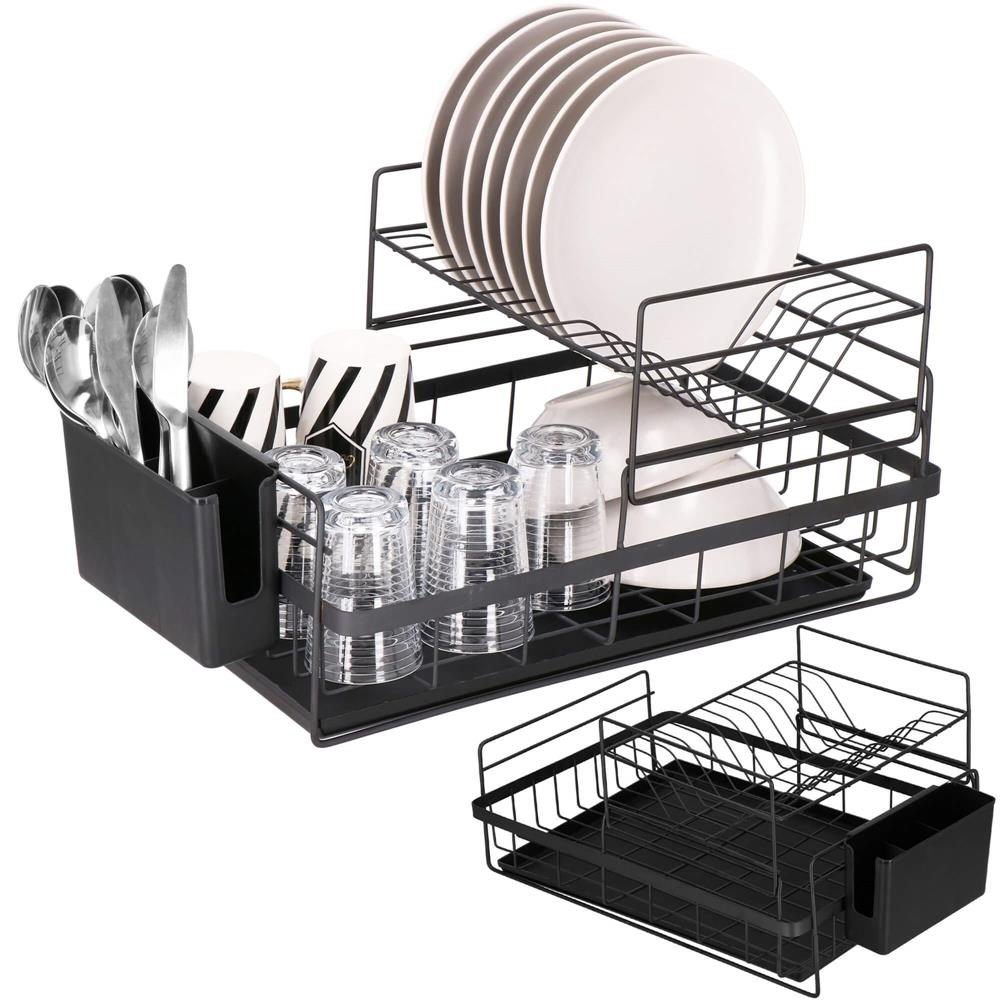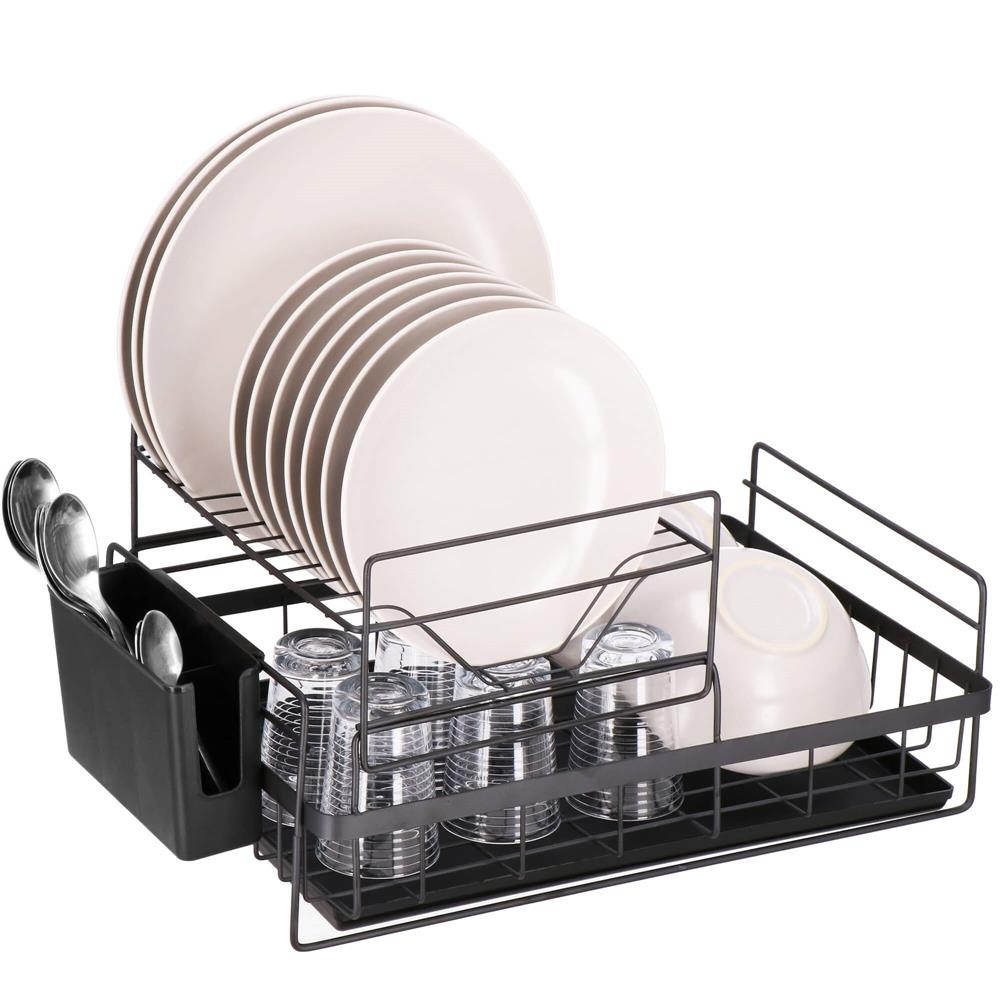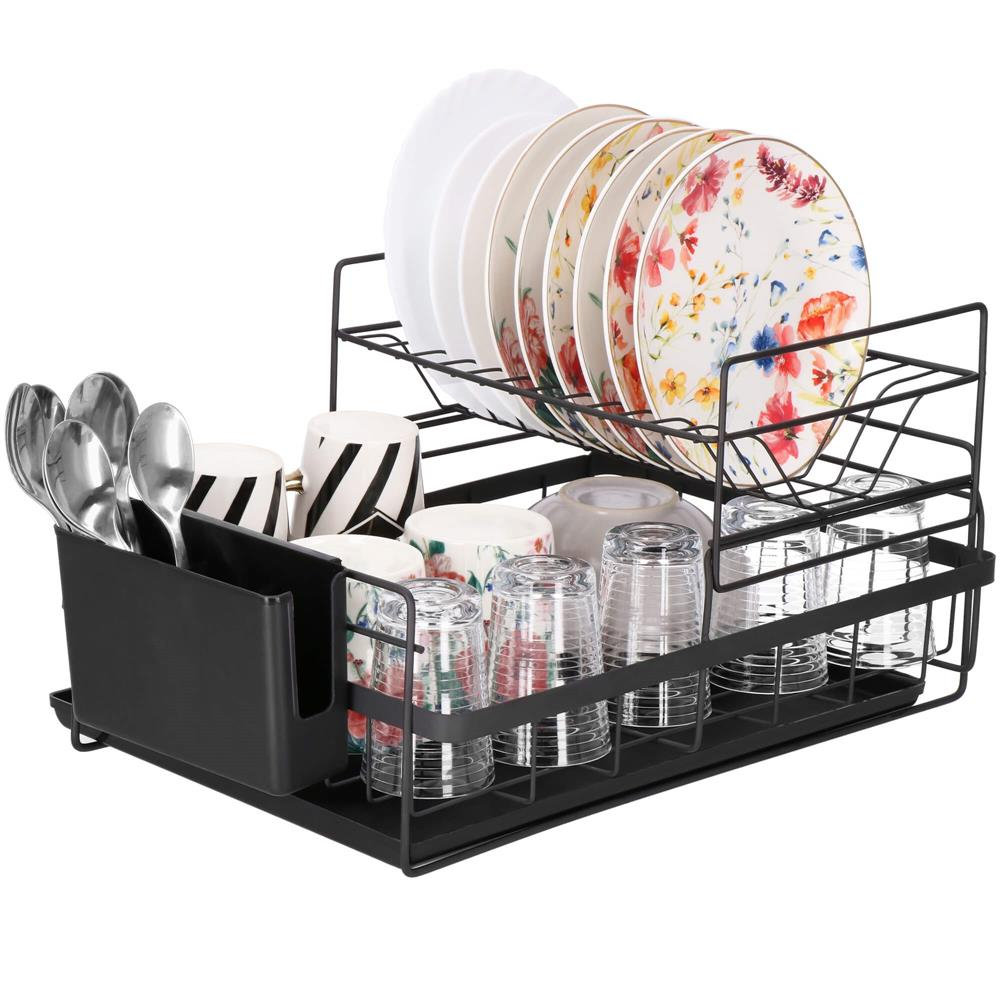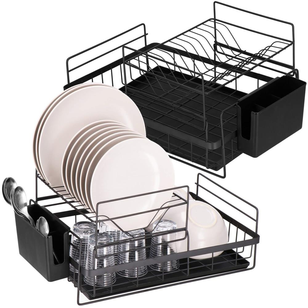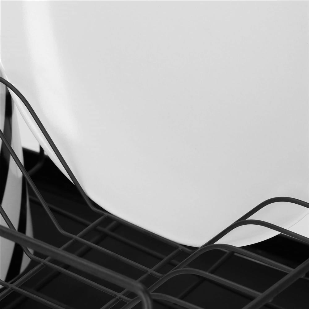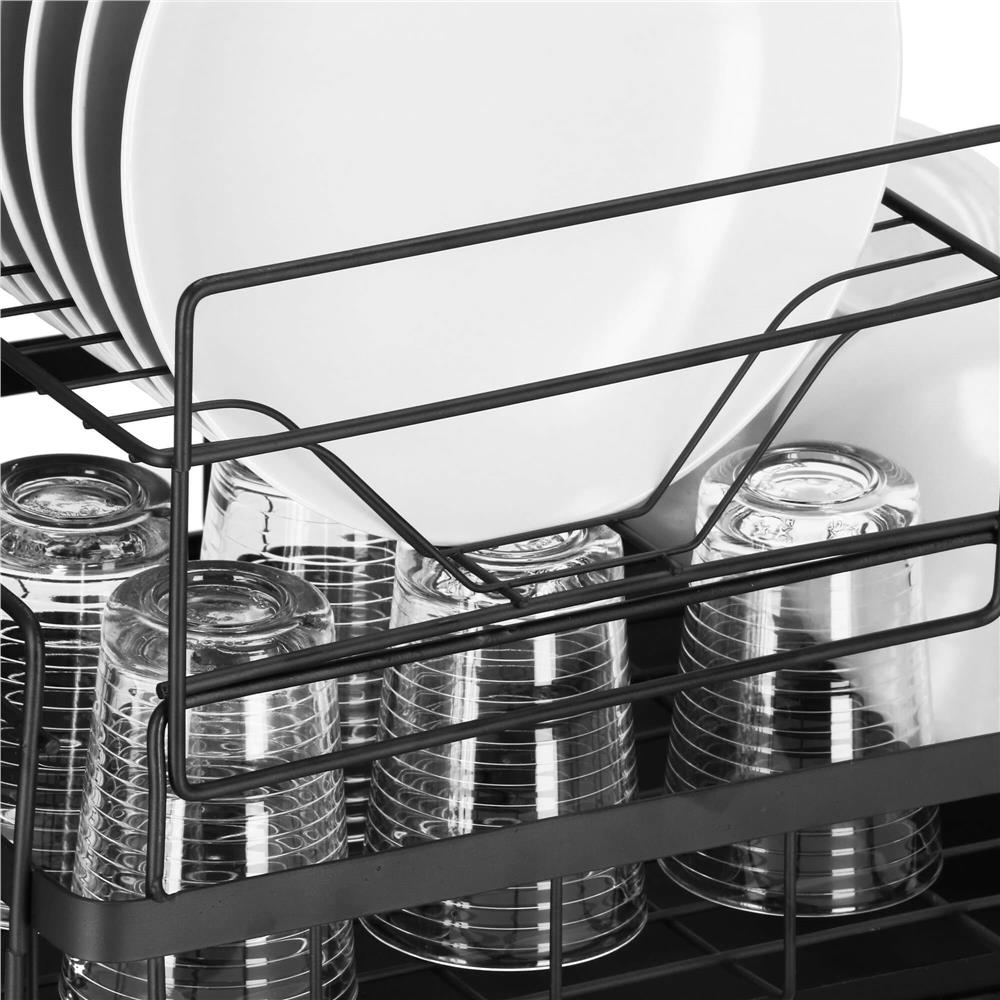 Culoare neagra Material: otel, plastic Tip: uscator de vase cu doua niveluri Lungime totala: aproximativ 50 cm Latime totala: 30 cm Inaltime totala: 24 cm Uscatorul din metal negru pentru tacamuri si alte ustensile de bucatarie cu finisaj mat, este perfect pentru bucataria dvs. Ustensilele umede se vor usca rapid si excesul de apa va fi retinut pe tava de scurgere. Uscatorul este un plus atractiv pentru amenajarea bucatariei Fabricat din otel acoperit cu pulbere Te ajuta sa fii organizat si ordonat Usureaza uscarea tacamurilor si a ustensilelor Utilizare universala Include o tava de plastic detasabila si un suport pentru ustensile Constructia stabila, cu o baza confortabila, mare, ondulata, impiedica scurgerea apei pe blatul mesei si nu deterioreaza mobilierul. Este echipat cu un organizator de tacamuri agatat care poate fi atasat oriunde pe marginea uscatorului. Aspectul modern al uscatorului in stil loft il va face sa se potriveasca in orice interior. Datorita materialelor din care este confectionat, uscatorul este usor de curatat.