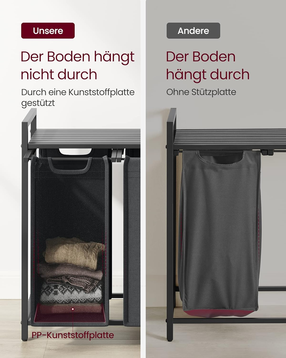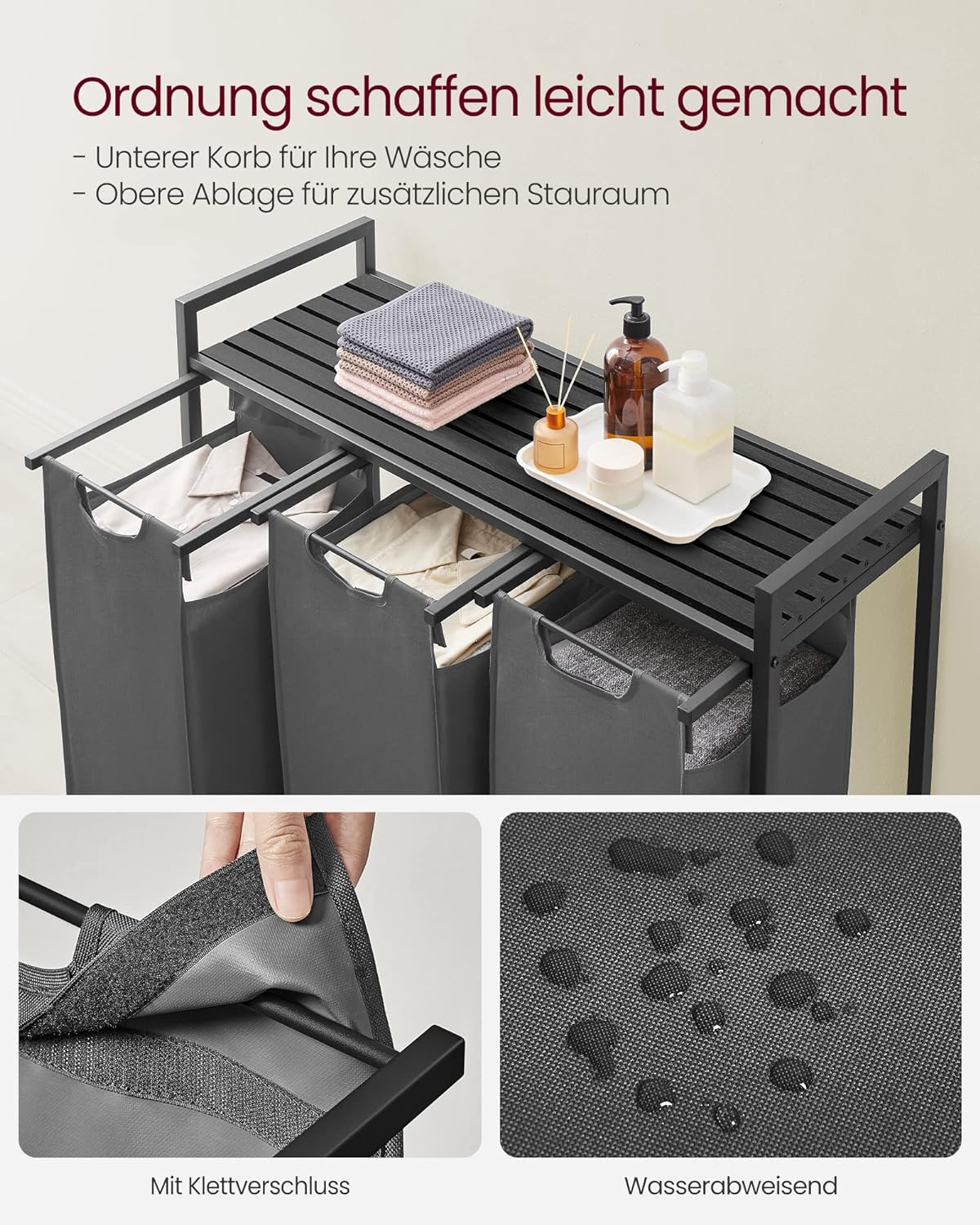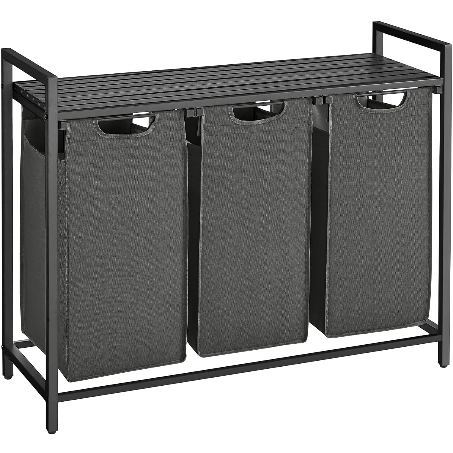 Dimensiunile produsului: 92.5L x 33W x 72H centimetri Marca: VASAGLE Culoare: Negru + Gri Material: MDF (placi de fibre de densitate medie), otel, tesatura Oxford Despre acest articol 3 compartimente pentru a va depozita rufele separat: Capacitatea totala a acestui cos de rufe: 114 litri (per compartiment 38 litri). Cele 3 compartimente va ajuta sa va depozitati rufele separat dupa culori sau tipuri. Cu raft: Raftul cosului de rufe ofera spatiu suplimentar pentru detergent de rufe sau articole de toaleta; designul sipcilor asigura o circulatie optima a aerului pentru a tine la distanta mirosurile nedorite. Saci de rufe - extensibile si detasabile: Sustinuti cu o placa de baza din plastic, pungile nu atarna si au elemente de fixare convenabile cu velcro, astfel incat sa le puteti scoate cu usurinta pentru a duce rufele la masina de spalat. Solid, stabil si durabil: Tuburi solide de otel de 2 x 2 cm, panouri MDF de inalta calitate - cosul de rufe este robust si rezistent (raft pana la 20 kg). Gentile sunt confectionate din material Oxford hidrofug. Cele 4 picioare reglabile sporesc stabilitatea. Versatil: Acest cos de rufe se potriveste bine in spalatorie, baie sau dormitor. Asezati-l acolo unde aveti nevoie de spatiu de depozitare pentru rufele dvs.
