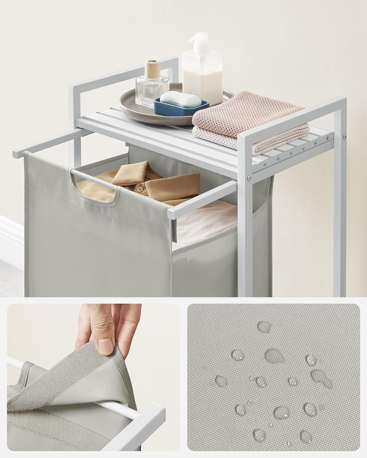 Dimensiunile produsului: 50L x 33W x 72H centimetri Marca: VASAGLE Culoare: Alb Material: Lemn prelucrat, otel aliat, plastic Despre acest articol Cos unic pentru spatii mici: Acest cos de rufe unic de 65 L poate tine o saptamana de rufe pentru o persoana. Masurand 50 x 33 x 72 cm, acest cos compact este perfect pentru a maximiza spatiile mici si colturile din baie, spalatorie sau dormitor. Raft de depozitare cu sipci: Acest cos de rufe are un raft, oferind spatiu suplimentar pentru a organiza detergentii sau articolele de toaleta. Designul sau cu sipci permite aerului sa circule pentru o buna ventilatie, prevenind acumularea de mirosuri de la rufe Captuseala extrasa si detasabila: Captuseala este echipata cu un panou inferior din plastic pentru a preveni caderea si, datorita dispozitivului de fixare cu carlig si bucla, puteti scoate si indeparta fara efort captuseala pentru a o transporta cu usurinta la masina de spalat.Fabricat cu un cadru din tub de otel de 2 cm si panou MDF, acest cos de rufe suporta pana la 20 kg pe raftul superior. In plus, captuseala este confectionata din material Oxford hidrofug, iar cele patru picioare reglabile asigura stabilitate Versatil: Acest cos de rufe versatil se potriveste perfect in orice camera, fie ca este vorba de spalatorie, baie sau dormitor. Folositi-l pentru a va organiza rufele oriunde aveti nevoie de spatiu suplimentar.