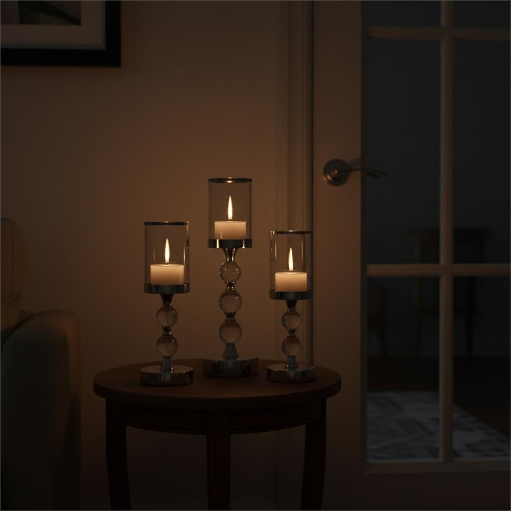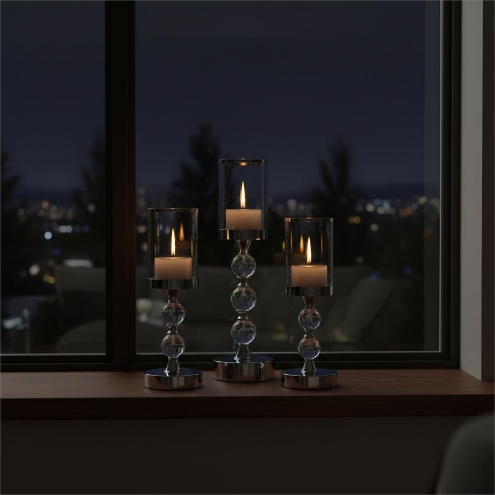 Set 3 sfesnice metalice cu glob cristal si abajur sticla, 28-41 cm, argintiu