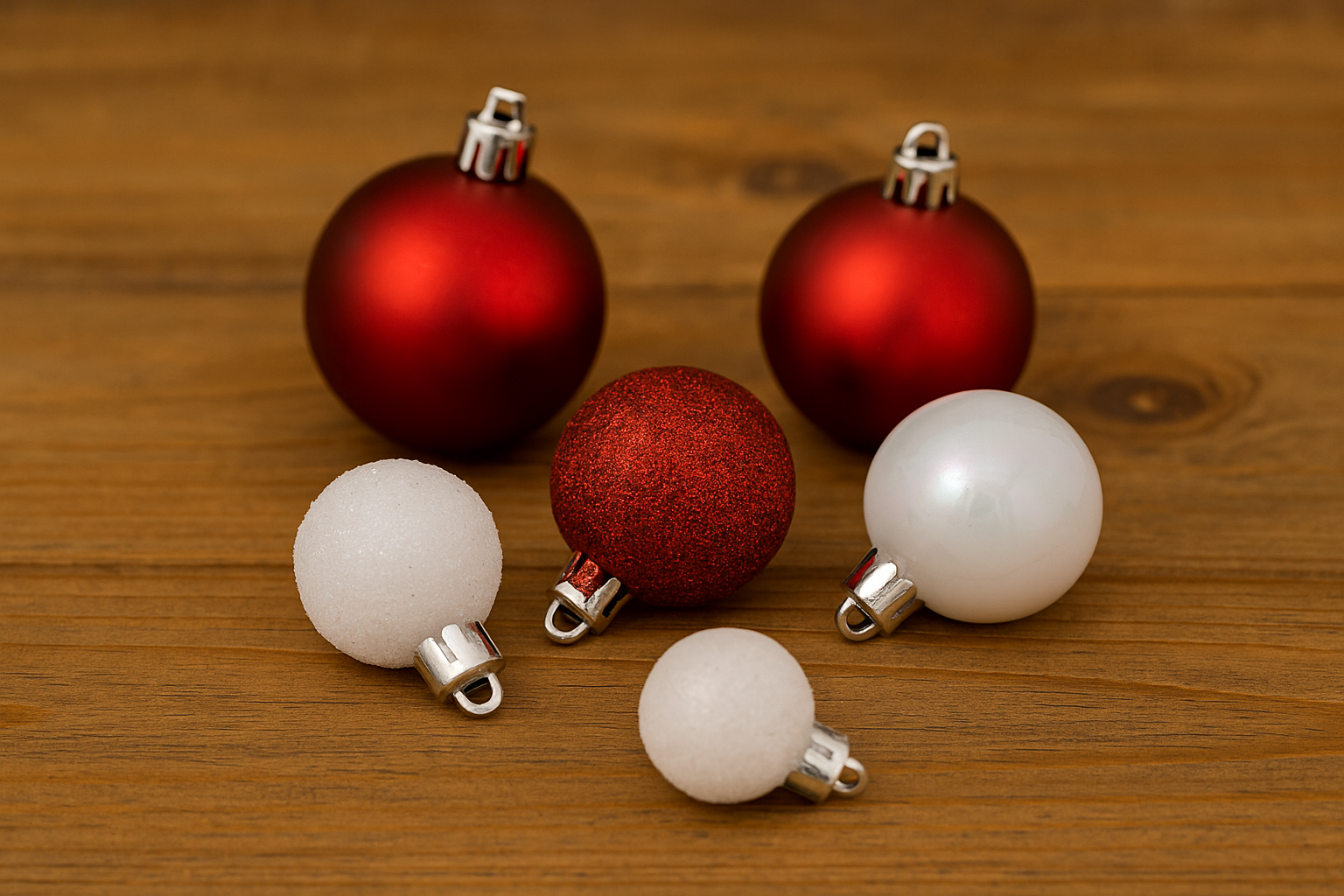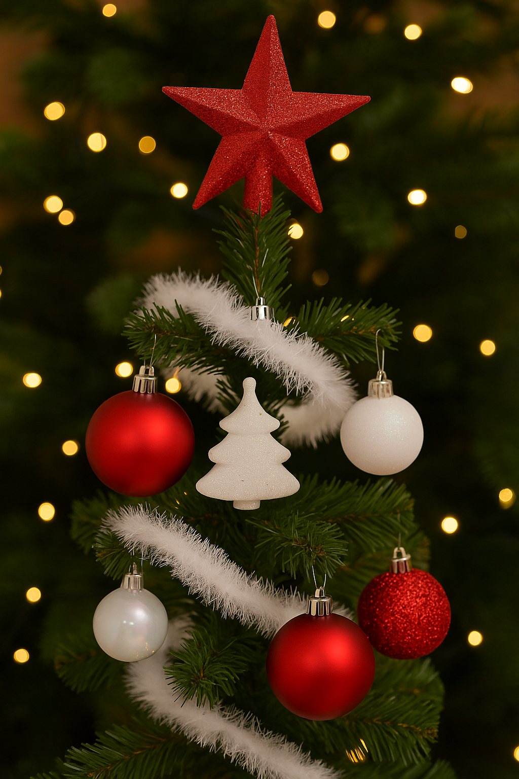 Specificatii tehnice Culoare: Rosu si alb Material: Polistiren (R_PS) Numar piese: 44 Continut set: 1 varf de brad alb, 1 ghirlanda, 18 globuri rosii 30 mm, 6 globuri albe 30 mm, 8 globuri rosii 60 mm, 4 globuri albe 60 mm, 4 globuri decorative 60 mm, 2 decoratiuni suspendate in forma de brad Dimensiuni produs: L. 270 x P. 8 x H. 8 cm Scurta descriere Set complet de decoratiuni pentru bradul de Craciun in nuante clasice de rosu si alb. Include globuri in doua dimensiuni, ghirlanda stralucitoare, varf de brad elegant si figurine suspendate, pentru un aspect festiv echilibrat si rafinat. Perfect pentru a crea o atmosfera calda si traditionala in timpul sarbatorilor. Caracteristici principale Set complet de 44 piese pentru bradul de Craciun Include globuri, ghirlanda, varf si decoratiuni suspendate Combinatie clasica de rosu si alb pentru un efect festiv Fabricat din polistiren usor si rezistent Ambalat practic in cutie transparenta