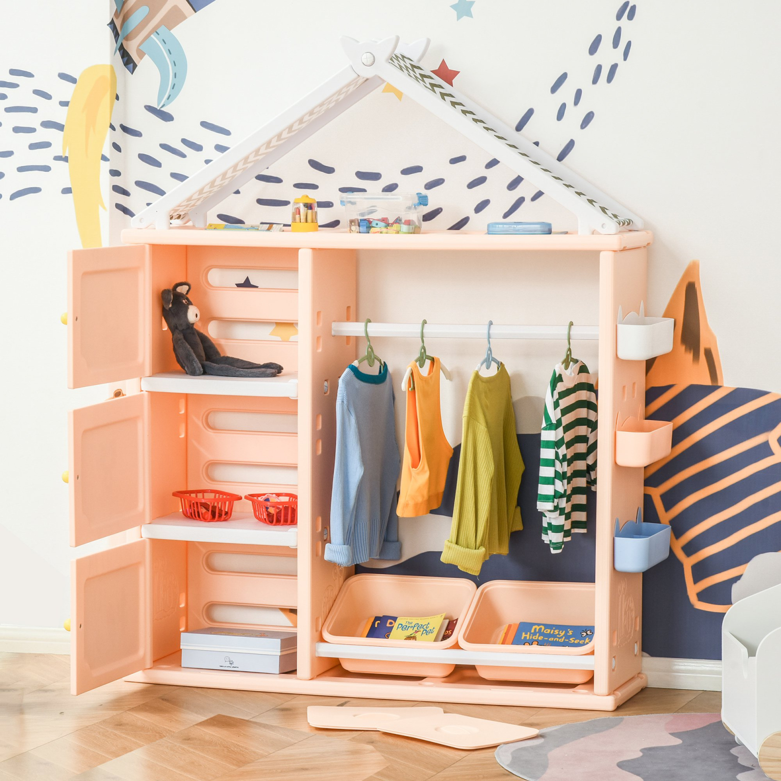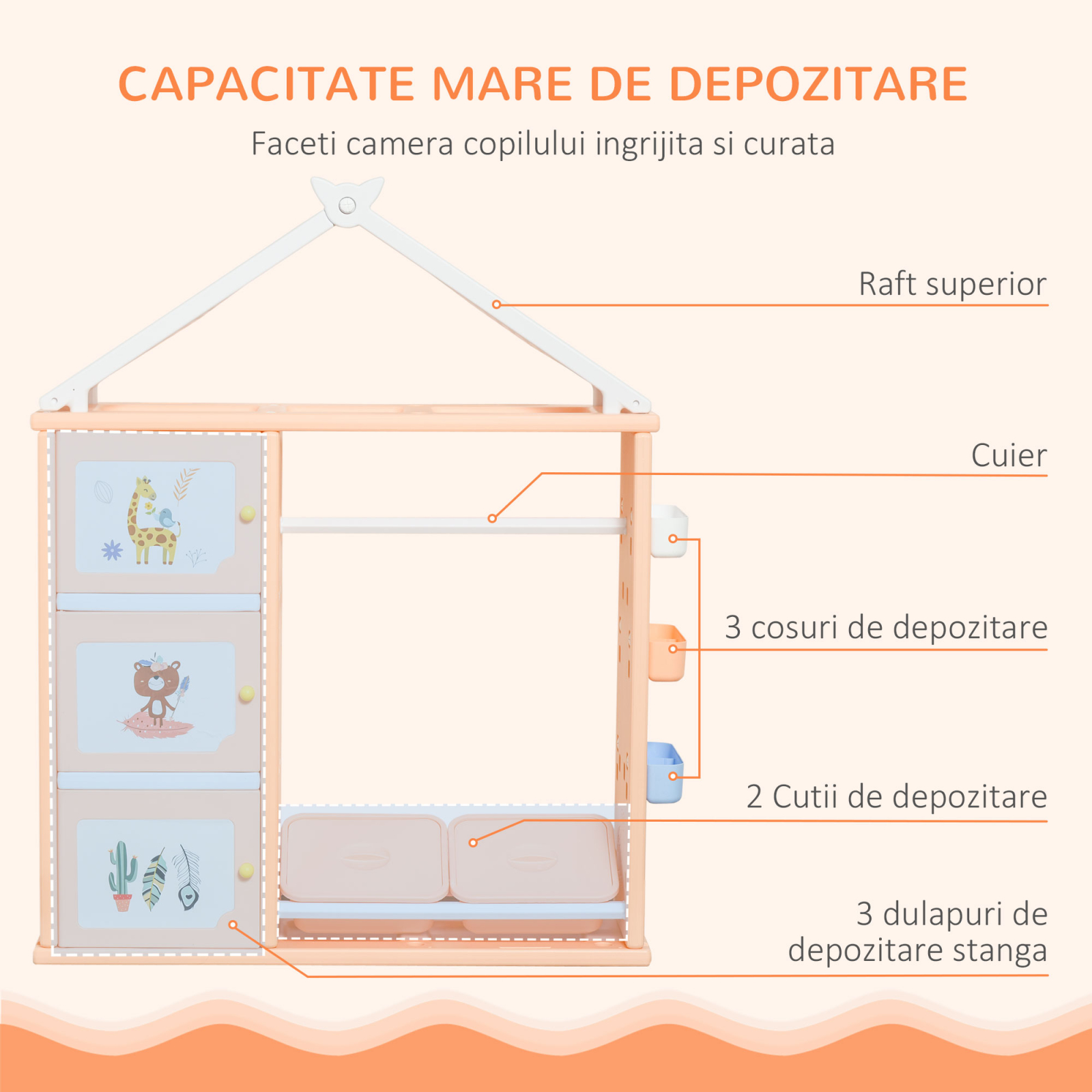Si cine a spus ca a face ordine in camera copiilor este plictisitor? Cu acest mobilier pentru jucarii este nevoie de un moment pentru a pune totul la loc. Cum? Datorita celor 3 dulapuri, celor 2 containere inferioare, celor 3 cosuri laterale si cuierului construit pentru copii. In acest fel, chiar si micutii dvs. isi pot agata hainele si isi pot rearanja jucariile in containerele speciale singuri.