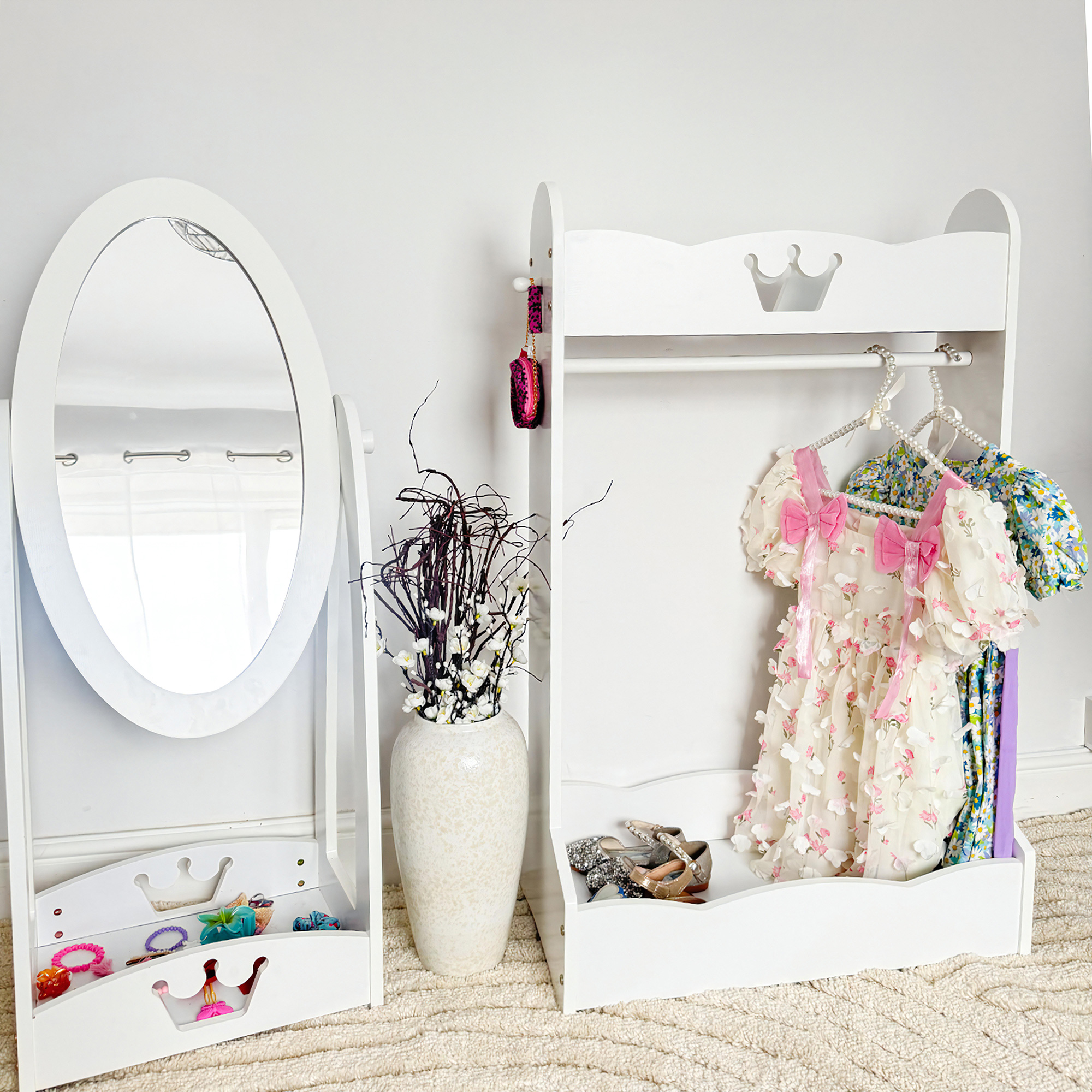 Fa-ti camera copilului mai ordonata cu suportul pentru haine pentru copii [BRAND NAME]. Aceasta structura este perfecta pentru a-i obisnui pe cei mici sa-si pastreze totul in ordine si sa gaseasca spatiu pentru fiecare lucru. Bara superioara si agatatoarele laterale permit atarnarea hainelor, in timp ce etajerele superioare si inferioare sunt ideale pentru depozitarea pantofilor, jocurilor si multor altora. Structura suportului pentru haine pentru copii este stabila si datorita designului sau minimalist il poti pozitiona in diferite incaperi ale casei tale.