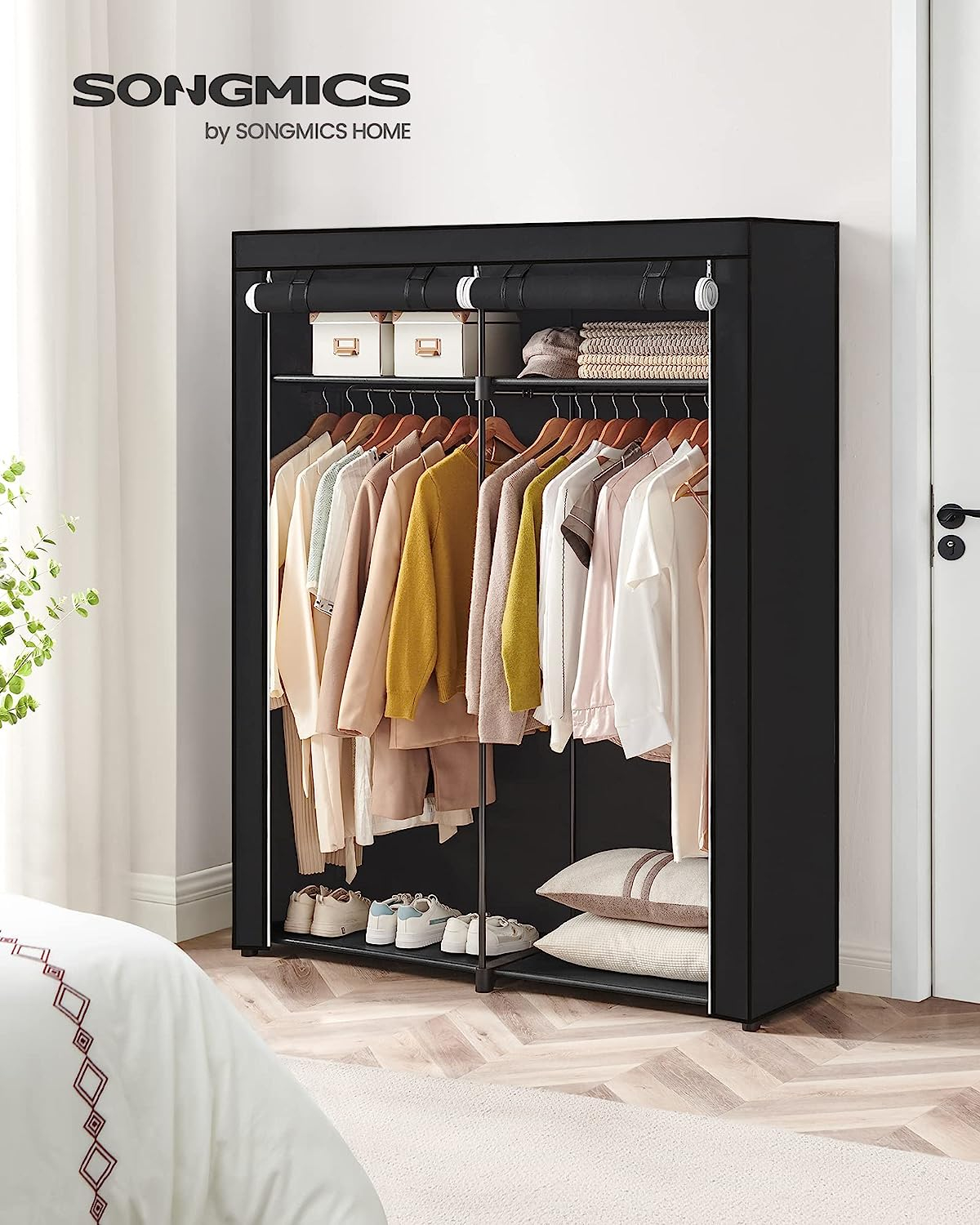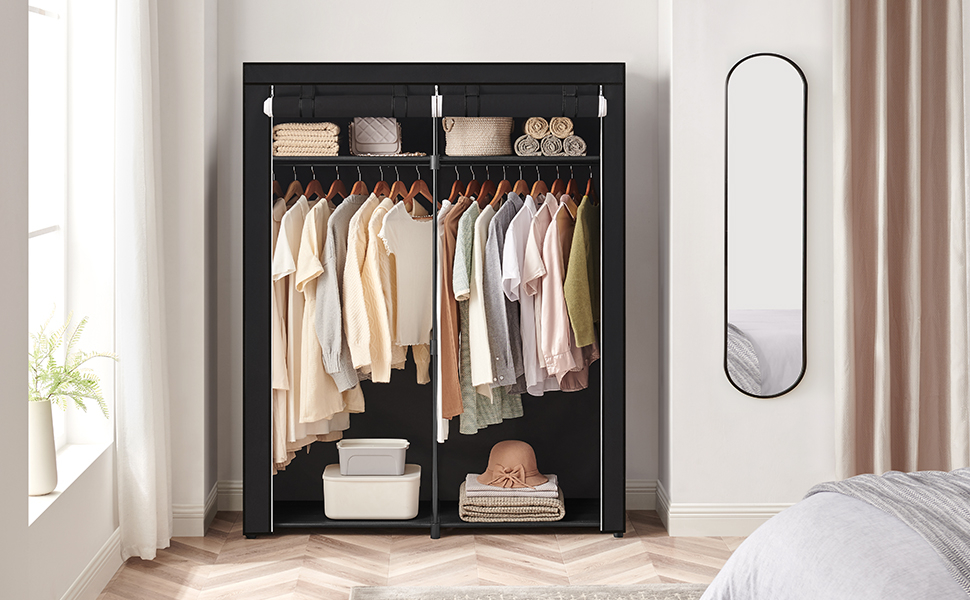 Specificatii: Culoare: Negru Material: Tesatura netesuta, tub metalic, conector din plastic Dimensiunea produsului: 43 x 140 x 174 cm (D x L x H) Greutatea produsului: 5,4 kg Capacitate de incarcare per strat: 10 kg Capacitatea de incarcare a sinei de suspendare: 30 kg Capacitate de incarcare totala: 80 kg Despre acest articol Agatati-va hainele in mod ordonat pe cele 2 sine pentru haine, iar gentile, sepcile si sosetele pe cele 2 rafturi reglabile. Totul isi gaseste locul in acest dulap spatios.Fiecare sina pentru haine (grosime perete 0,4 mm) suporta pana la 30 kg; fiecare raft din material textil este sustinut de 4 tuburi metalice (diametru 16 mm) si conectori din plastic robusti, cu doua fete si poate sustine pana la 10 kgHusa din tesatura, dotata cu fermoar si inchizatori cu carlige si bucle, a fost aleasa cu grija pentru a va depozita hainele in mod corespunzator.Conectorii sunt toti la fel. Nu este nevoie sa ii identificati si nu sunt necesare unelte; doar atasati tuburile la conectorii din plastic si gata!