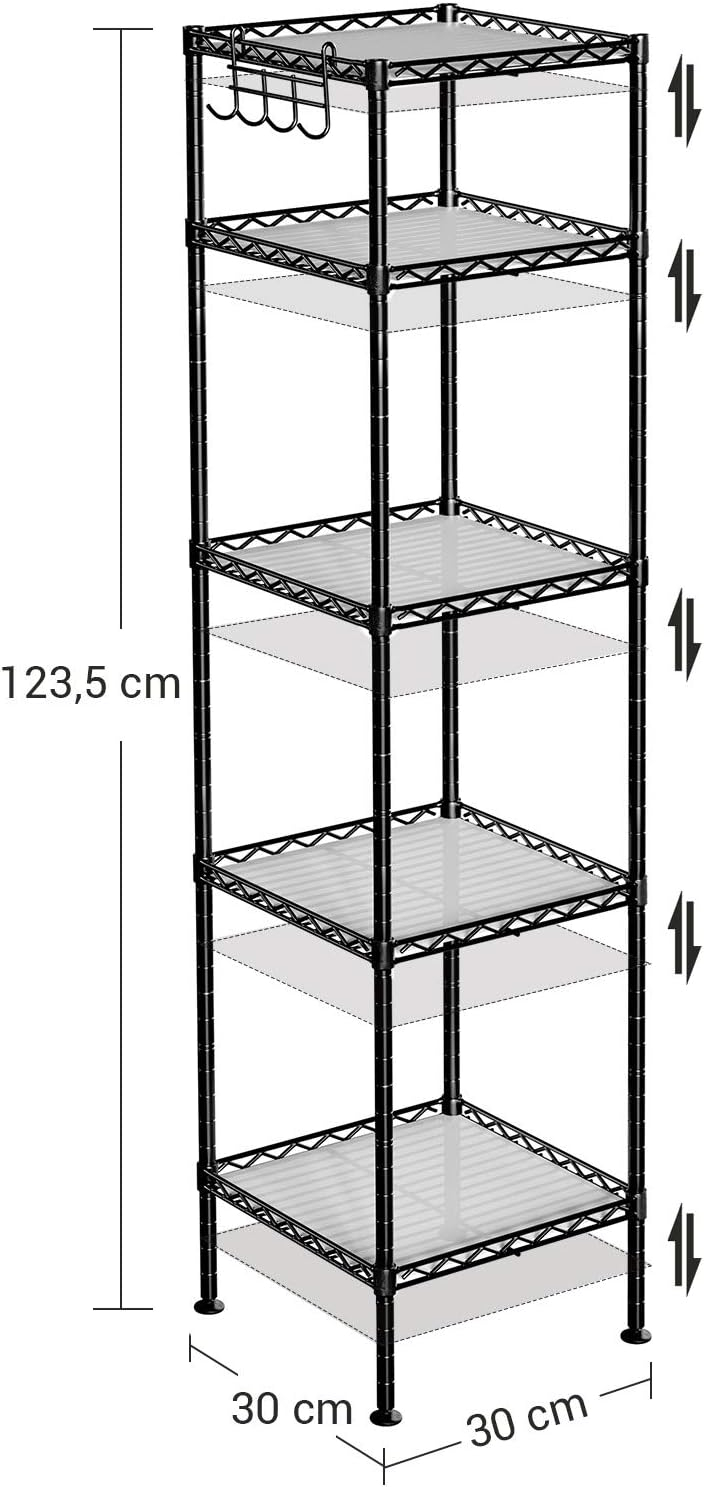 Specificatii tehnice: Material: Otel vopsit electrostatic, plastic PP Culoare: Negru si translucide Dimensiuni produs: 30 x 30 x 124 cm (L x A x I) Capacitate maxima per raft: 20 kg Numar niveluri: 5 Tip montaj: Pe podea Accesorii incluse: 4 carlige detasabile, 4 picioare reglabile, 2 sisteme anti-rasturnare Caracteristici speciale: Rafturi ajustabile pe inaltime, structura extensibila, usor de asamblat fara unelte Scurta descriere: Ideal pentru spatiile mici, acest raft vertical SONGMICS ofera 5 niveluri de depozitare intr-o amprenta compacta de doar 30 x 30 cm. Fabricat din otel vopsit cu rafturi din plastic PP, este potrivit pentru baie, bucatarie, camara sau balcon. Fiecare nivel suporta pana la 20 kg, iar rafturile pot fi ajustate in functie de nevoile tale. Se asambleaza rapid, fara scule, si vine cu carlige si picioare reglabile pentru stabilitate sporita. Caracteristici principale: Design compact, ideal pentru spatii reduse Structura metalica rezistenta cu 5 niveluri Rafturi ajustabile si protectii din plastic PP Include carlige si sistem anti-rasturnare Asamblare rapida fara unelte Potrivit pentru baie, bucatarie, camara sau balcon