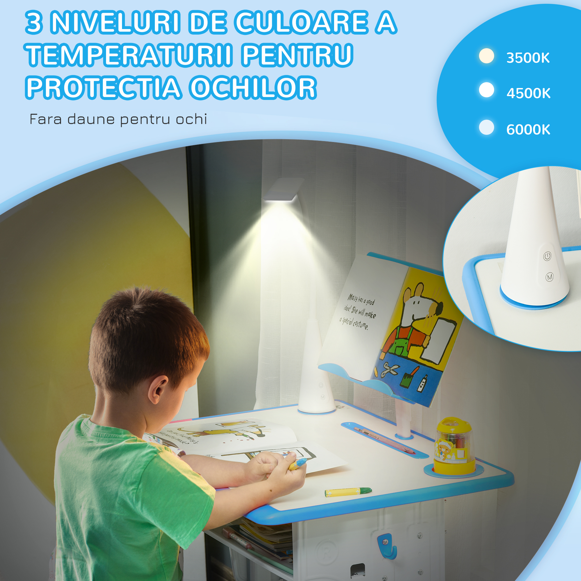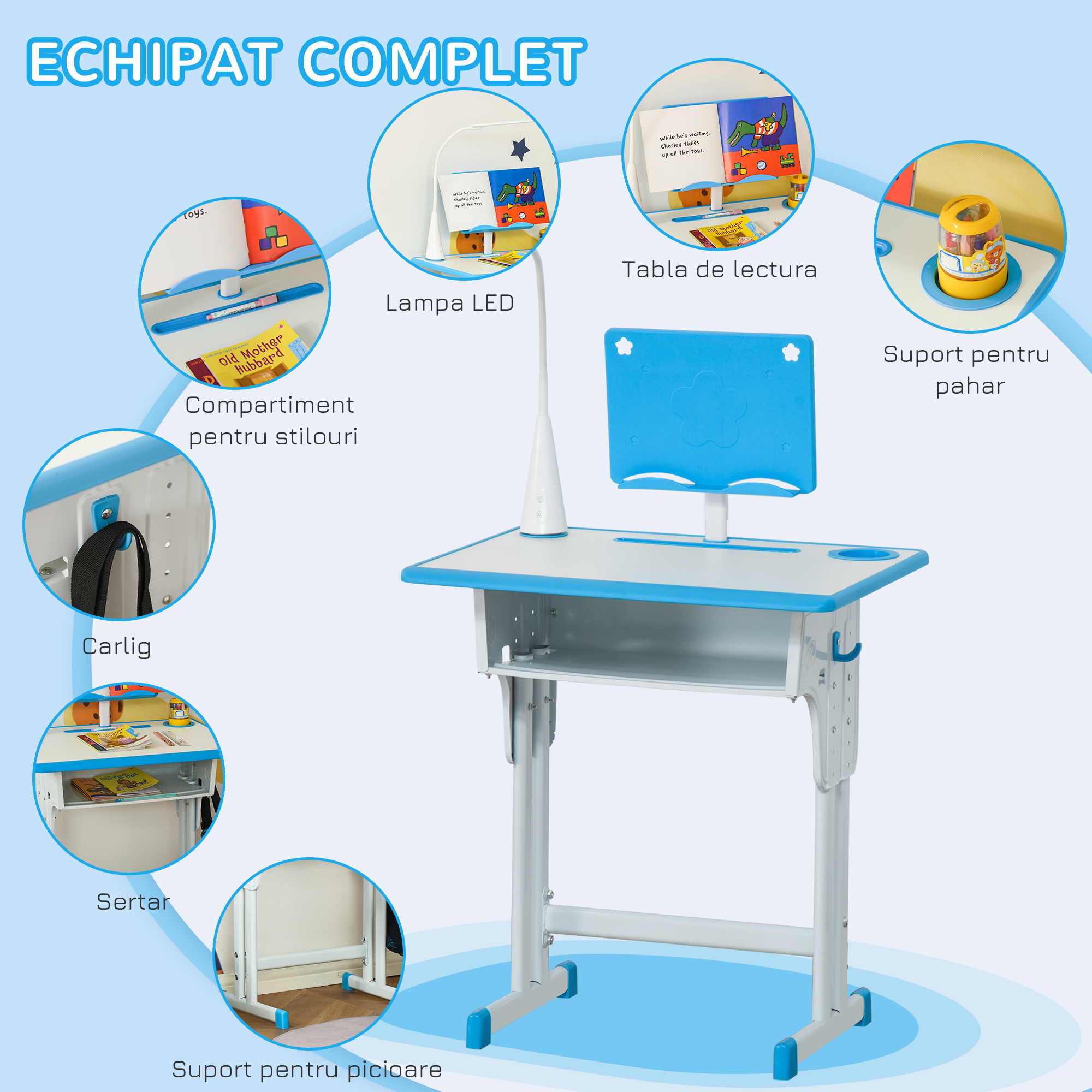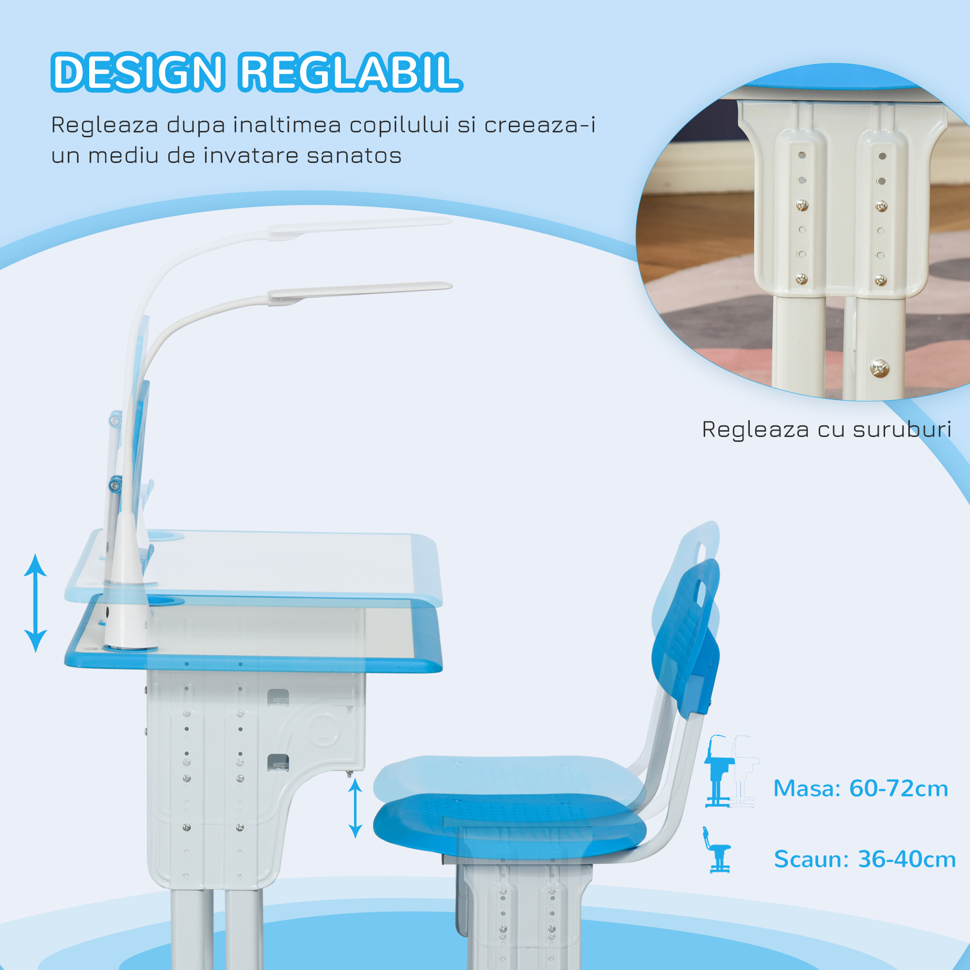 Creeaza un spatiu de studiu ergonomic pentru copilul tau cu banca [BRAND NAME], proiectata pentru copii intre 6 si 12 ani. Reglabila pe inaltime, se adapteaza cresterii copilului, asigurand o pozitie corecta pentru scris si citit. Include scaun confortabil si lampa integrata, perfecta pentru orele de studiu seara. Constructia rezistenta si designul in nuante albastre fac din acest set o alegere practica si moderna pentru camera elevilor.