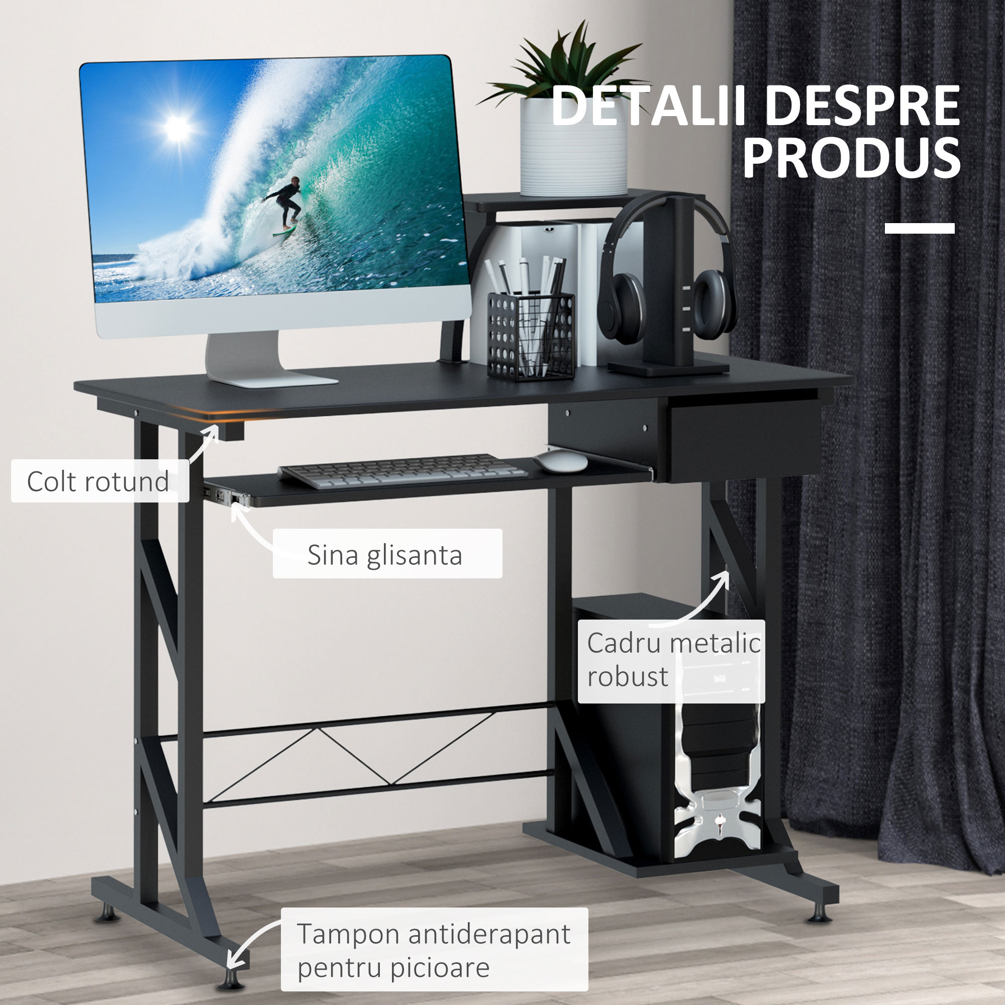 [BRAND NAME] birou calculator, cu suport glisant, 90x50x95 cm poate fi o solutie pentru orice camera sau birou. Este un obiect de mobilier special creat pe care puteti aseza calculatorul cu orice accesoriu necesar pentru acesta. Dispune de suficient spatiu pentru tot ce aveti nevoie. [BRAND NAME] birou calculator, cu suport glisant,90x50x95 cm este realizat din placi de MDF si are suportul din otel. Asta inseamna ca este foarte stabil si rezista bine in timp. Il puteti curata cu ajutorul unei lavete umede.