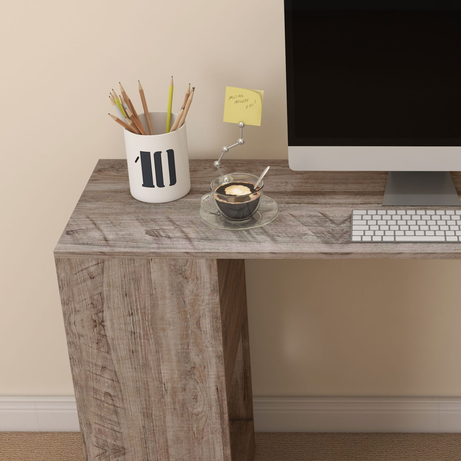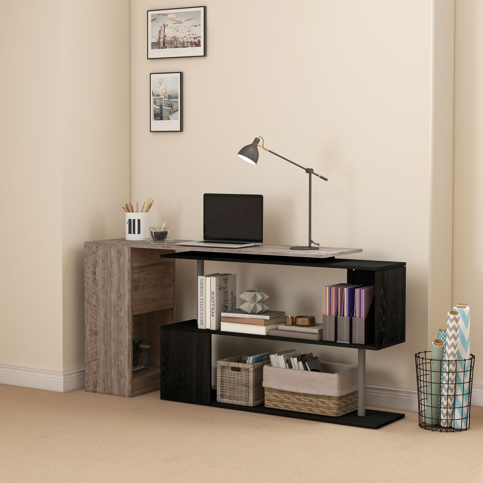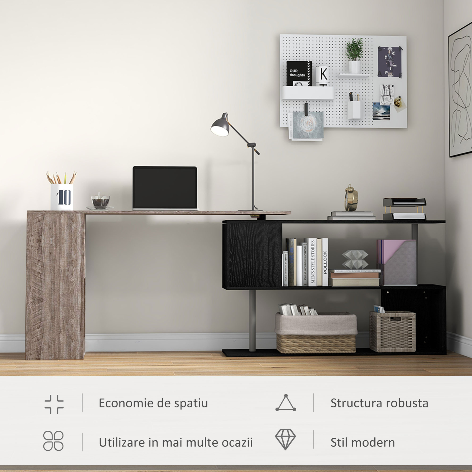 Ai putin spatiu disponibil? Amenajeaza-ti camera sau biroul cu acest birou de colt [BRAND NAME]. Structura are un blat de lucru spatios si o biblioteca laterala care poate fi folosita pentru a aranja documente, carti sau accesorii de birou. Acest birou de colt poate fi folosit si ca masa de dining.