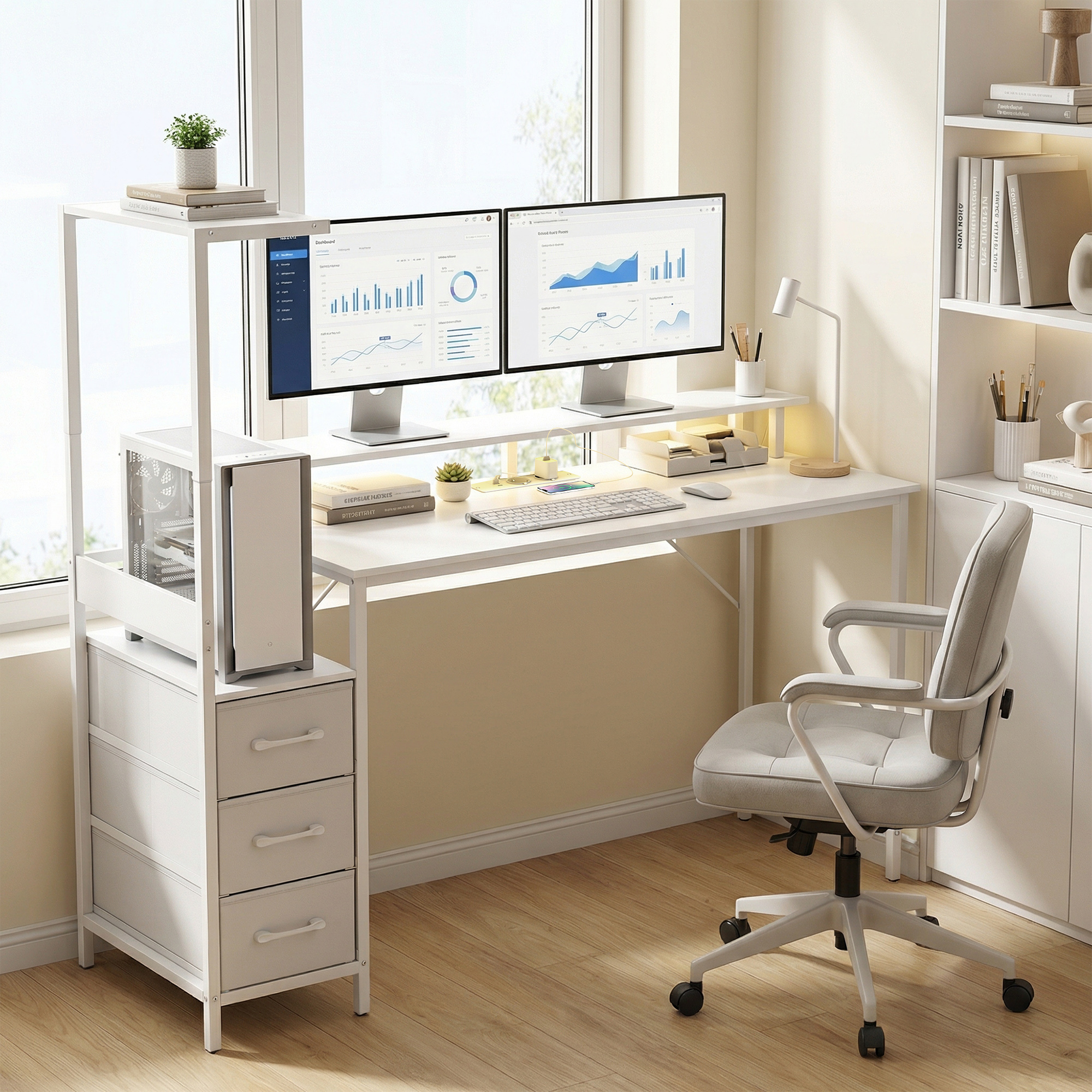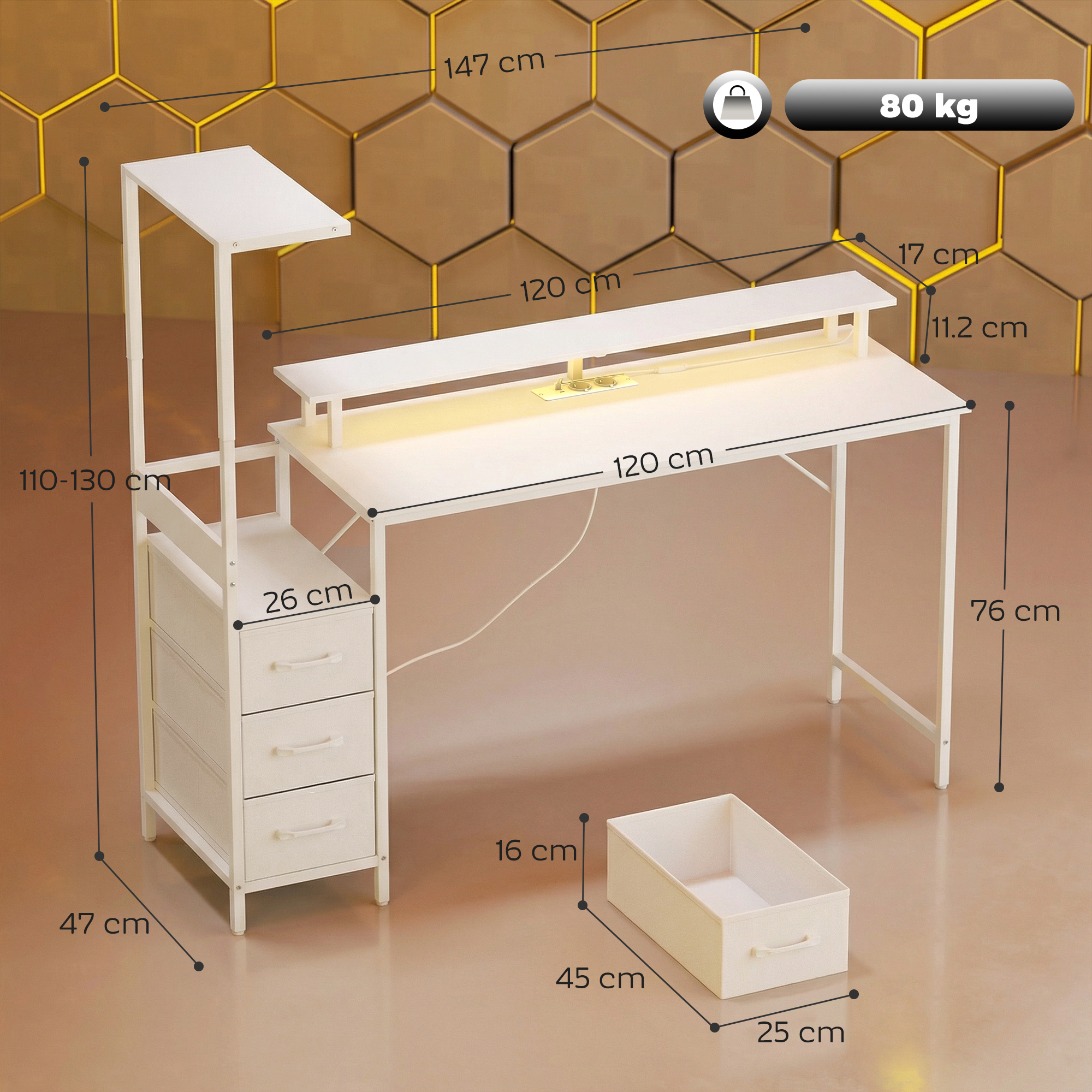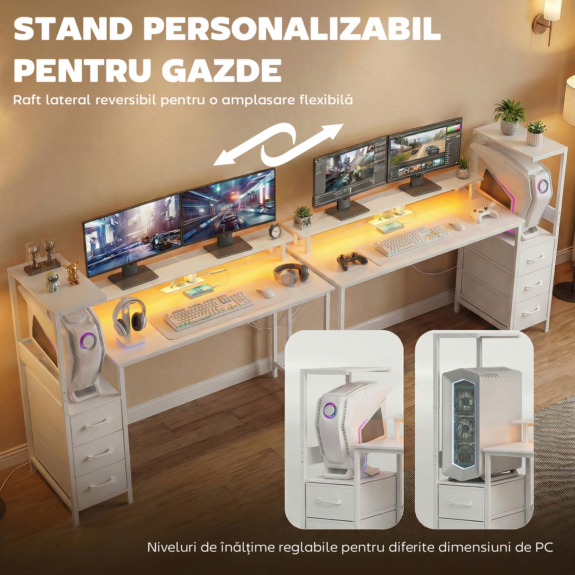 Zonele de lucru dezordonate distrag atentia. Biroul de gaming [BRAND NAME] organizeaza totul: suport reglabil pentru carcasa PC, suprafata spatioasa, suport pentru monitor de 120 cm pentru ecrane de pana la 27″, statie de alimentare integrata, trei sertare din material textil si banda LED RGB cu 7 culori, creand un mediu personalizat pentru gaming, studiu sau munca.