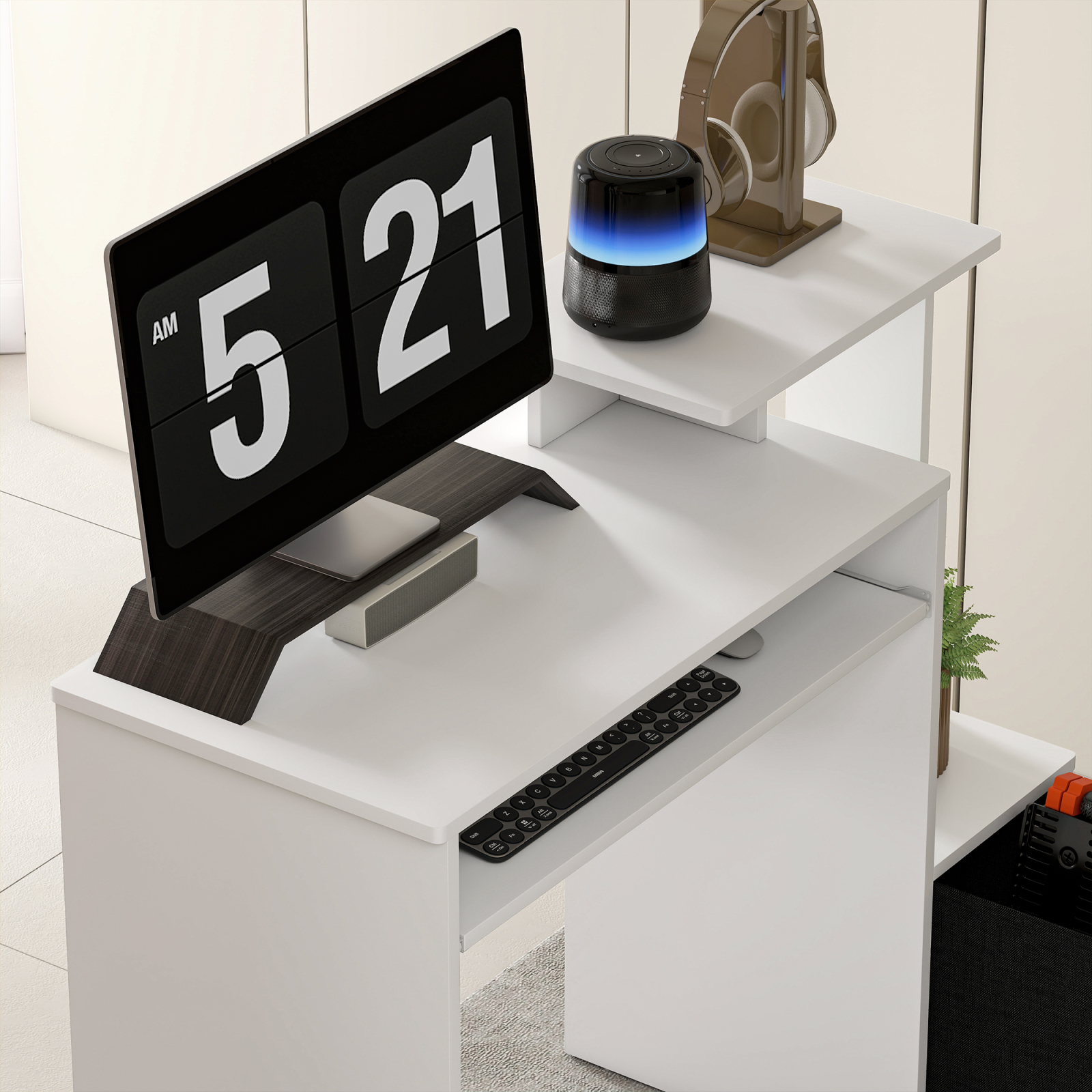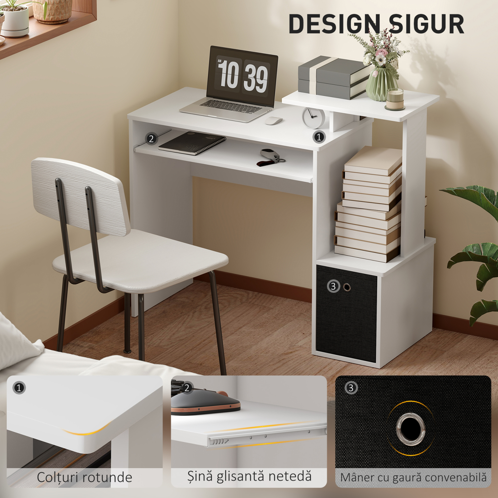 Biroul modern ofera o statie de lucru completa, cu suport pentru tastatura glisant, raft superior si zona laterala pentru depozitare. Constructia compacta din materiale durabile il face ideal pentru lucrul de acasa sau studiu. Designul sau curat adauga functionalitate fara a incarca spatiul.
