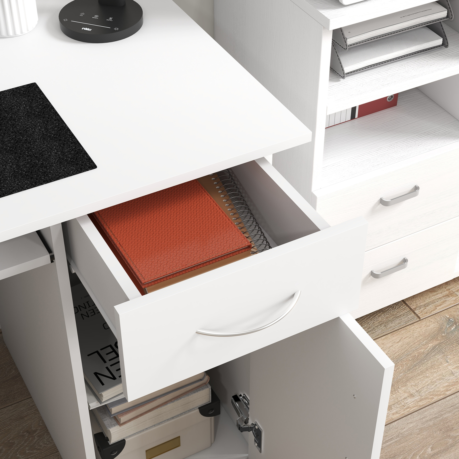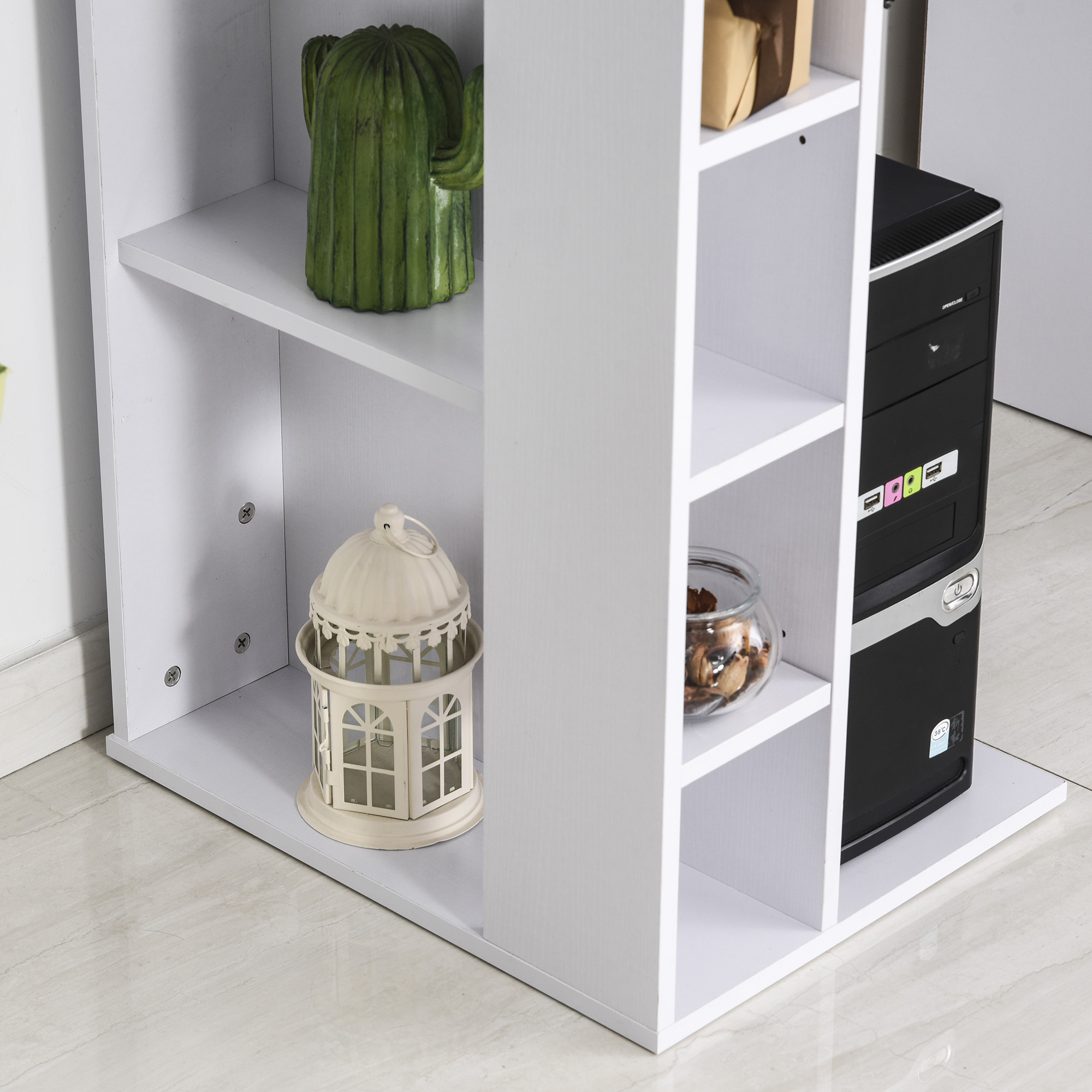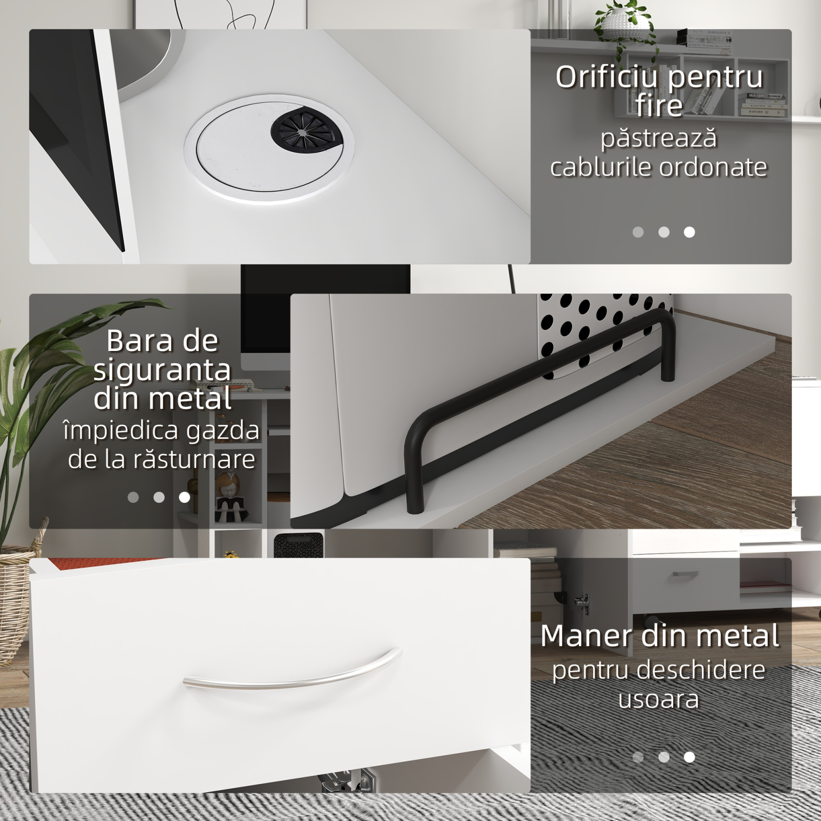 [BRAND NAME] birou pentru PC, cu rafturi, 120x60x74 cm, alb este tipul de mobilier potrivit pentru clasica varianta de calculator. Veti descoperi ca este practic si compact, prevazut cu detalii si rafturi care va ajuta sa va organizati cat mai bine. [BRAND NAME] birou pentru PC, cu rafturi, 120x60x74 cm, alb are raft pentru tastatura, alte 3 rafturi deschise pe laterala, suport pentru unitate si dulap cu sertar pe partea cealalta. Acestea din urma au manere lucioase, gri. Realizat din PAL alb.