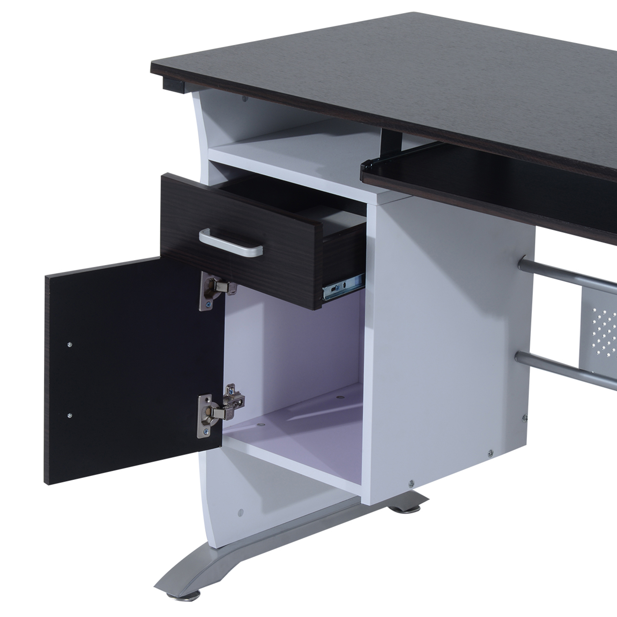 Acest birou pentru PC cu un design clasic si modern este perfect potrivit pentru studio, dormitor si birou. Ideal pentru desktop sau laptop. Economisind spatiu, dar multifunctional. Pe langa faptul ca ofera un spatiu mare de lucru sau de studiu, acesta ofera si un raft glisant pentru tastatura, un sertar si un compartiment de depozitare. Fabricat din lemn MDF, cadru metalic. Rezistent la zgarieturi.