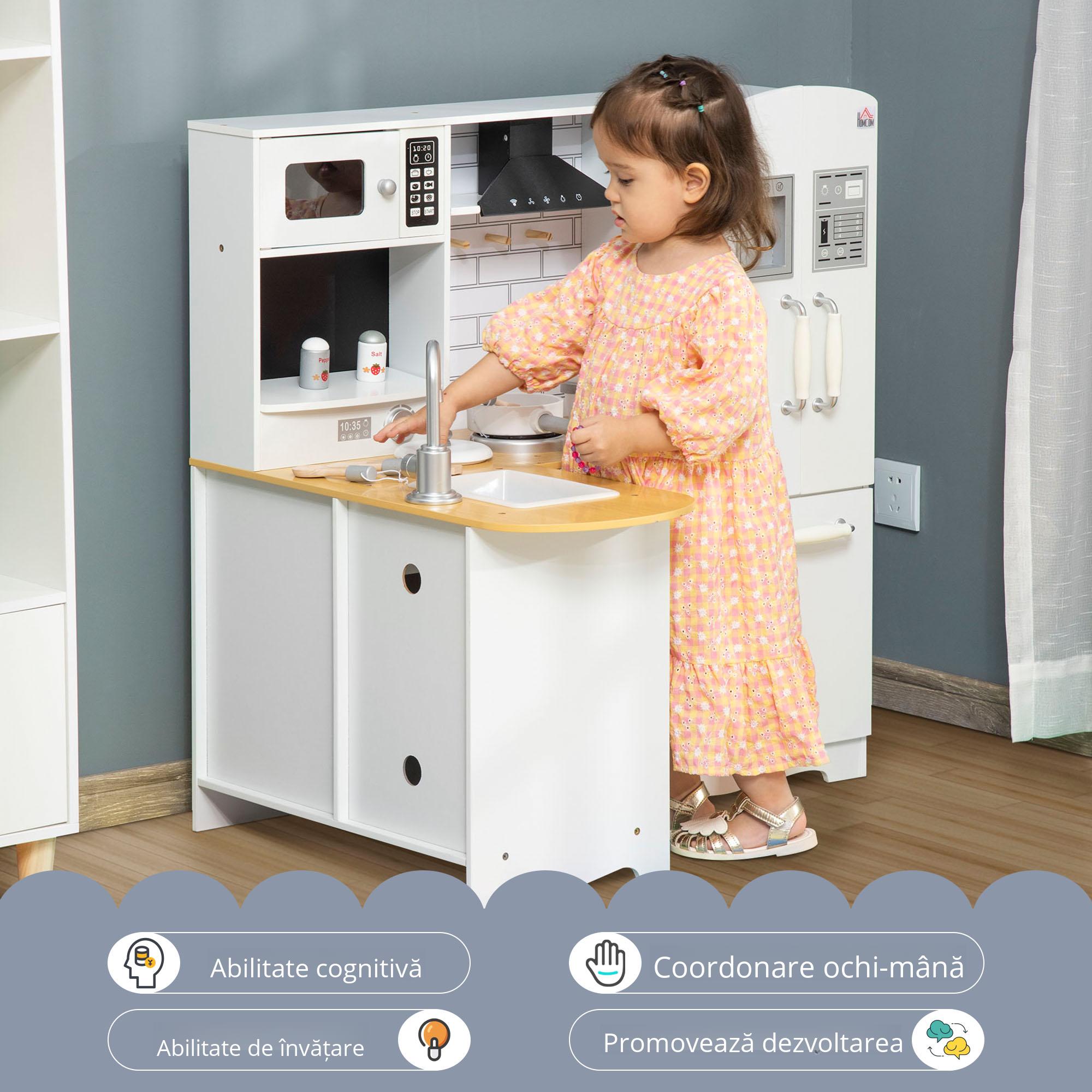 Ofera copiilor ore de distractie creativa cu bucataria de jucarie [BRAND NAME], realizata din lemn rezistent si dotata cu 14 accesorii. Include chiuveta, cuptor si spatii de depozitare pentru o experienta realista de gatit. Ideala pentru copii intre 3 si 6 ani, stimuleaza imaginatia, coordonarea si jocul de rol. Designul modern si culorile atractive o fac alegerea perfecta pentru camera copiilor sau spatiile de joaca.