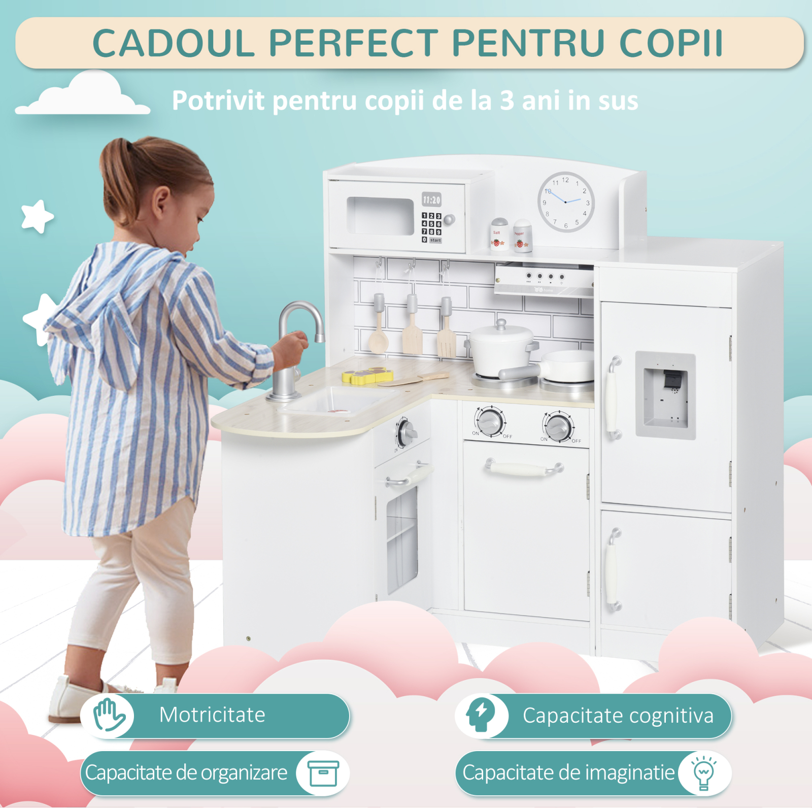 Stimuleaza imaginatia copiilor cu bucataria jucarie [BRAND NAME], realizata din lemn rezistent si dotata cu chiuveta, frigider, aragaz si microunde. Include accesorii care imita ustensile reale, transformand joaca intr-o experienta educativa. Designul alb elegant se integreaza in camera copilului, iar dimensiunile generoase permit jocul interactiv. Ofera ore intregi de distractie creativa, dezvoltand abilitatile motorii si sociale.
