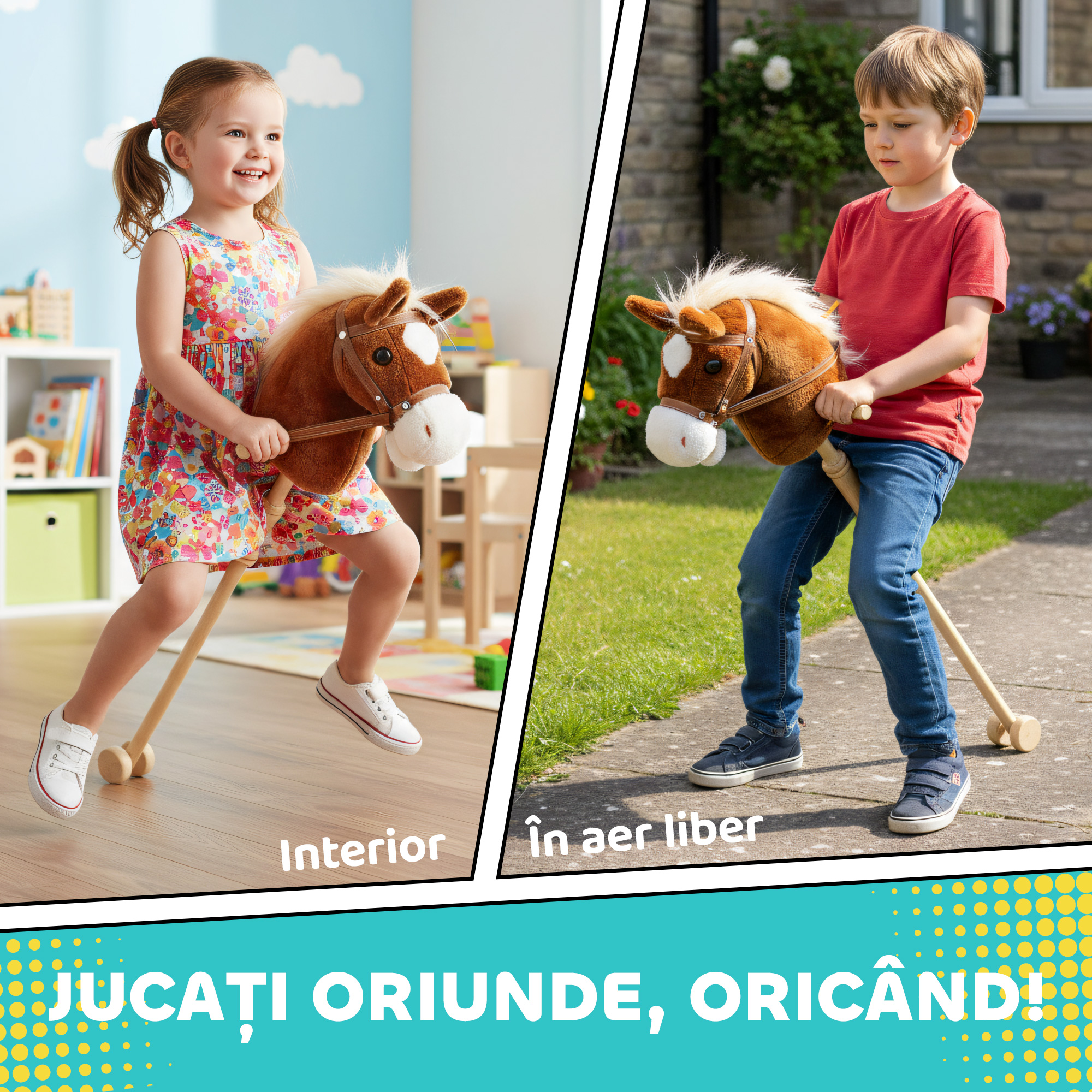 Acest cal pe bat [BRAND NAME] anima aventurile celor mici pentru a oferi ore de divertisment in aer liber sau in casa. Atingand urechea, se vor activa sunetele de galop sau nechezat, declansand imaginatia in timpul momentelor de joaca. Construit din poliester moale si lemn robust, acest joc pentru copii asigura liniste si siguranta in fiecare moment, fiind un prieten de nadejde pentru toate anotimpurile.