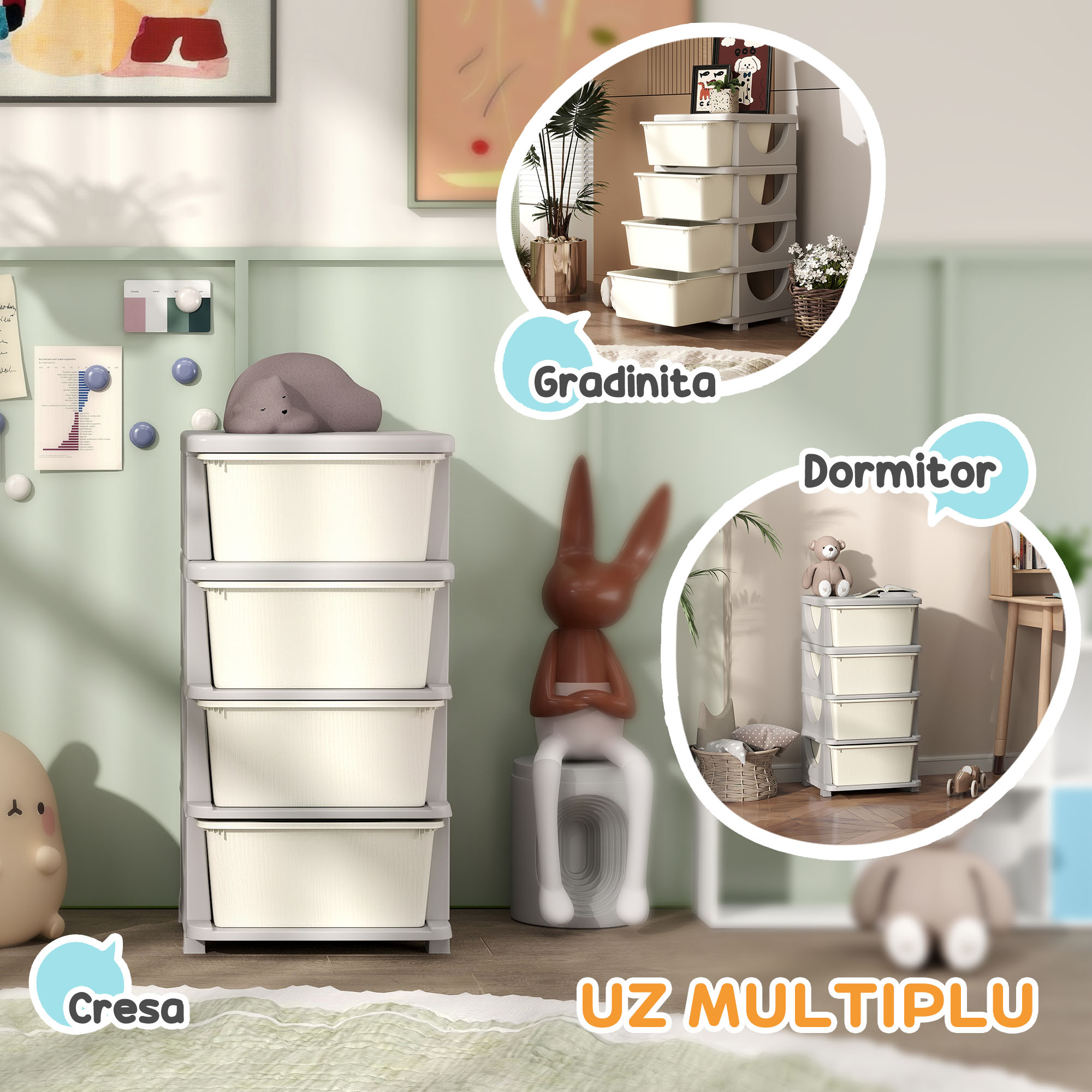 Comoda noastra cu 4 sertare [BRAND NAME] este solutia ideala pentru a-i invata pe copii sa-si organizeze jucariile si cartile, mentinand ordinea in jur. Fabricata din PP rezistent, structura este sigura si usor de curatat, cu margini netede pentru un plus de siguranta. Sertarele previn dezordinea, oferind un spatiu mereu ordonat si primitor.