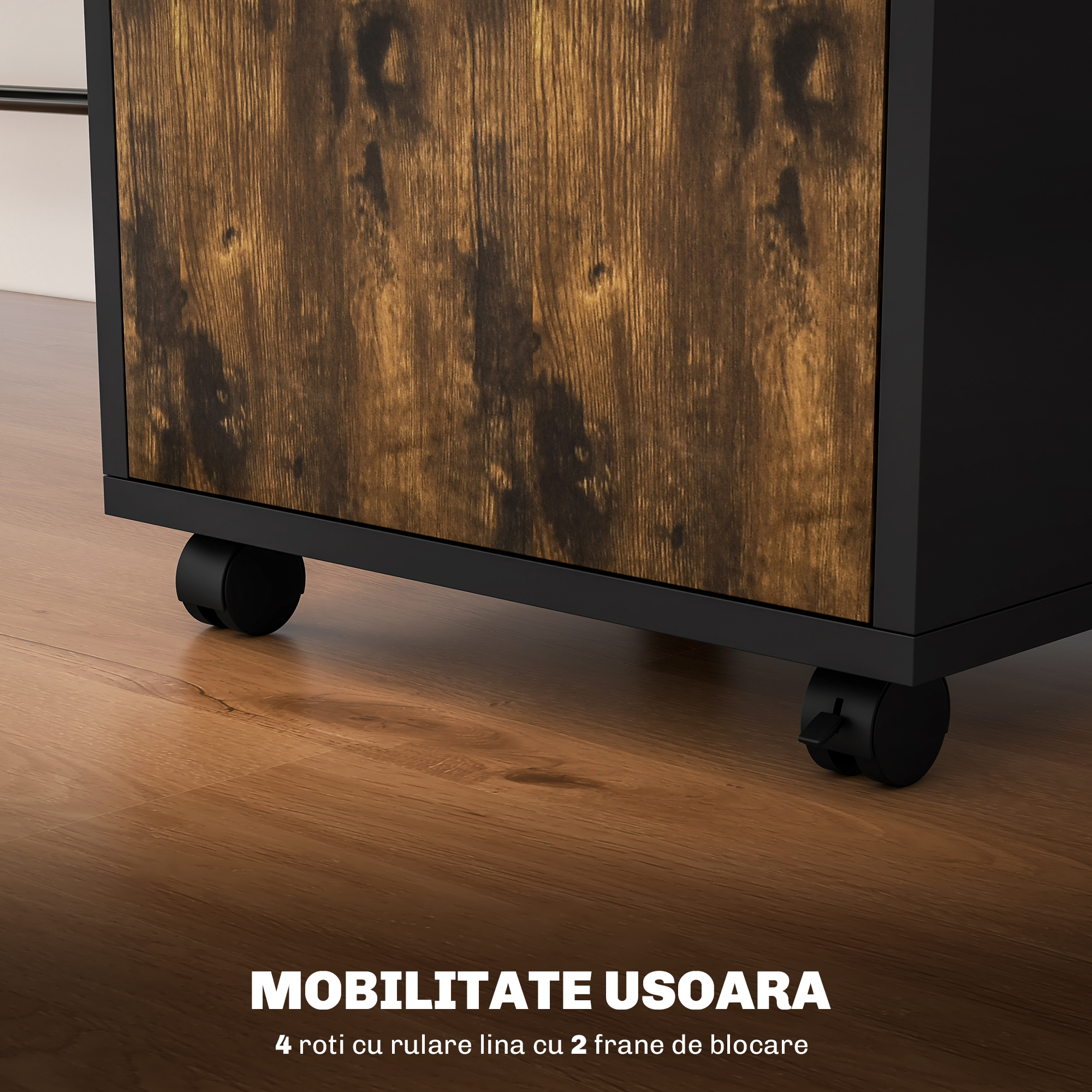 - 4 ROtI: Dulapul cu sertare este dotat cu 4 roti pivotante la 360°, dintre care 2 au frana, pentru a-l bloca in pozitia cea mai confortabila pentru tine
