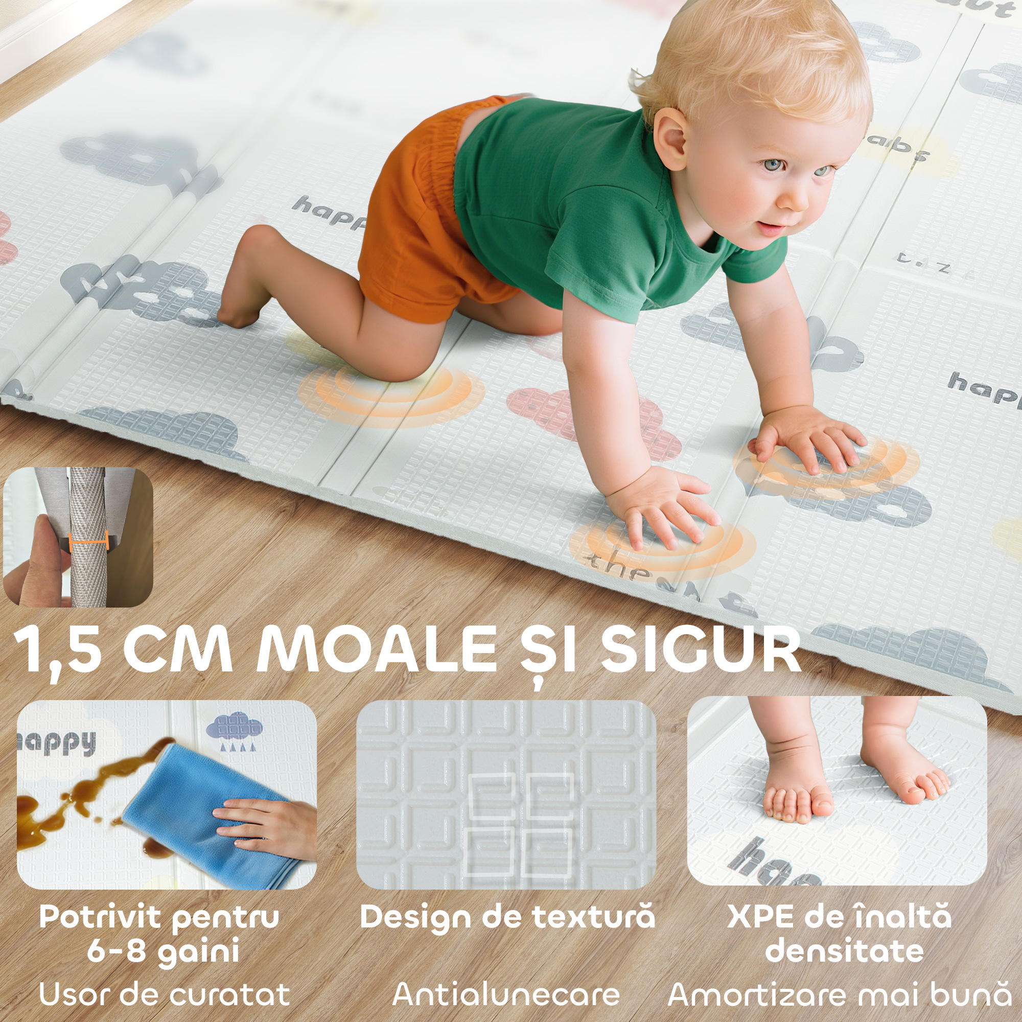 Covorasul pentru copii [BRAND NAME] este un punct de lansare catre primele aventuri ale celor mici, unde siguranta si explorarea se impletesc intr-un mediu de joaca. Designul sau cu litere ale alfabetului pe o parte stimuleaza curiozitatea pentru invatare, in timp ce materialul rezistent XPE asigura un mediu protejat. Datorita densitatii sale, covorasul amortizeaza caderile si permite copiilor sa invete si sa se joace fara probleme.