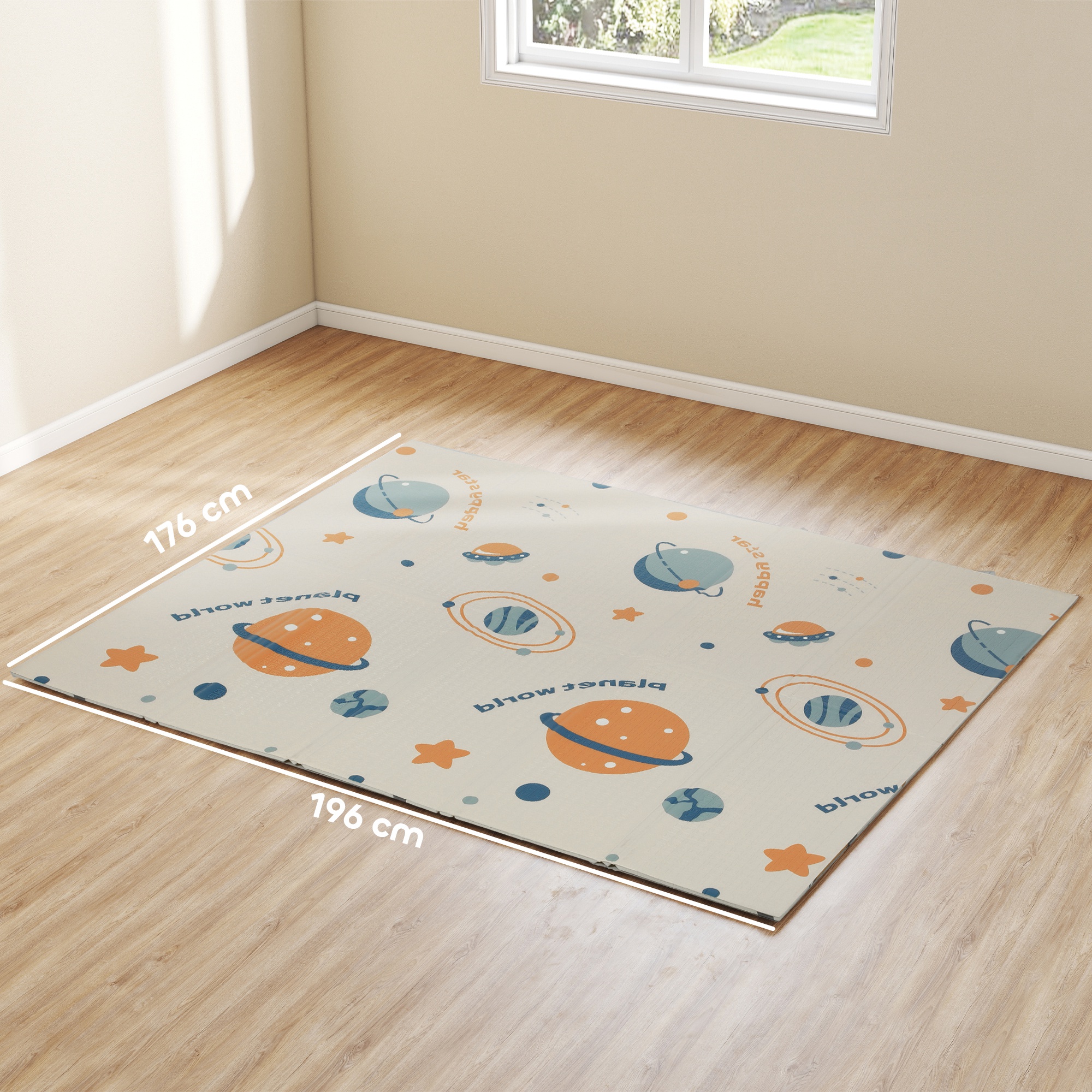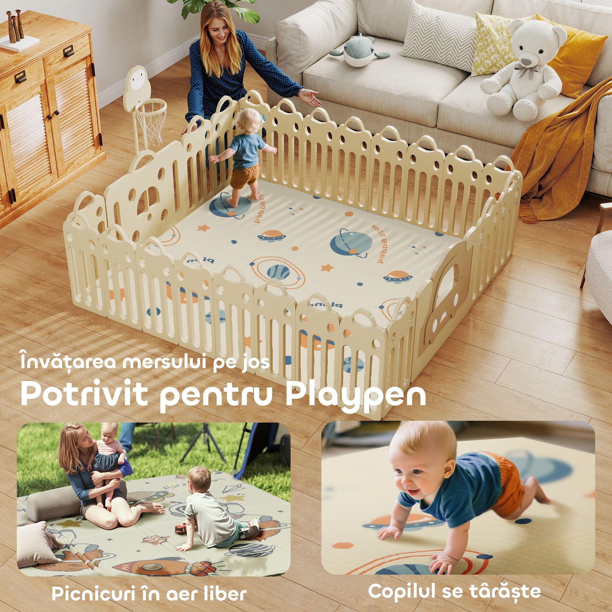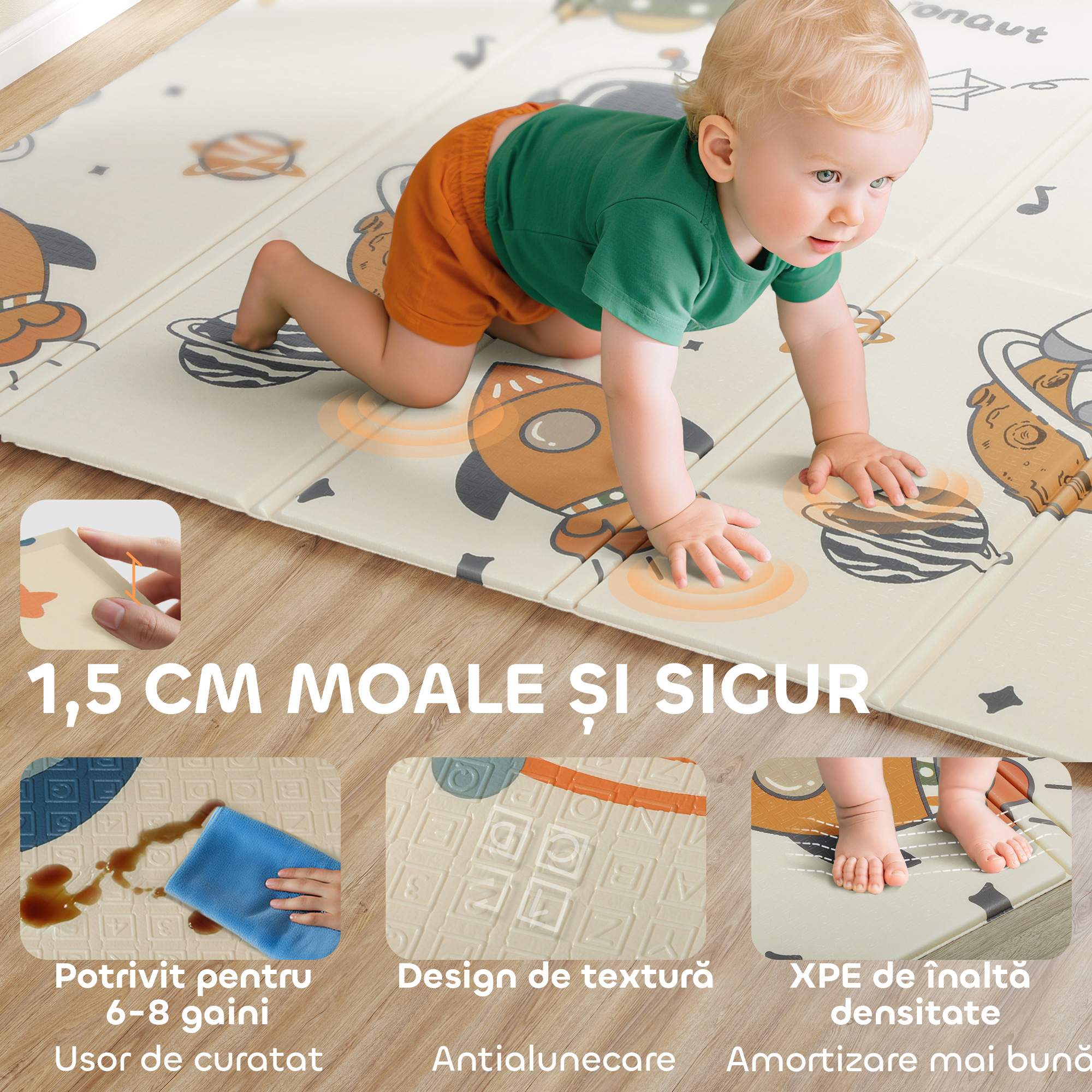 intr-o lume in care siguranta si explorarea sunt esentiale, covorasul de joaca [BRAND NAME] deschide celor mici drumul aventurii. Designul captivant cu astronauti si planete stimuleaza curiozitatea, iar materialul dens XPE ofera protectie. Captuseala de 1,5 cm absoarbe impactul cazaturilor, oferindu-i copilului tau siguranta de a descoperi lumea, in timp ce tu te bucuri de liniste.