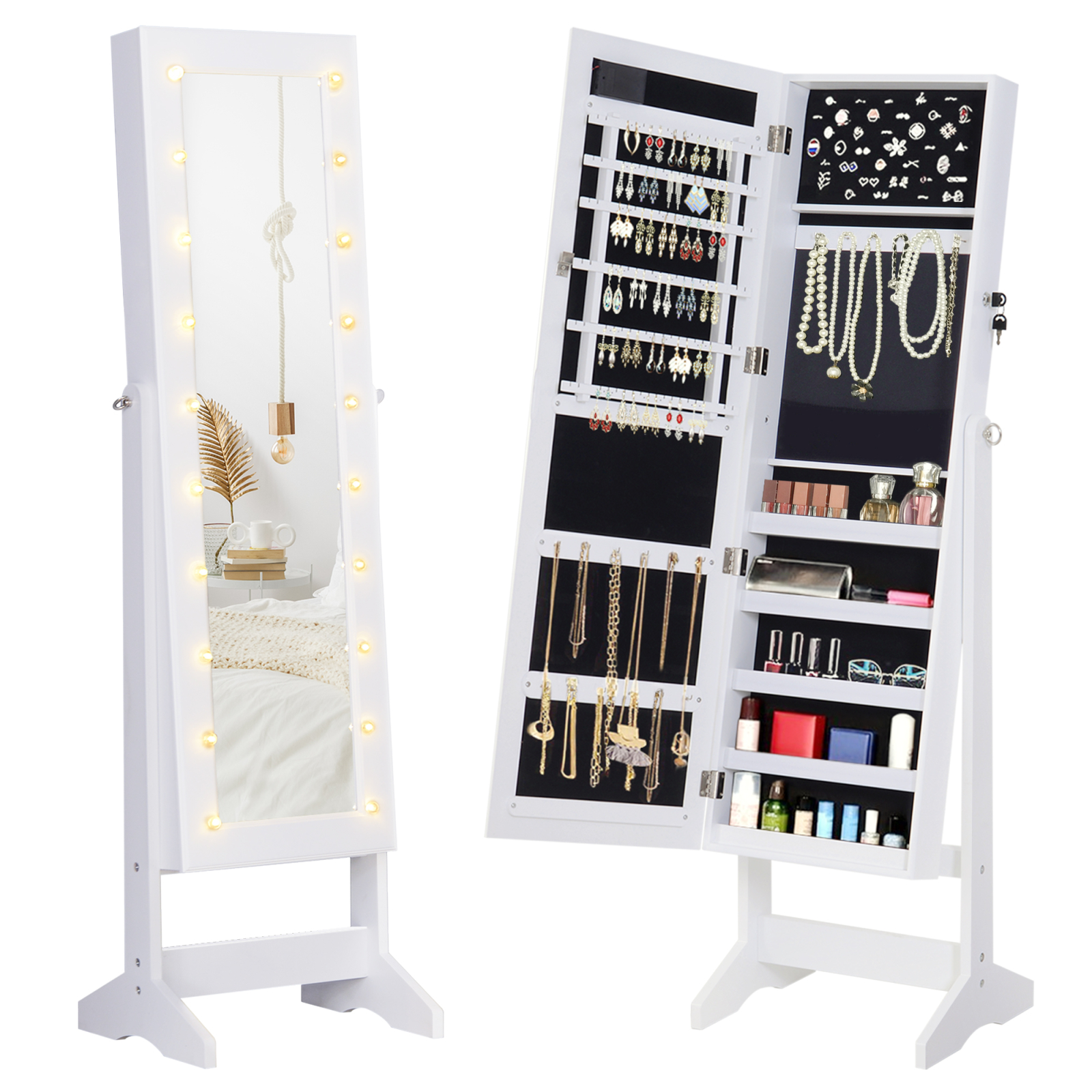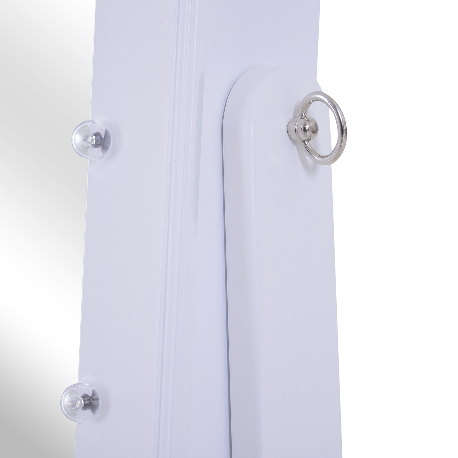 Poti aseza in ordine toate bijuteriile pe care le ai daca alegi [BRAND NAME] dulap bijuterii, oglinda si leduri incluse,40x37x146 cm. Aceasta piesa de mobilier are utilitate 2 in 1 pentru ca este o oglinda cu dulap inclus. Acest spatiu special amenajat pentru bijuterii dispune de 108 sloturi pentru cercei, 18 carlige pentru bratari si coliere, 5 rafturi si o carcasa. in toate aceste spatii iti poti aseza in siguranta bijuteriile si poti incuia mai apoi dulapul. [BRAND NAME] dulap bijuterii, oglinda si leduri incluse,40x37x146 cm vine la pachet cu doua chei pentru sistemul de siguranta. Oglinda este suficient de mare, astfel incat sa poti vedea intreaga tinuta. De asemenea, are si 20 de becuri LED care asigura o luminozitate mai buna si care poate deveni lumina de fundal din camera. Oglinda are 4 niveluri diferite pe care poate fi reglata, astfel incat sa o asezi exact asa cum preferi.