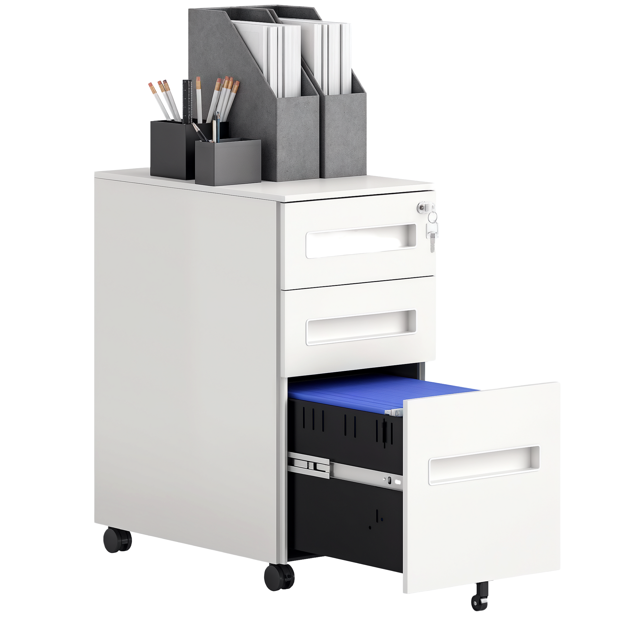 Descopera utilitatea si caracterul practic al fisierului nostru de birou [BRAND NAME] si pozitioneaza-l langa biroul tau pentru a organiza dosarele si furniturile. Dotat cu incuietoare, fisierul este compus din 2 sertare mai mici cu tava detasabila pentru papetarie si un sertar mai mare cu ghidaje adaptabile pentru depozitarea documentelor A4, in format legal si letter. Muta structura cu ajutorul rotilor sale pivotante la 360° si imbogateste-ti imediat biroul sau studioul!