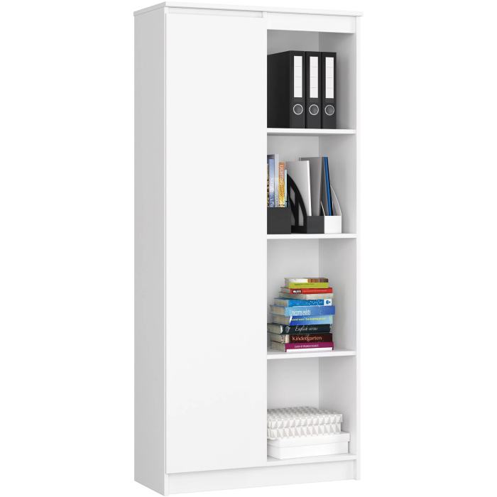 Biblioteca spatioasa pentru birou sau locuinta, prevazuta cu opt rafturi si o usa practica pentru depozitare discreta. Ofera loc suficient pentru dosare A4, carti si accesorii, fiind potrivita pentru camere de lucru, living sau camere de adolescenti.