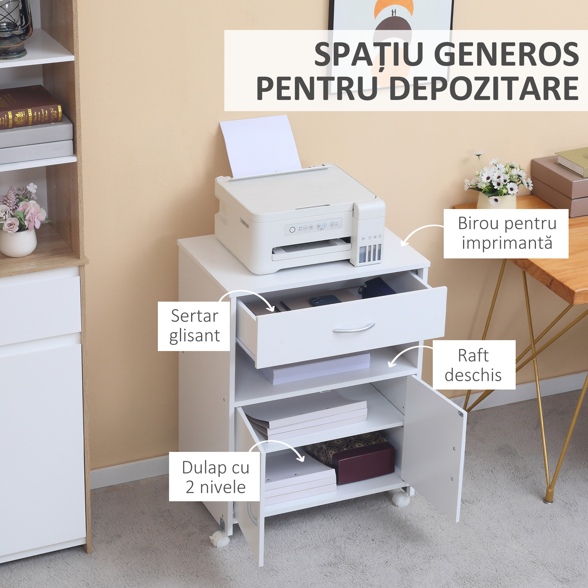 Organizeaza-ti eficient spatiul de lucru cu mobilierul [BRAND NAME] pentru imprimanta, dotat cu sertar, dulap si 4 roti pentru mobilitate. Ideal pentru birou sau home office, acest dulap imprimanta ofera spatiu de depozitare pentru documente, accesorii si echipamente. Designul alb modern se potriveste in orice decor, iar structura compacta optimizeaza spatiul. Solutia perfecta pentru organizare practica.