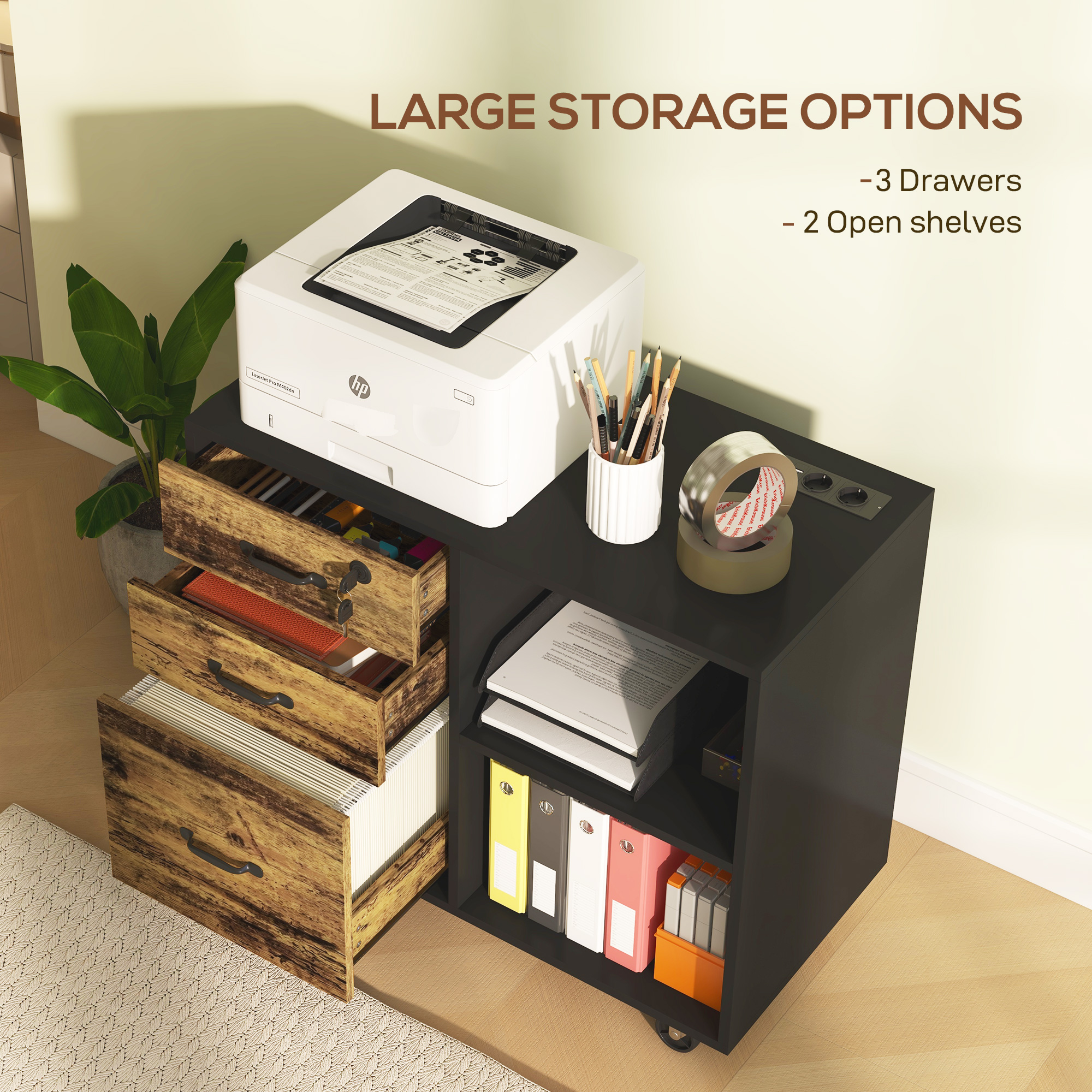 Gasiti comanda suprema pentru studio sau birou cu dulapul de imprimanta [BRAND NAME], astfel incat sa puteti avea tot ce aveti nevoie la indemana. Toate dispozitivele pot fi alimentate de prizele incorporate si porturile USB, in timp ce documentele vor fi protejate de sertarul superior care poate fi blocat. Acest dulap este un centru de productivitate versatil pe roti pentru a detine toate elementele esentiale ale muncii de birou.