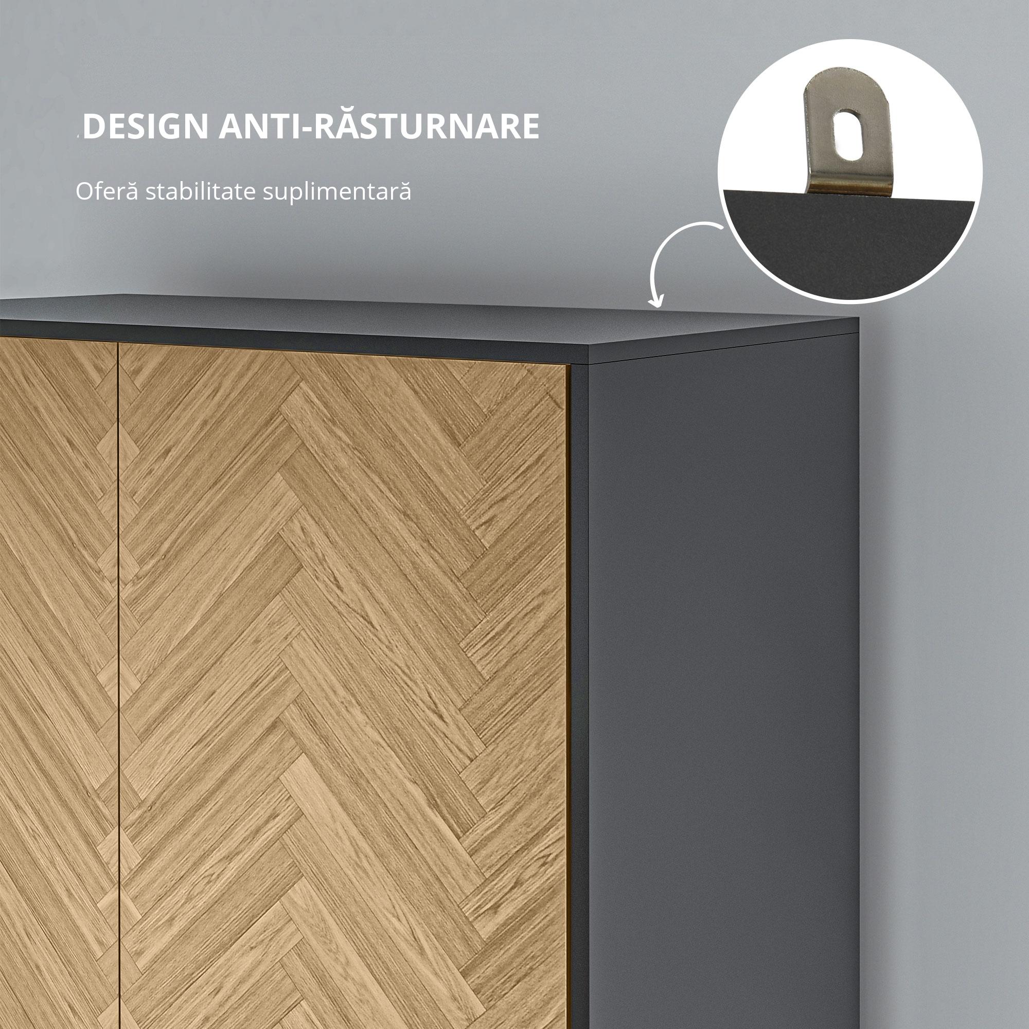 - DESIGN ELEGANT sI FUNCtIONAL: Culoarea gri inchis cu textura lemn ofera un aspect sofisticat, care se potriveste cu decoruri moderne. Usile laterale ascund functionalitati practice fara a incarca vizual spatiul.
