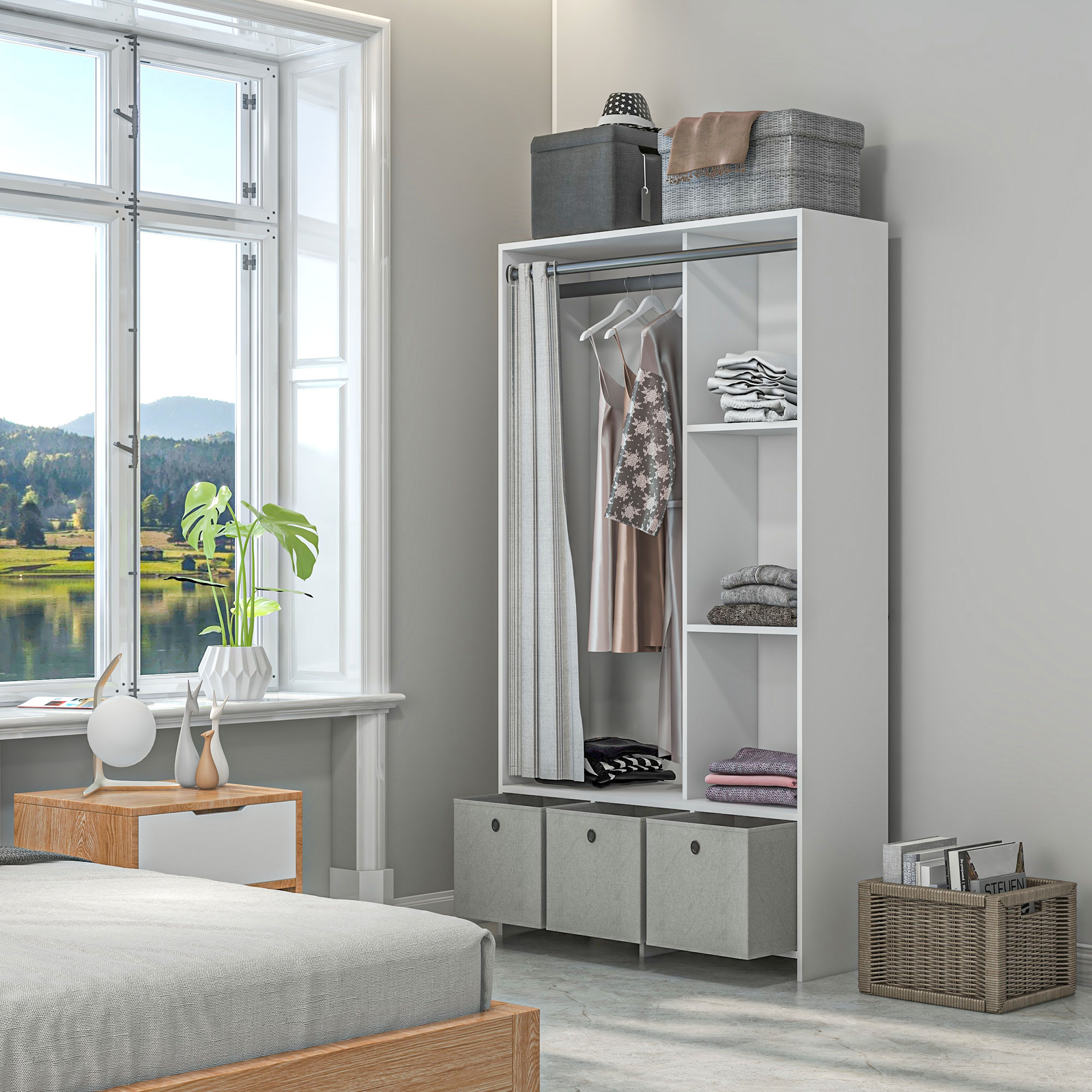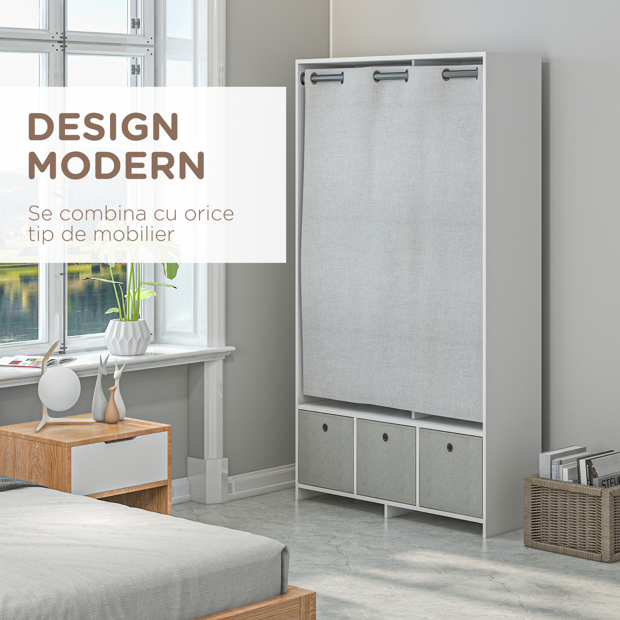 - SPAtIU GENEROS: Acest dulap de haine este echipat cu un suport pentru agatat paltoane, jachete si esarfe, si dispune de 3 rafturi largi si 3 sertare inferioare pentru alte obiecte si imbracaminte. De asemenea, cortina inclusa protejeaza hainele de praf si le mentine bine ascunse.