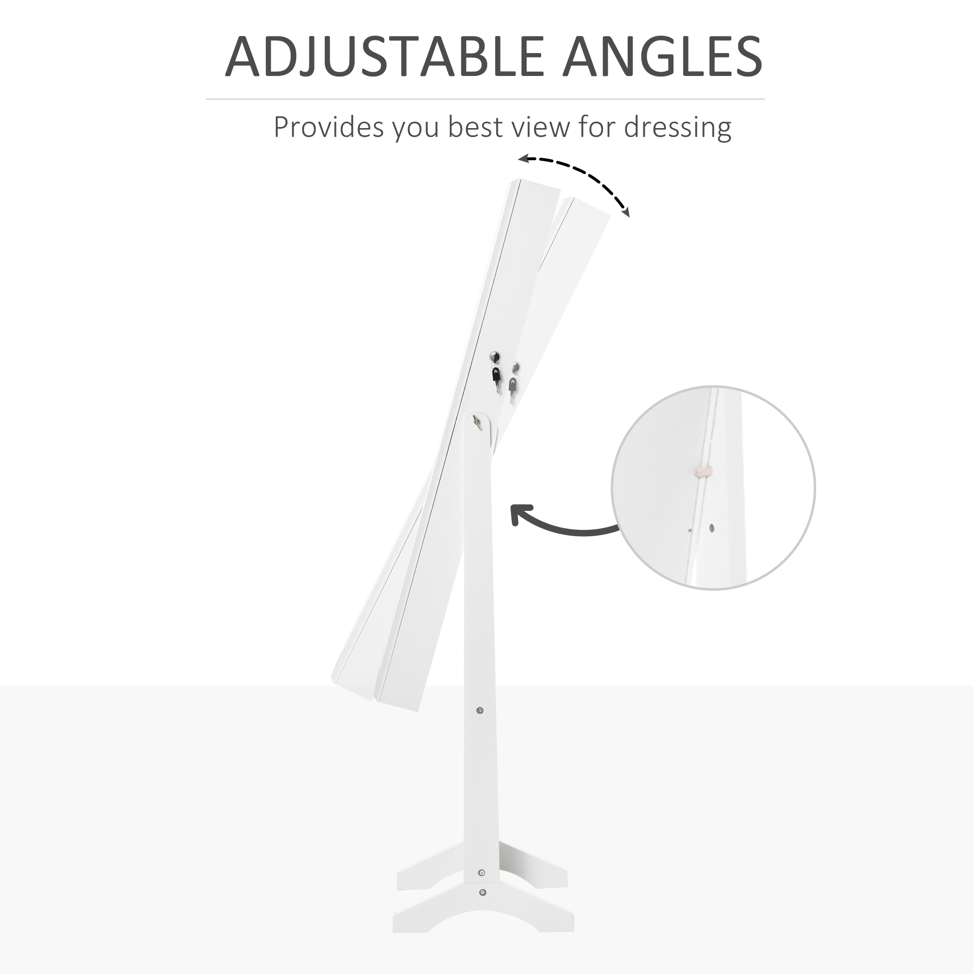 Organizeaza bijuteriile, parfumurile, machiajul si accesoriile cu dulapul portbijuterii [BRAND NAME]. Dotat cu o oglinda intreaga reglabila pe trei unghiuri, asigura o vedere perfecta asupra tinutei tale. La interior ofera 100 de sloturi pentru cercei, un suport pentru bratari, 24 de carlige pentru coliere, 105 sloturi pentru inele si patru rafturi, un spatiu amplu pentru a avea totul ordonat. Oglinda portbijuterii are o baza stabila cu doua picioare si incuietoare cu cheie pentru a pastra totul in siguranta.