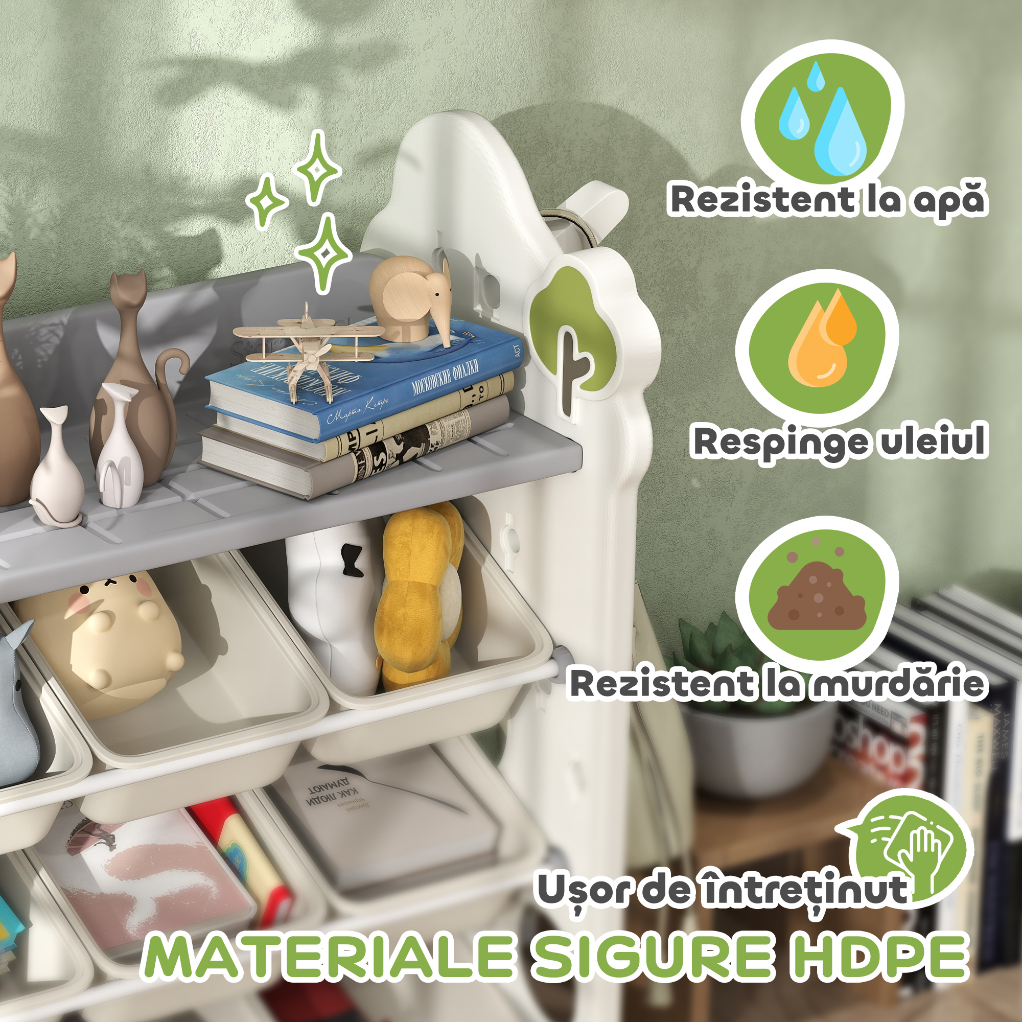 Ajuta-i pe cei mici sa descopere valoarea ordinii cu etajera pentru jucarii [BRAND NAME] pentru copii! Construita pe 4 niveluri, inclusiv un raft superior si 9 cutii, dulapul este perfect pentru organizarea jucariilor si cartilor intr-un singur spatiu. Structura din HDPE asigura o curatare rapida a lichidelor, facand intretinerea acestui mobilier o joaca de copii.