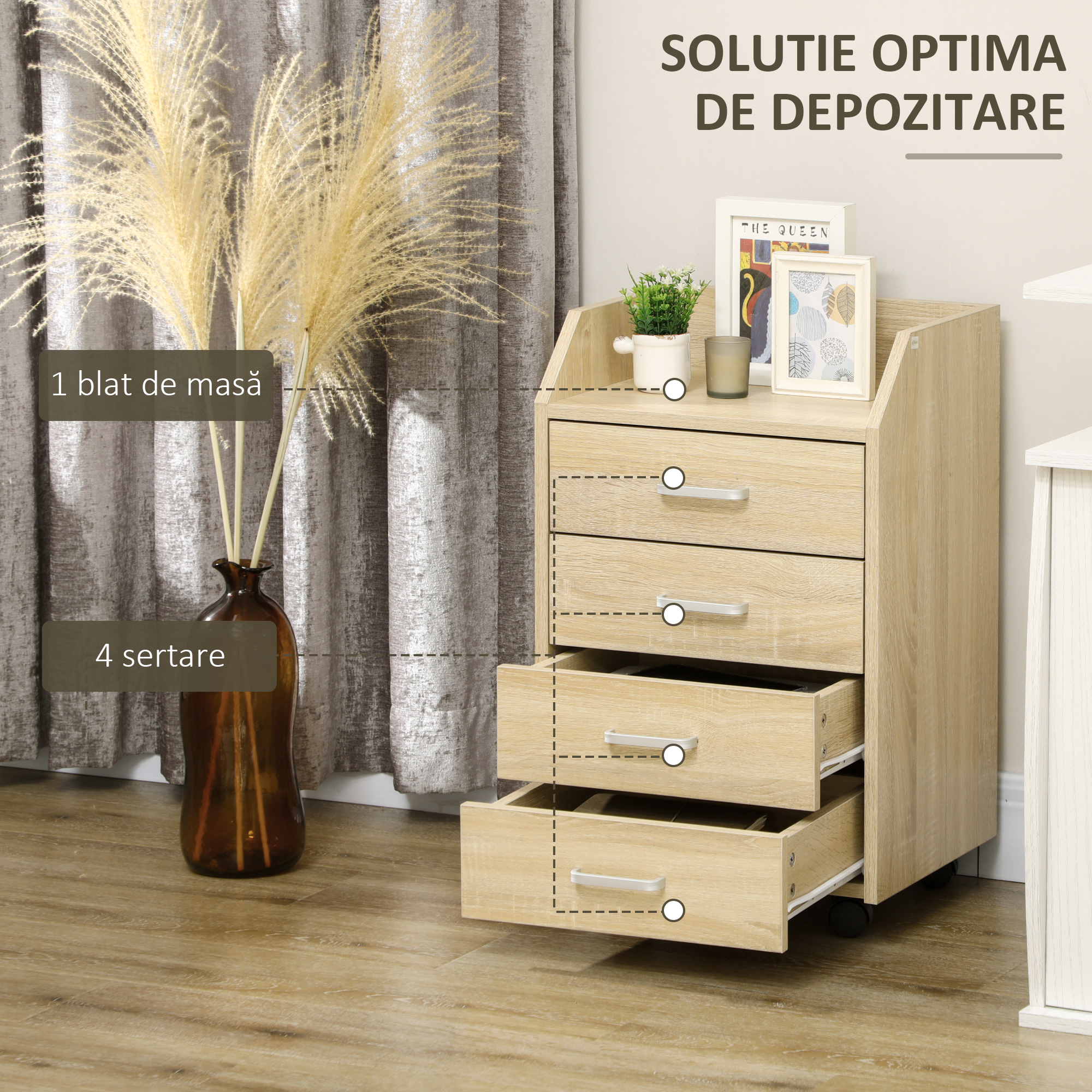 • USOR DE MUTAT: Fisetul cu sertare pentru birou este echipat cu 4 roti, dintre care 2 au frane pentru a-l mentine pe loc.
